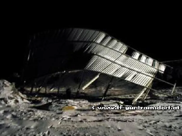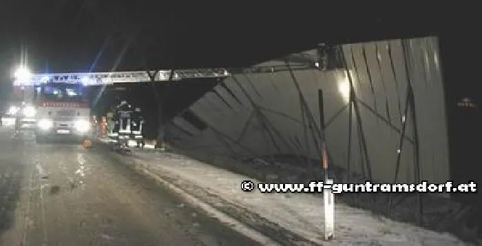 Unmittelbar nach unserer am Donnerstag üblichen Schulung wurden wir von der Gendarmerie verständigt, dass eine große Werbetafel unmittelbar neben der Südautobahn dem Wind nicht mehr standhalten dürfte und Teile auf die Autobahn stürzen könnten. Die Werbertafel war erst im Laufe des Tages errichtet worden und war dem Wind, der am Abend Spitzen von nur knapp mehr als 40 km/h auswies, nicht gewachsen.