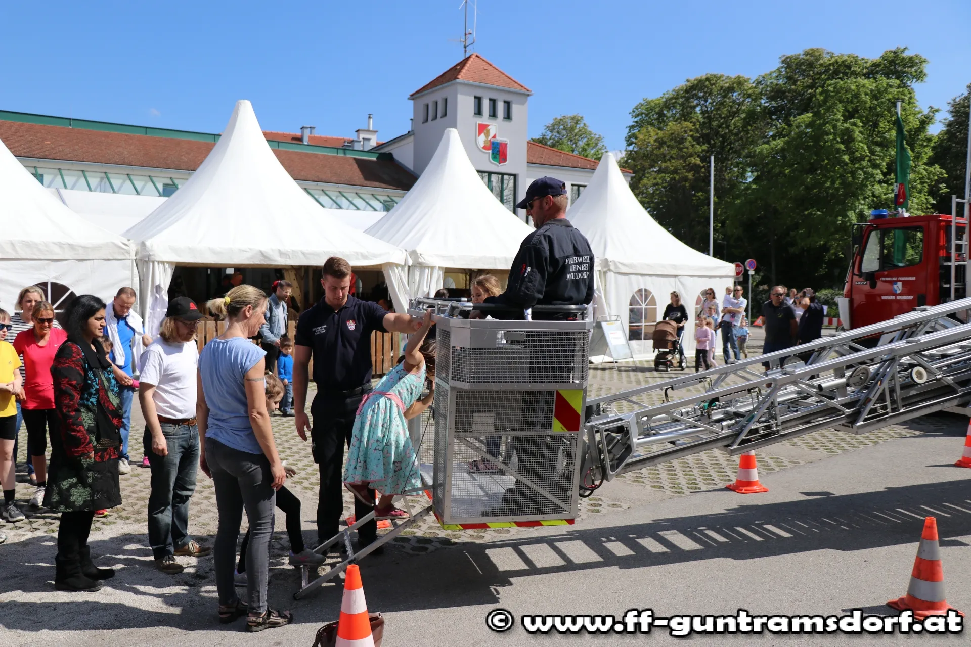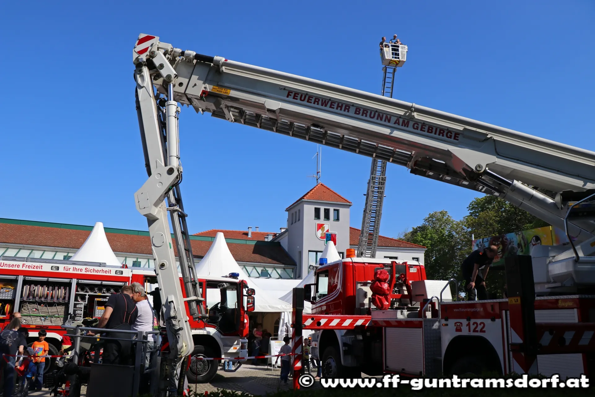 Ein besonderes Highlight war sicherlich die Fahrt mit einem der Hubrettungsgeräte (freundlicher Weise von der FF Wr. Neudorf und Brunn /Geb. zur Verfügung gestellt). So konnte man bei strahlendem Sonnenschein die Aussicht aus ca. 20 Metern nicht nur über das Festgelände sondern auch das Wiener Becken genießen.
