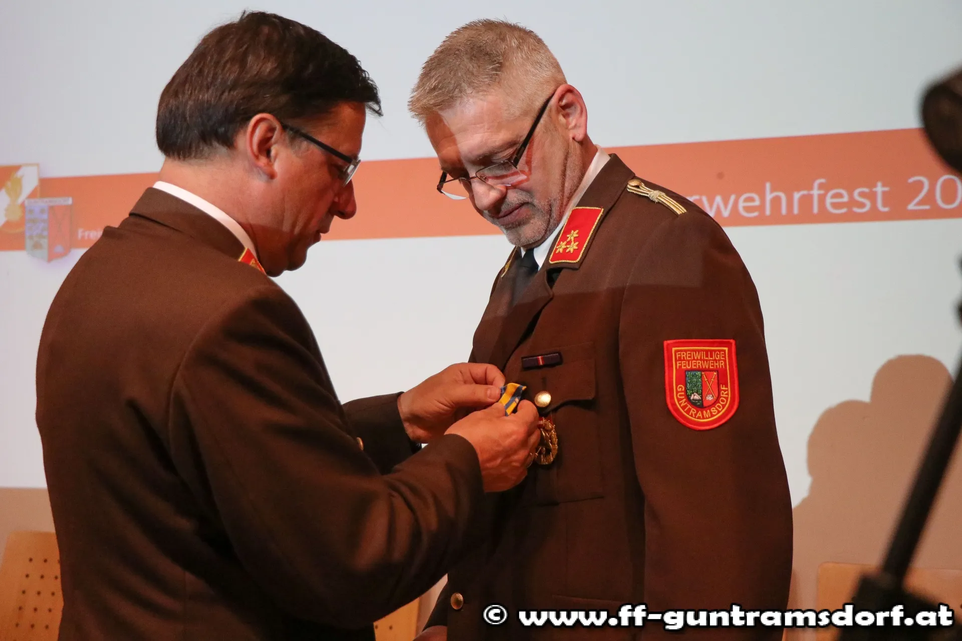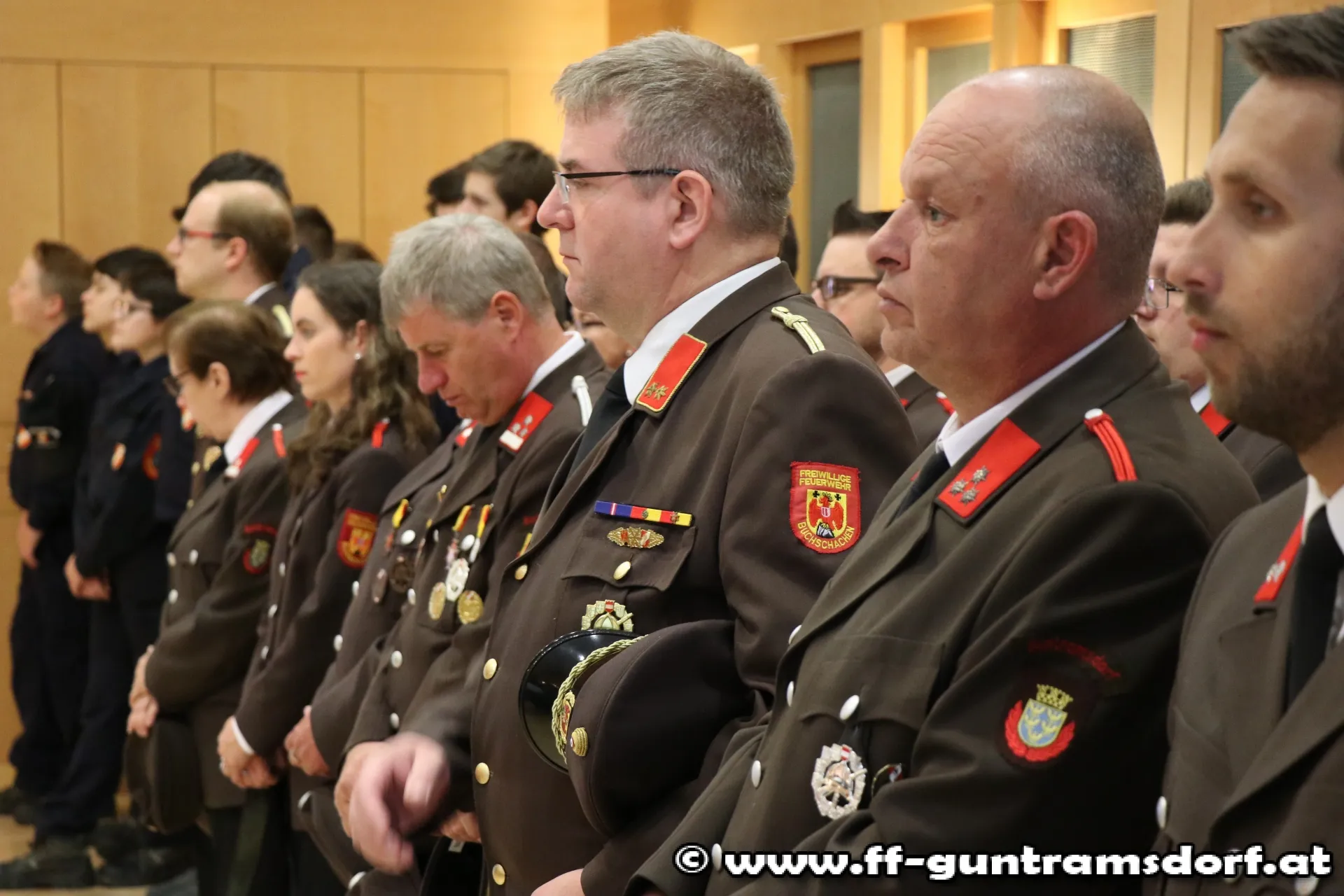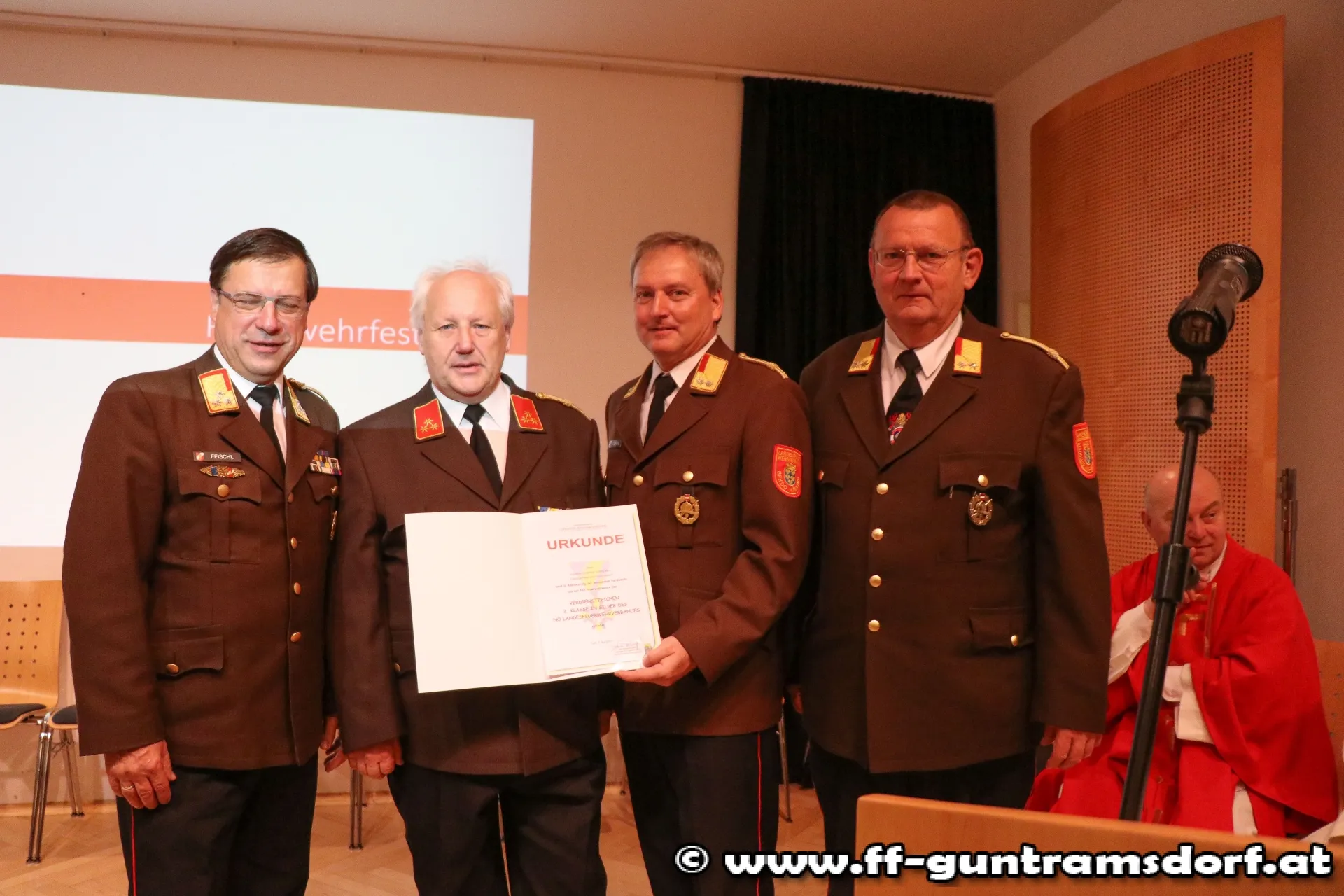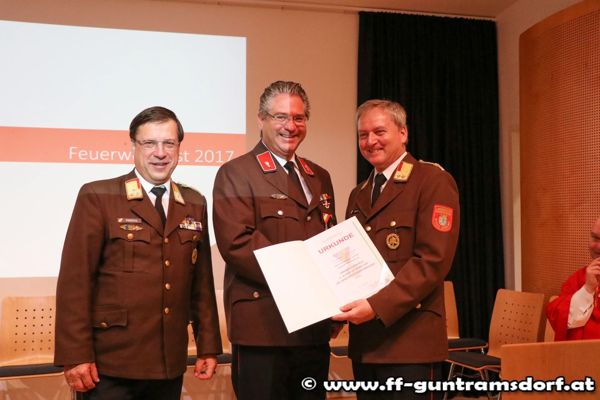 EhrungenBFKDT LFR Ing. Richard Feischl ging in seiner kurzen Ansprache auf die Schlagkraft der Freiwilligen Feuerwehren und die Neubeschaffung des Guntramsdorfer HLF 3 ein, bevor er mit BFKDTSTV BR Christian Giwiser folgende Ehrungen in Anerkennung der besonderen Verdienste um das NÖ Feuerwehrwesen vornahm: