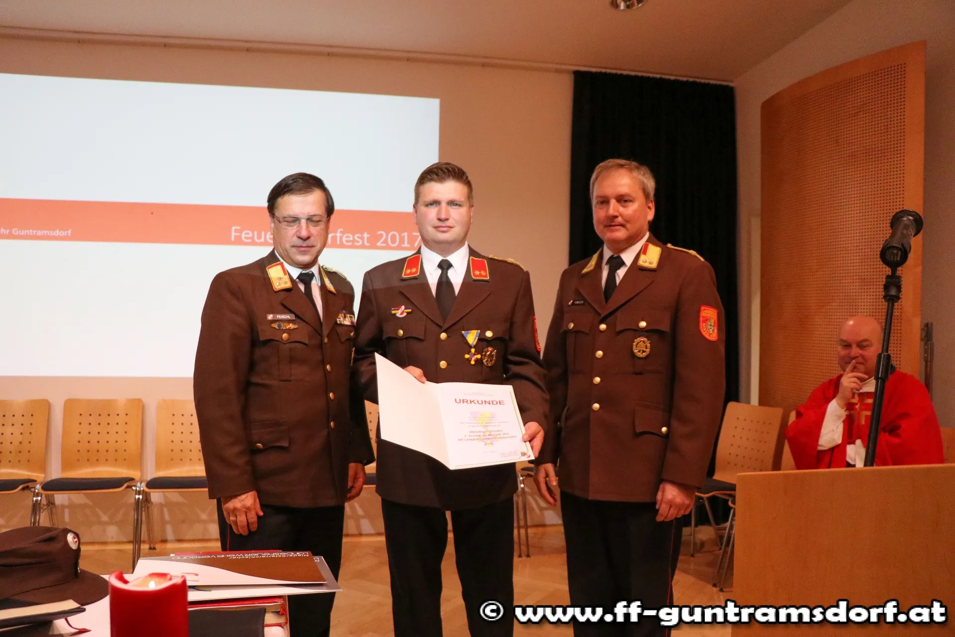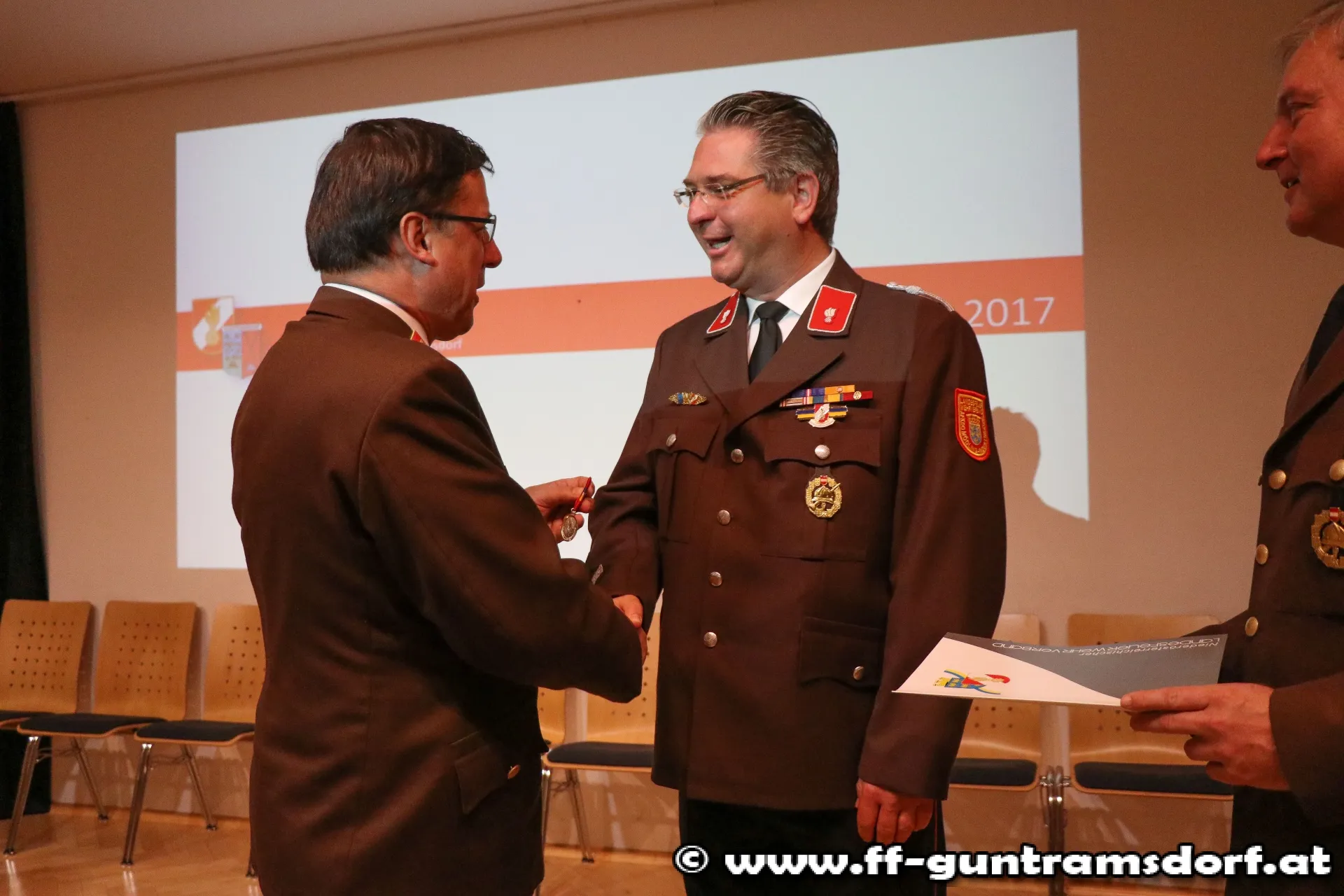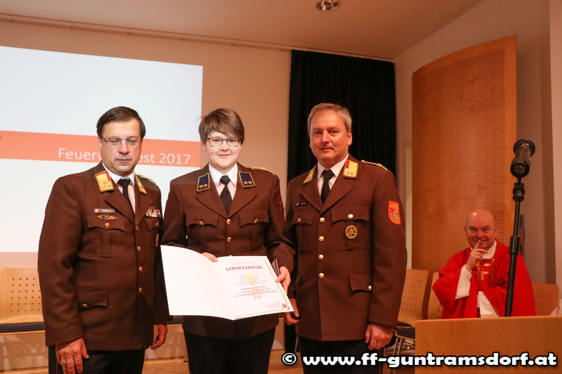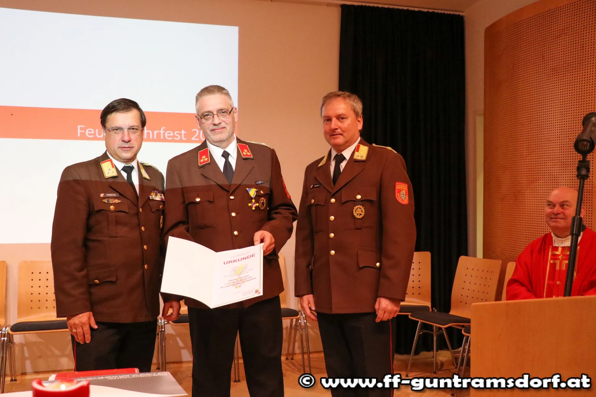 EhrungenBFKDT LFR Ing. Richard Feischl ging in seiner kurzen Ansprache auf die Schlagkraft der Freiwilligen Feuerwehren und die Neubeschaffung des Guntramsdorfer HLF 3 ein, bevor er mit BFKDTSTV BR Christian Giwiser folgende Ehrungen in Anerkennung der besonderen Verdienste um das NÖ Feuerwehrwesen vornahm: