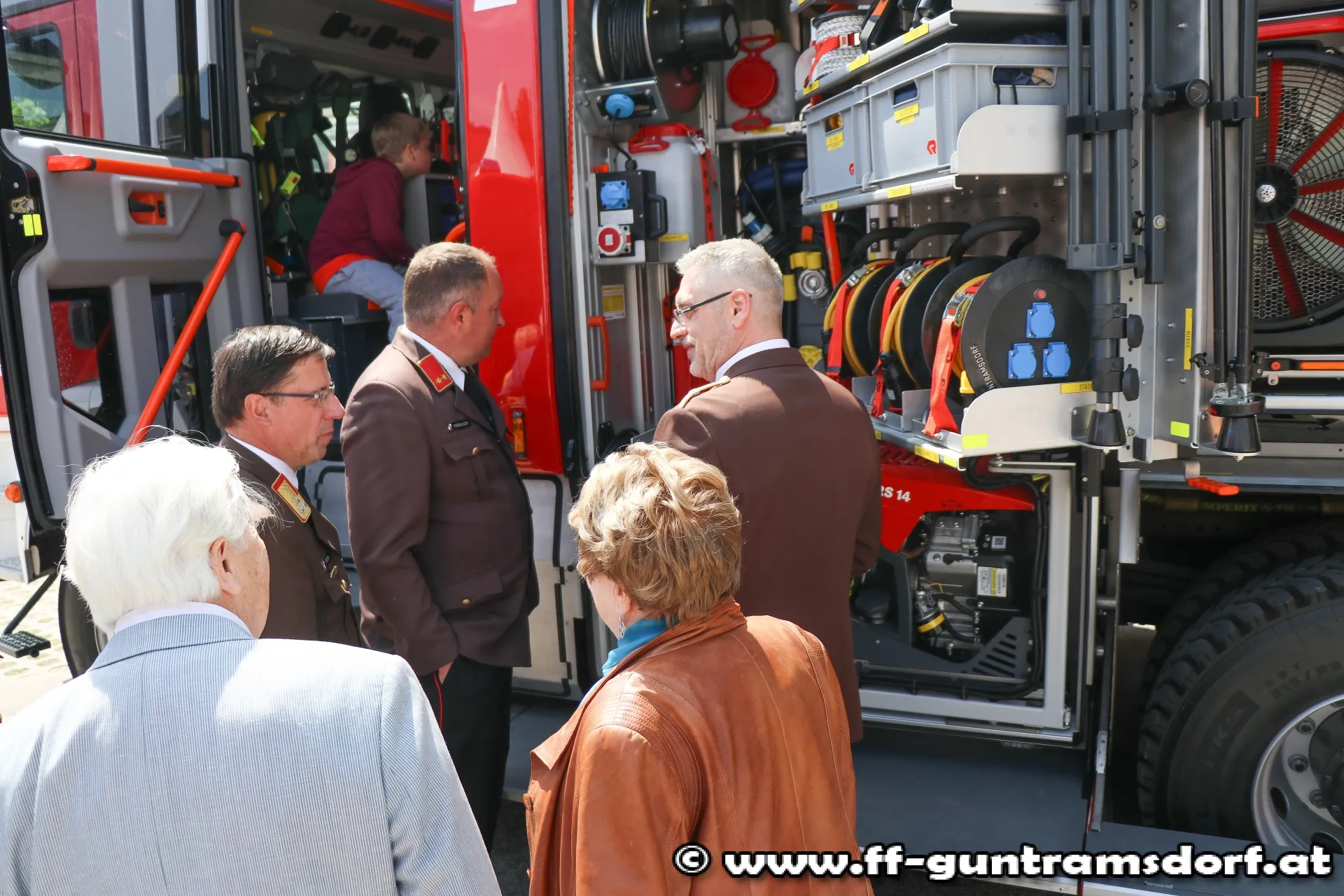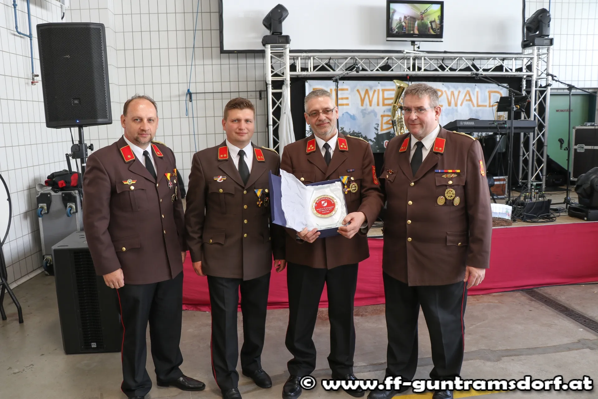 Während des Festbetriebes wurde das Kommando der FF Guntramsdorf vom Kommandanten der FF Buchschachen (Burgenland), OBI Roland Podlisca, und einer Abordnung seiner Wehr mit einer kleinen Aufmerksamkeit überrascht. Mit diesem Gastgeschenk beglückwünschte die FF Buchschachen unsere Feuerwehr zur Indienststellung des HLF 3.