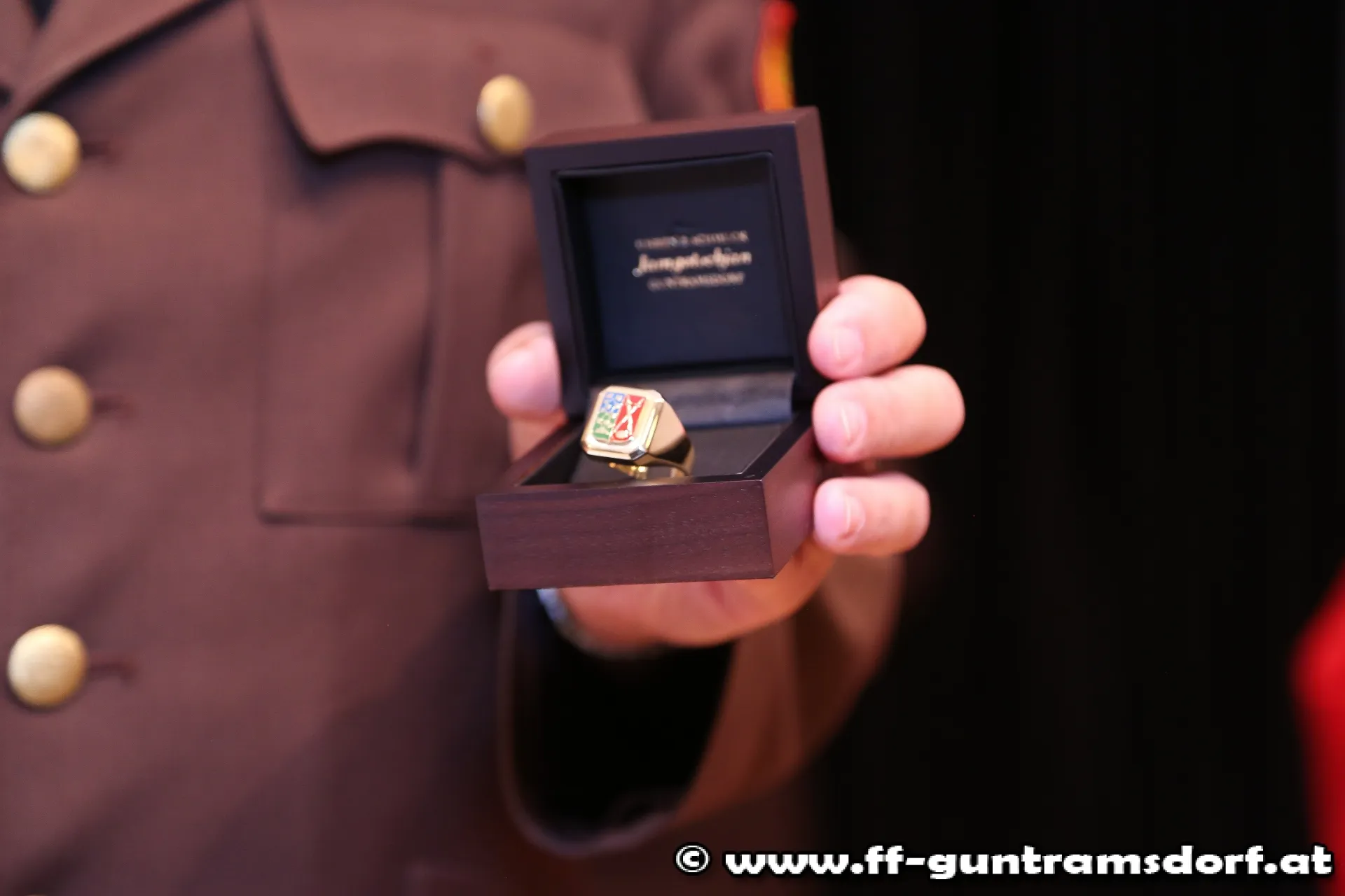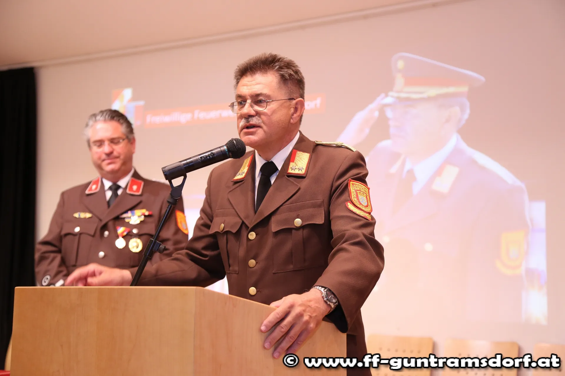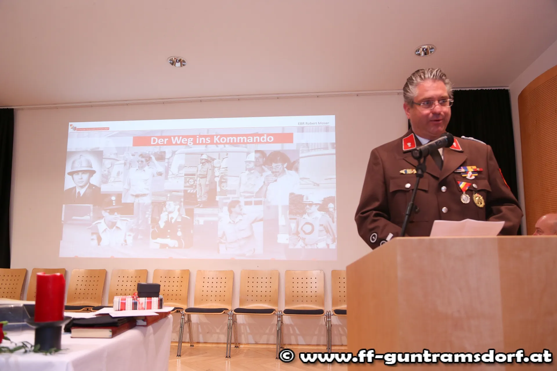 In seiner Laudatio geht Weber auf das „Feuerwehr Schaffenswerk“ von Moser ein, in dem er bis dato nicht weniger als 78 Lehrgänge bzw. Kurse absolvierte, Jahrzehnte als Kommandomitglied tätig war und zahlreiche Ehrungen und Auszeichnungen erhielt. EBR Moser bekam dafür den Ehrenring der Marktgemeinde Guntramsdorf überreicht.