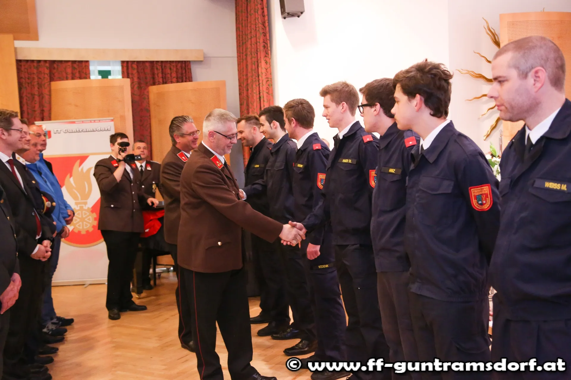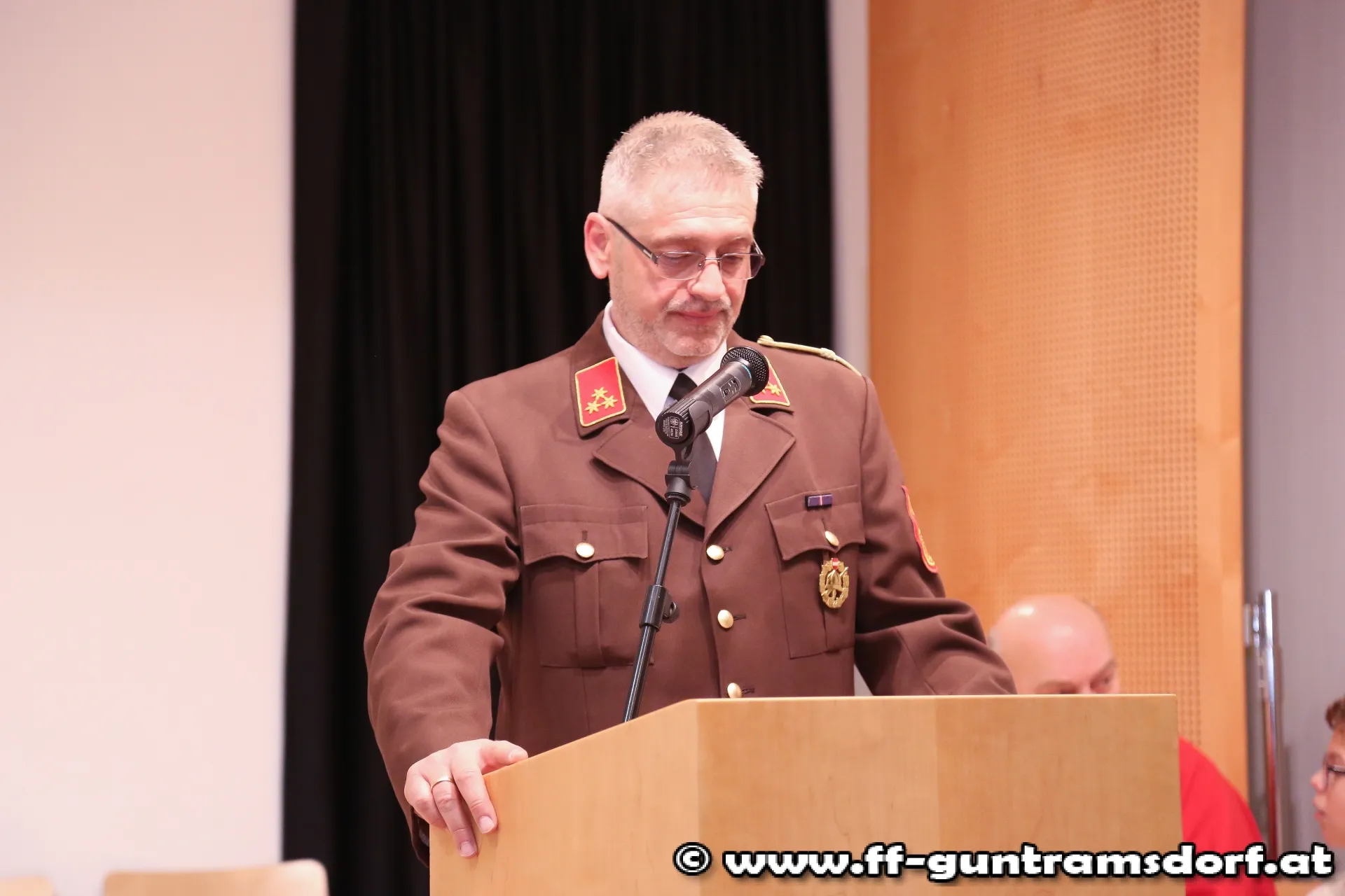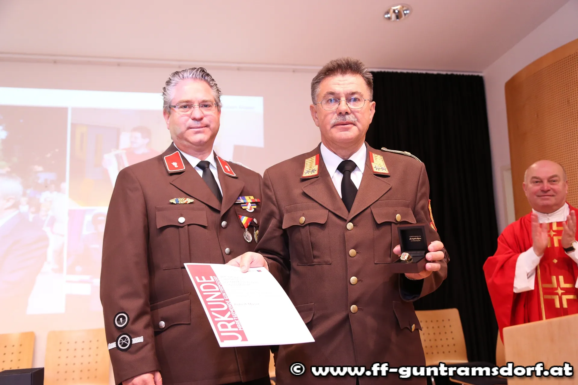 In seiner Laudatio geht Weber auf das „Feuerwehr Schaffenswerk“ von Moser ein, in dem er bis dato nicht weniger als 78 Lehrgänge bzw. Kurse absolvierte, Jahrzehnte als Kommandomitglied tätig war und zahlreiche Ehrungen und Auszeichnungen erhielt. EBR Moser bekam dafür den Ehrenring der Marktgemeinde Guntramsdorf überreicht.