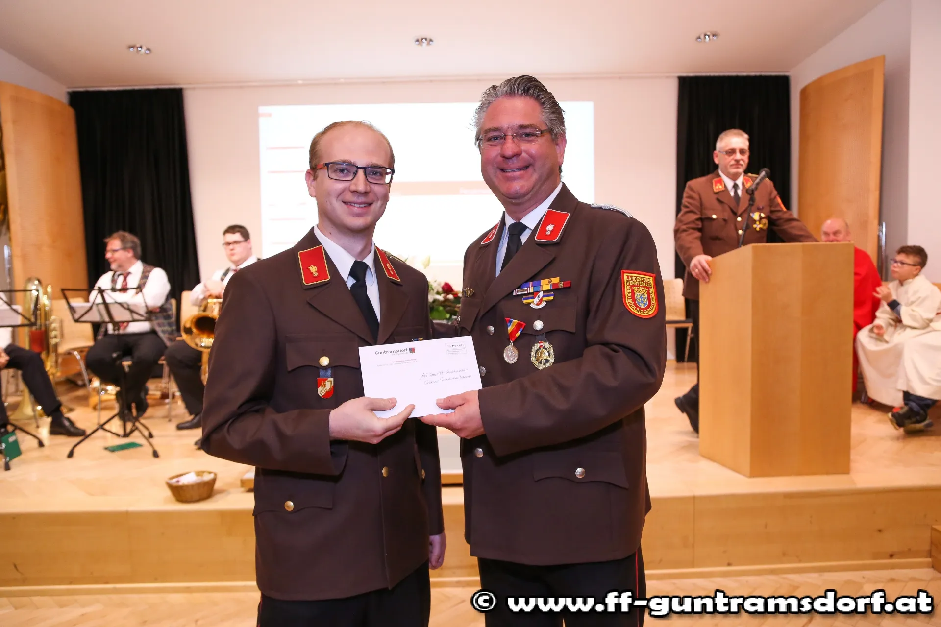 Im Anschluss übergab Weber im Namen vom 3. Präsidenten des NÖ Landtages, Franz Gartner, eine finanzielle Unterstützung in der Höhe von € 500,- aus einem Fond, an den Jugendbetreuer der FF Guntramsdorf, BSB Thomas Zazel.