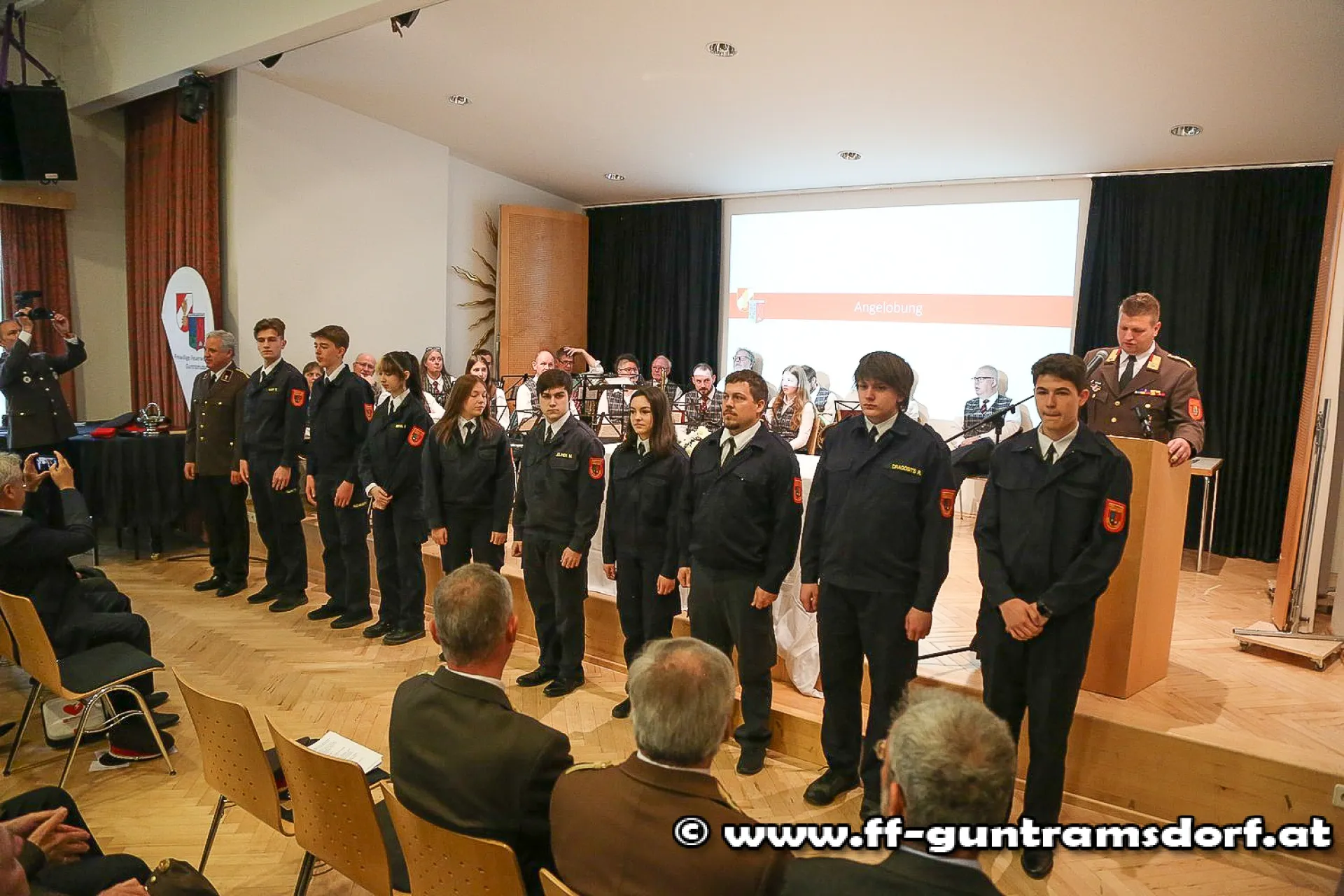 Es folgte die Angelobung neuer Feuerwehrmitglieder, welche von Kommandantstellvertreter Michael Schinko mit den bekannten Worten „Der Eintritt in die Feuerwehr ist ebenso freiwillig wie der Austritt, dazwischen liegt die Pflicht“ eingeleitet wurde.