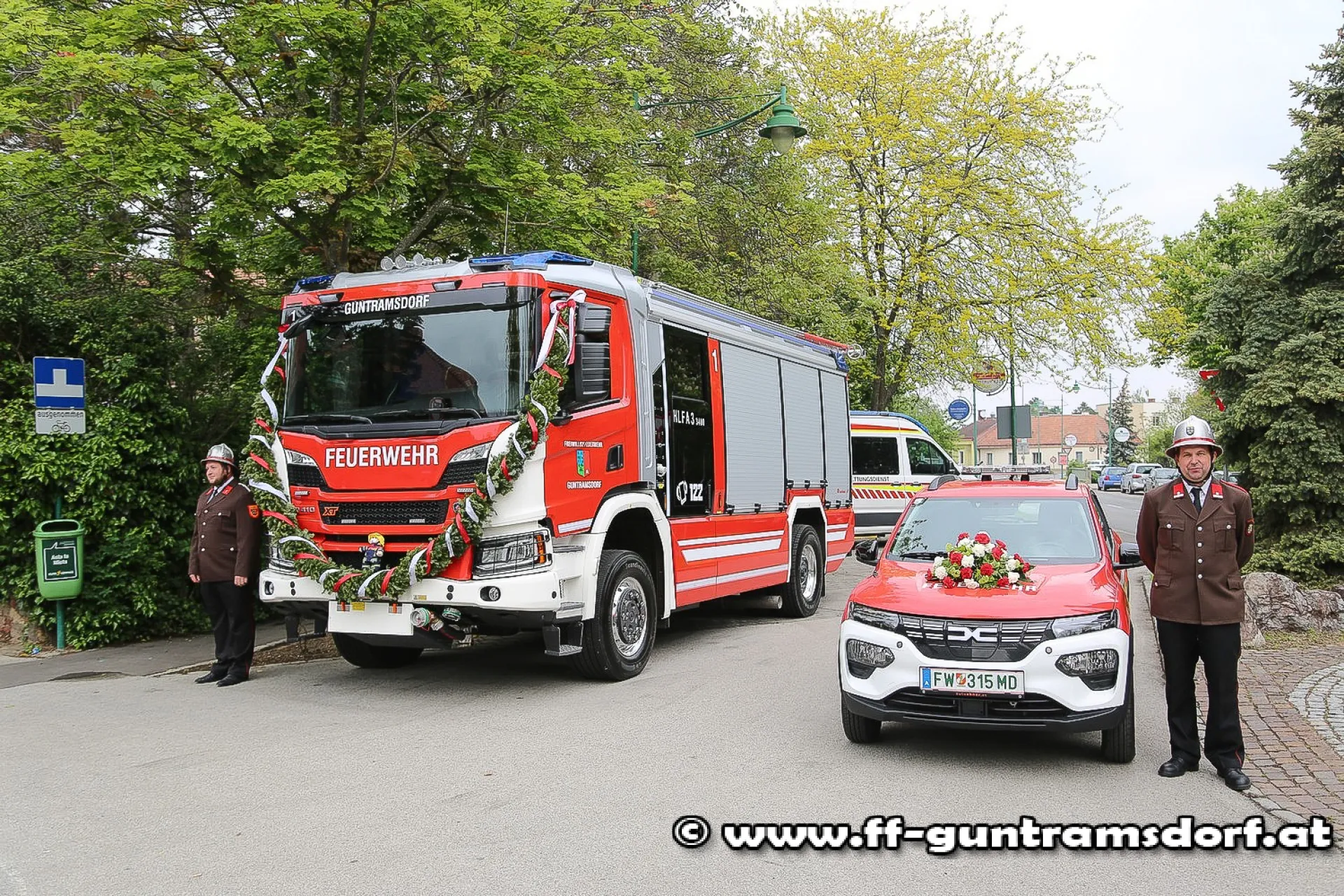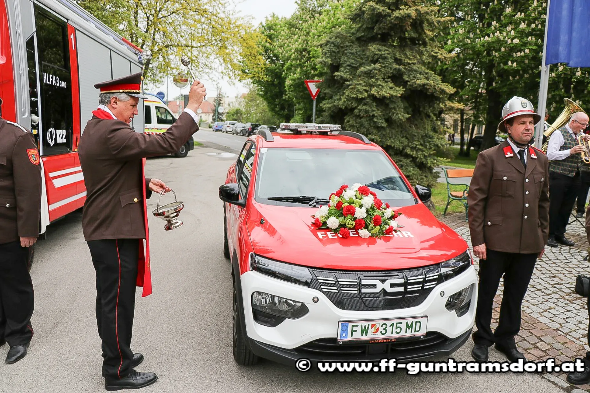 Zum Abschluss des Festaktes nahm Pfarrer Duarte Lima die Segnung der beiden neuen Feuerwehrfahrzeuge vor: Einerseits eine Elektrofahrzeug, das in erster Linie dem Bediensteten für seine Dienstfahrten dient, andererseits das „HLF3“, welches künftig als erstes Fahrzeug zu Brandeinsätzen ausrücken wird.
