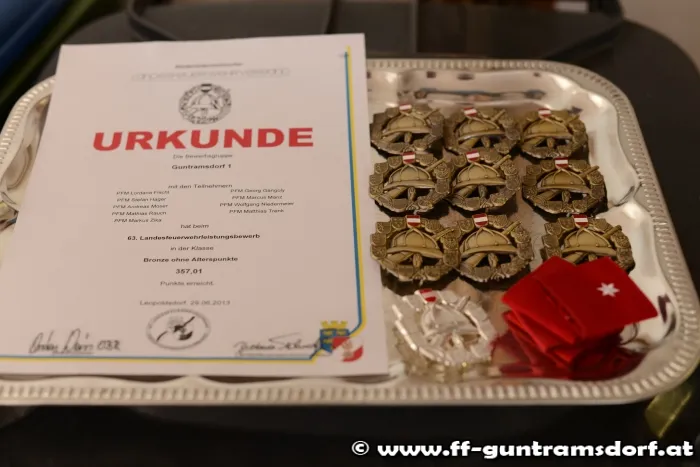 Die diesjährigen NÖ Landesfeuerwehrleistungsbewerbe fanden in Leopoldsdorf (Bezirk Gmünd) statt. Am Samstag ging es um 02:30 Uhr Früh für 39 Feuerwehrmitglieder auf Richtung Waldviertel. Kurz nach 6 Uhr traten bereits vier Gruppen für den Bewerb um das Feuerwehrleistungsabzeichen in Bronze an. Dieser besteht aus einem Löschangriff, welcher in einer gewissen Zeit, möglichst fehlerfrei absolviert werden muss und einem Staffellauf. Anschließend traten zwei Gruppen zum Bewerb in Silber an. Der Unterschied zum Bronzebewerb ist, dass die Positionen erst unmittelbar vor dem Bewerb gezogen werden.
