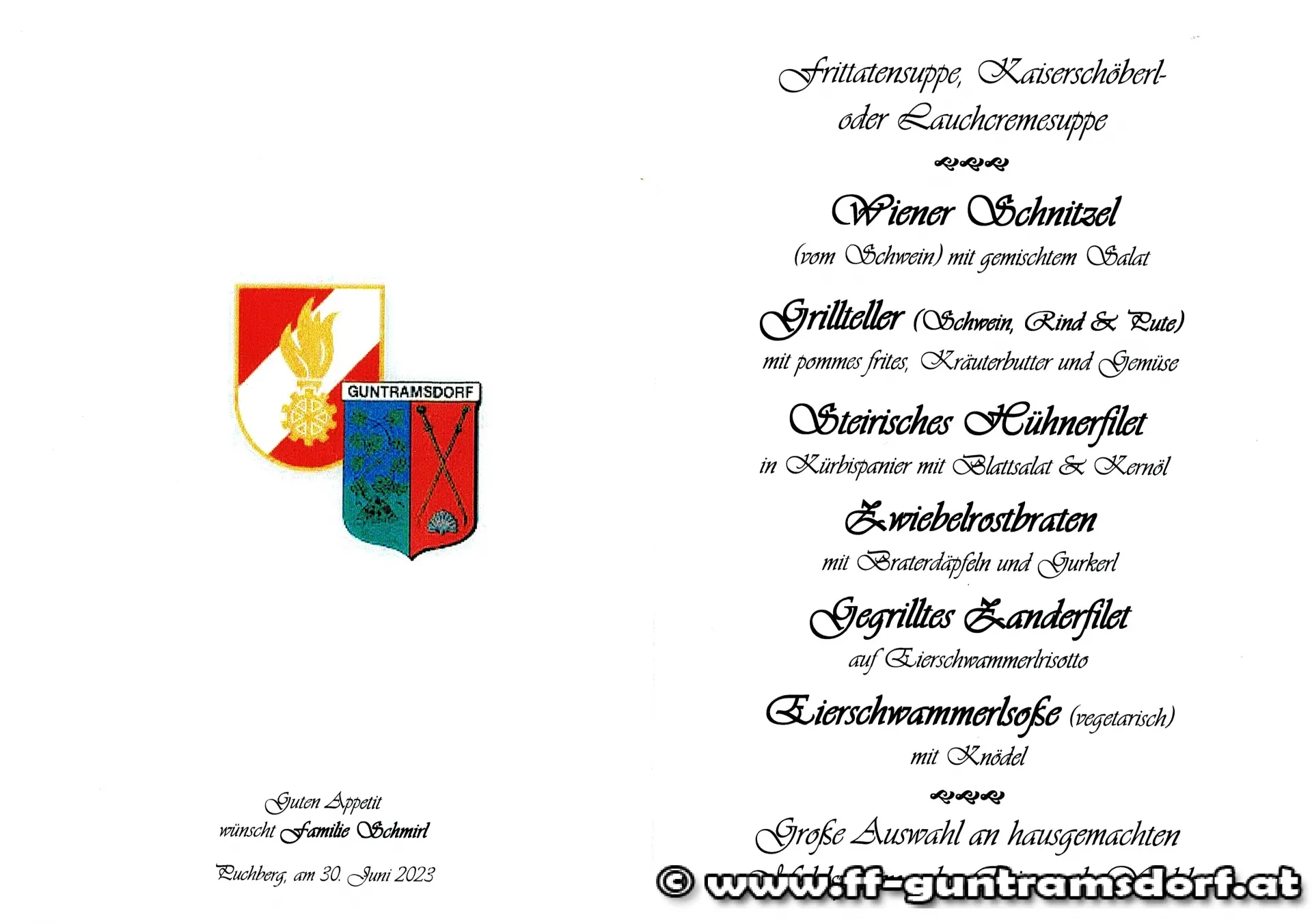 An dieser Stelle sei der Familie Schmirl, insbesondere der Wirtin Barbara Schmirl (geb. Willixhofer – ursprünglich eine Guntramsdorferin) für die tolle Gastfreundschaft und die hervorragende Verköstigung – sogar mit eigener Speisekarte (siehe Foto) – herzlich gedankt!