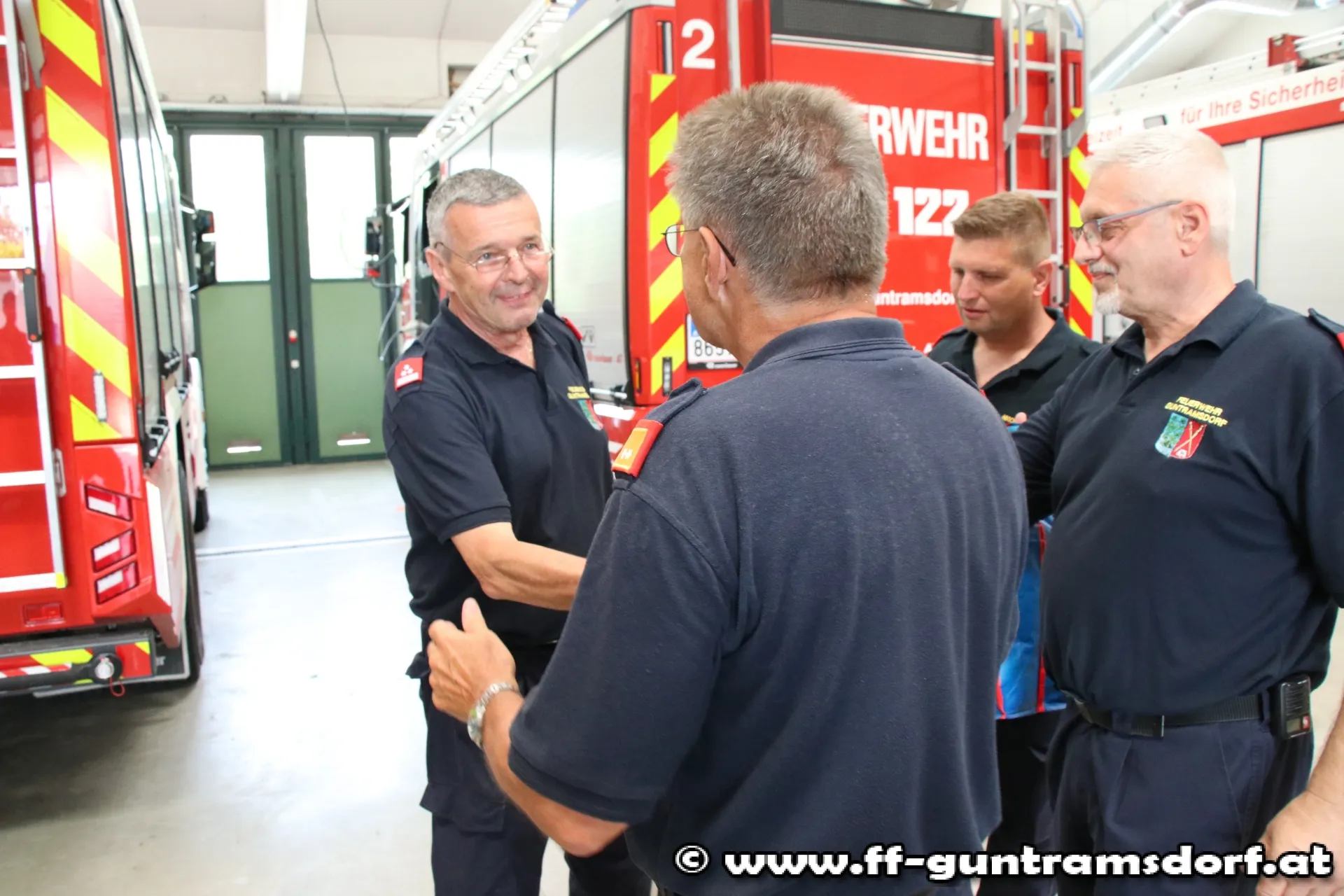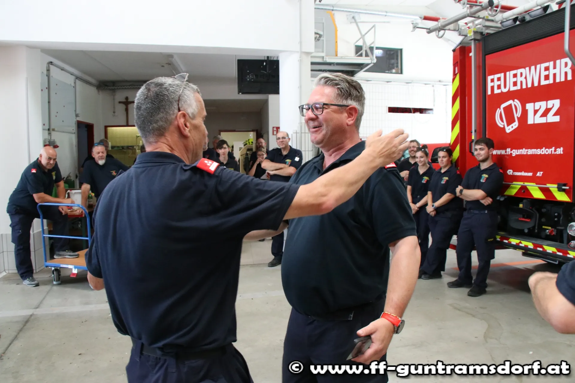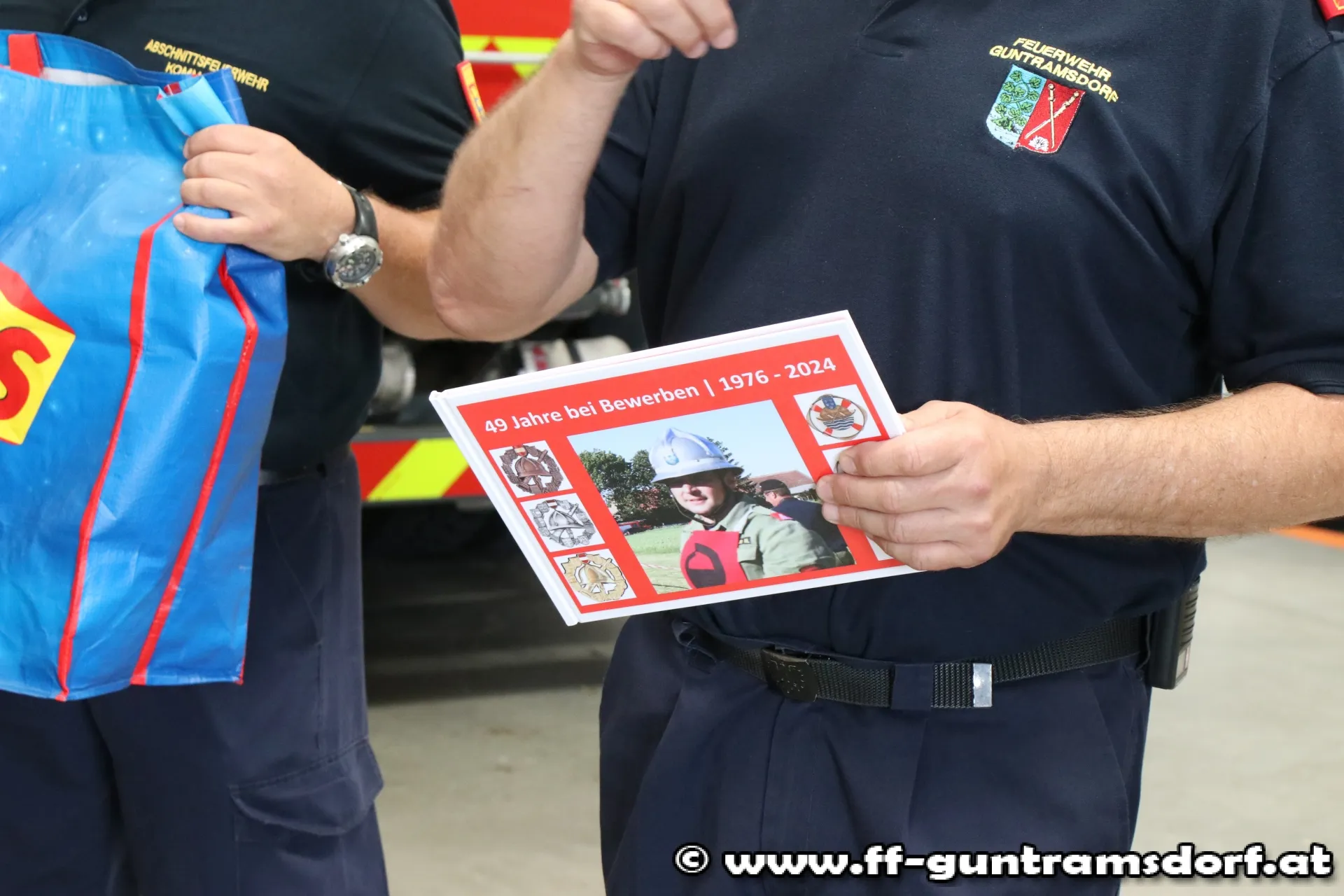 Hansjörg hat nicht nur jährlich selbst an den Bewerben teilgenommen, sondern auch als so genannter „Bewerbsdirektor“ jahrelang die Unterbringung, Verpflegung und das Rahmenprogramm für die Guntramsdorfer Teilnehmer organisiert. Kamerad und Bürgermeister Robert Weber, Altkommandant Rober Moser, Kommandant Roman Janisch und Kommandantstellvertreter Michael Schinko gratulierten Hansjörg Grossberger zu seinem „Bewerbslebenswerk“ und überreichten ihm anlassbezogene Erinnerungen. //ah