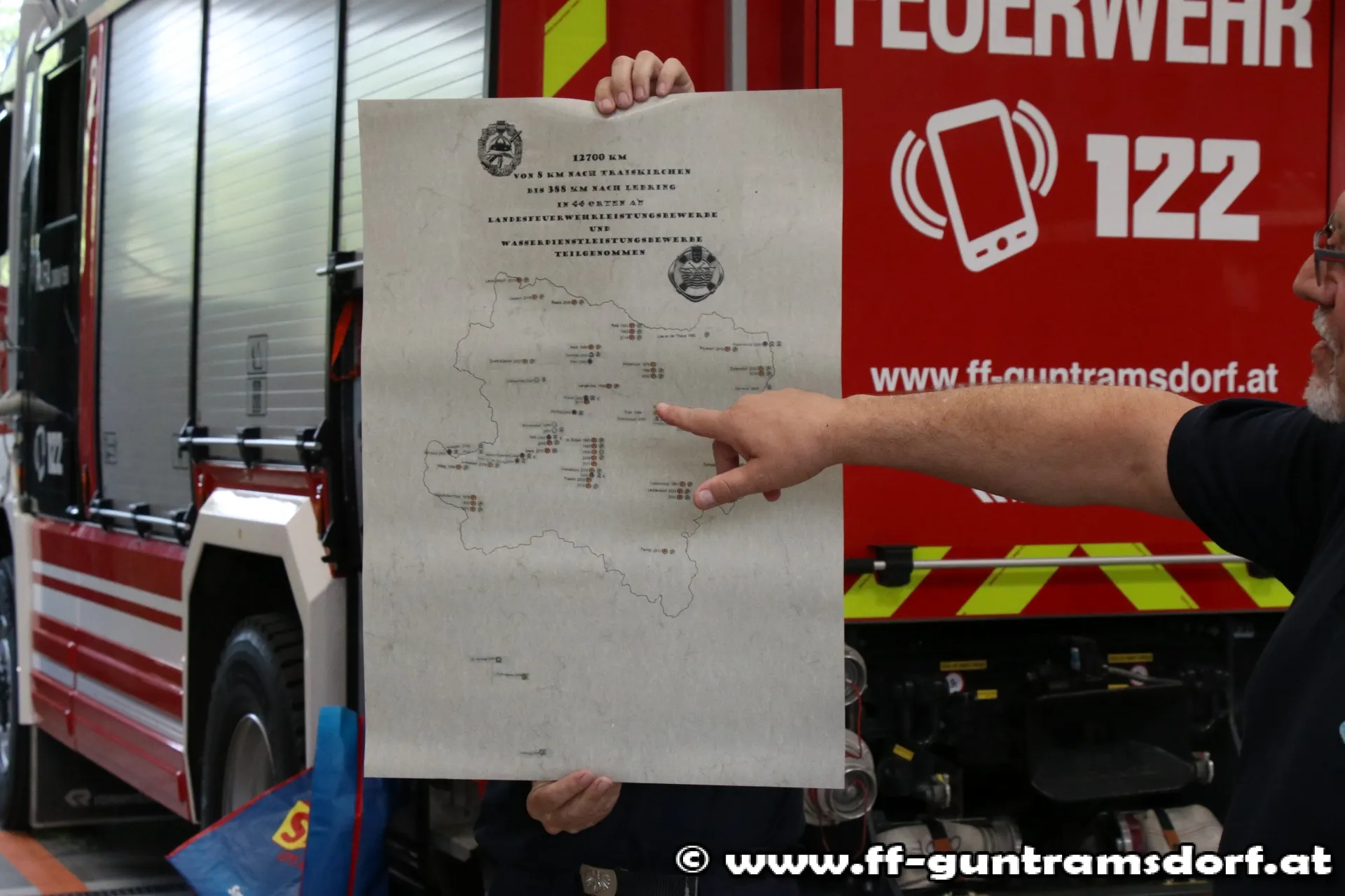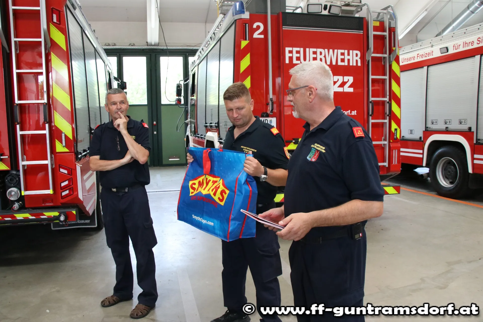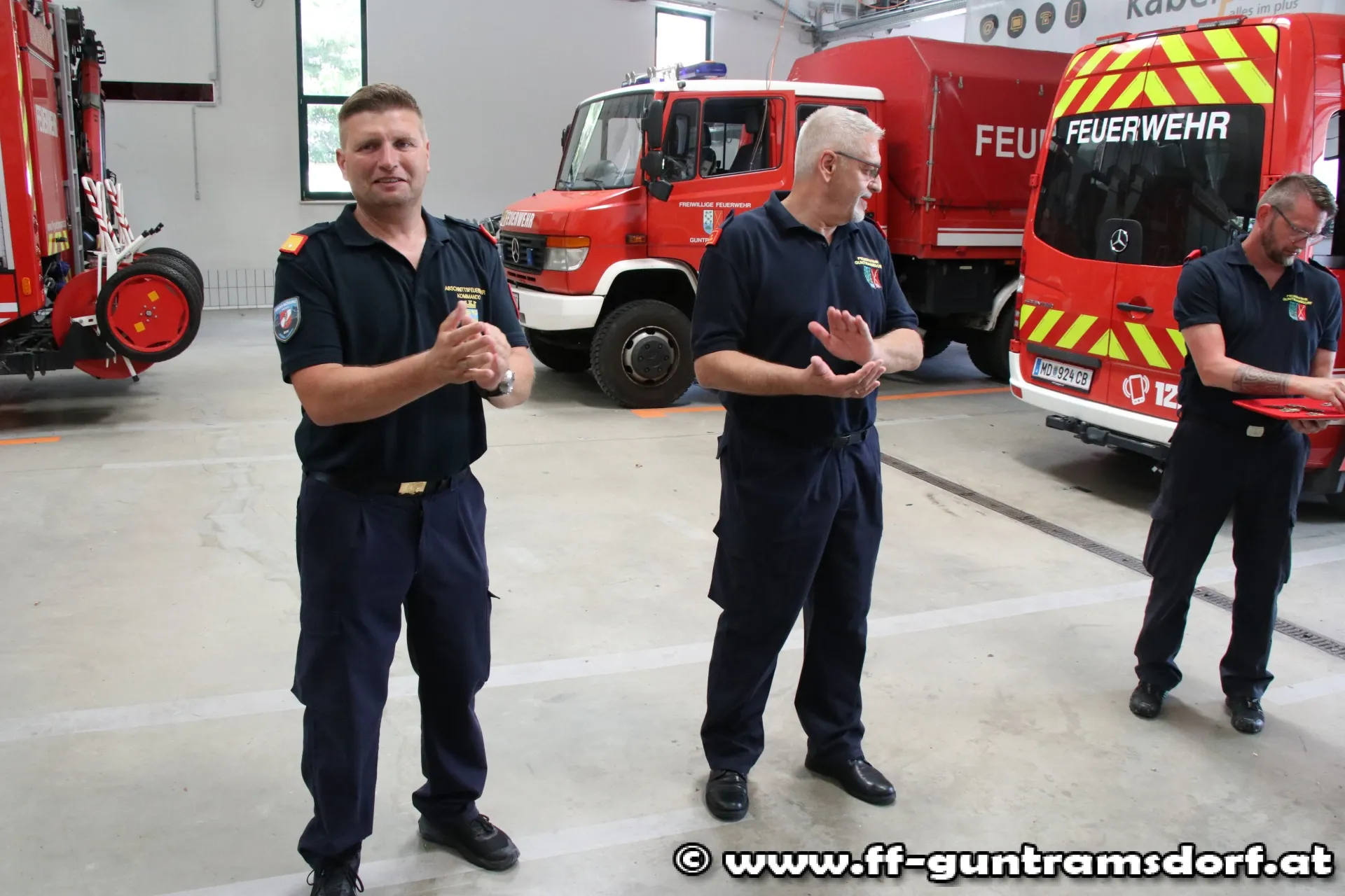Hansjörg hat nicht nur jährlich selbst an den Bewerben teilgenommen, sondern auch als so genannter „Bewerbsdirektor“ jahrelang die Unterbringung, Verpflegung und das Rahmenprogramm für die Guntramsdorfer Teilnehmer organisiert. Kamerad und Bürgermeister Robert Weber, Altkommandant Rober Moser, Kommandant Roman Janisch und Kommandantstellvertreter Michael Schinko gratulierten Hansjörg Grossberger zu seinem „Bewerbslebenswerk“ und überreichten ihm anlassbezogene Erinnerungen. //ah