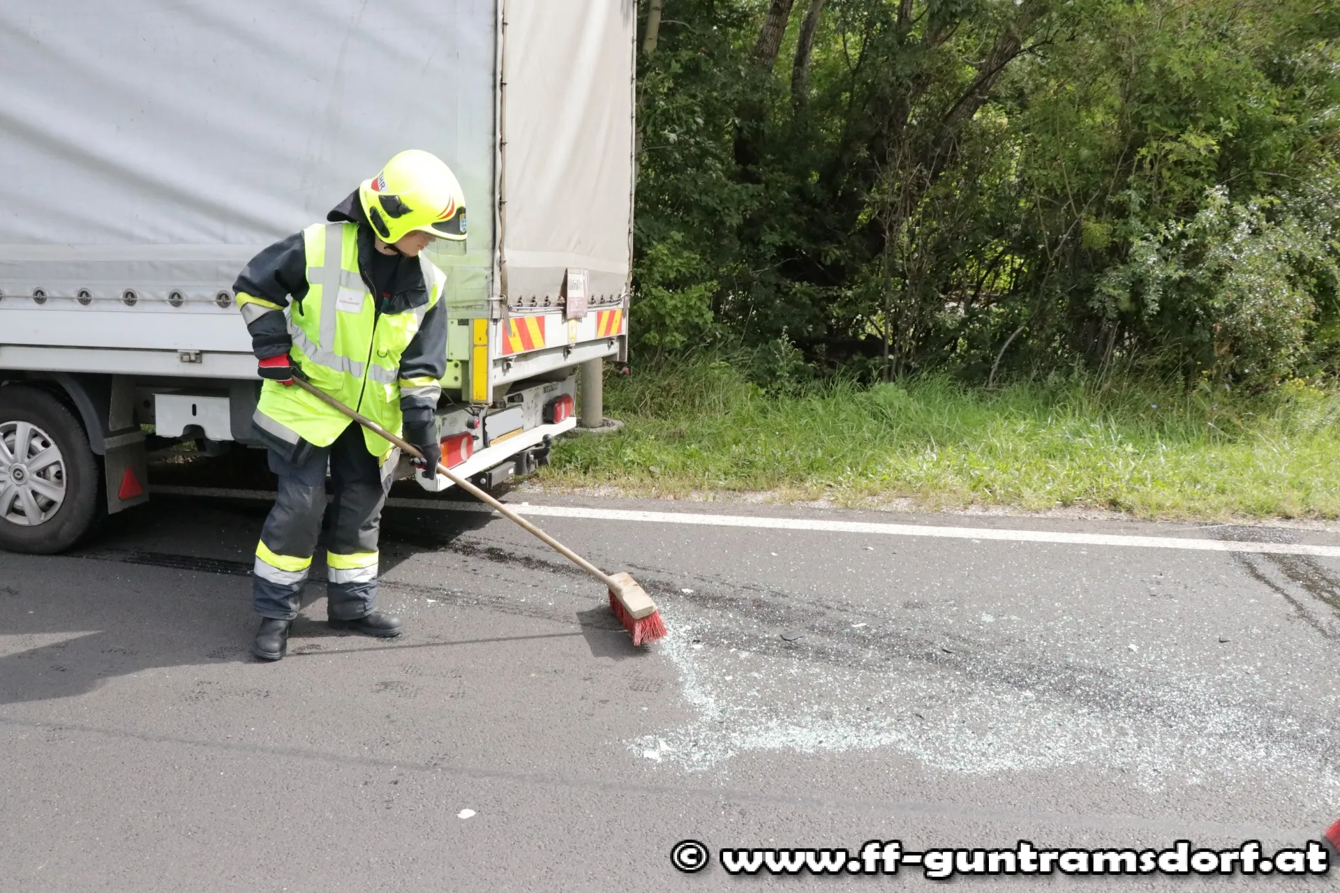 Ein Klein-LKW war auf der B17 in Neu-Guntramsdorf auf einen PKW aufgefahren. Der PKW war fahrfähig und konnte die Fahrt fortsetzen. Der beschädigte Klein-LKW wurde mit Hilfe der Abschleppbrille des Schweren Rüstfahrzeuges auf einen Parkplatz gebracht.