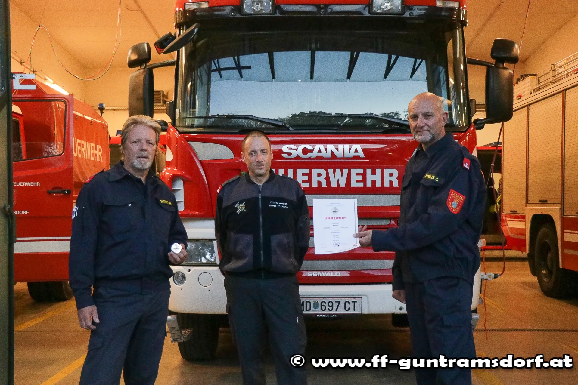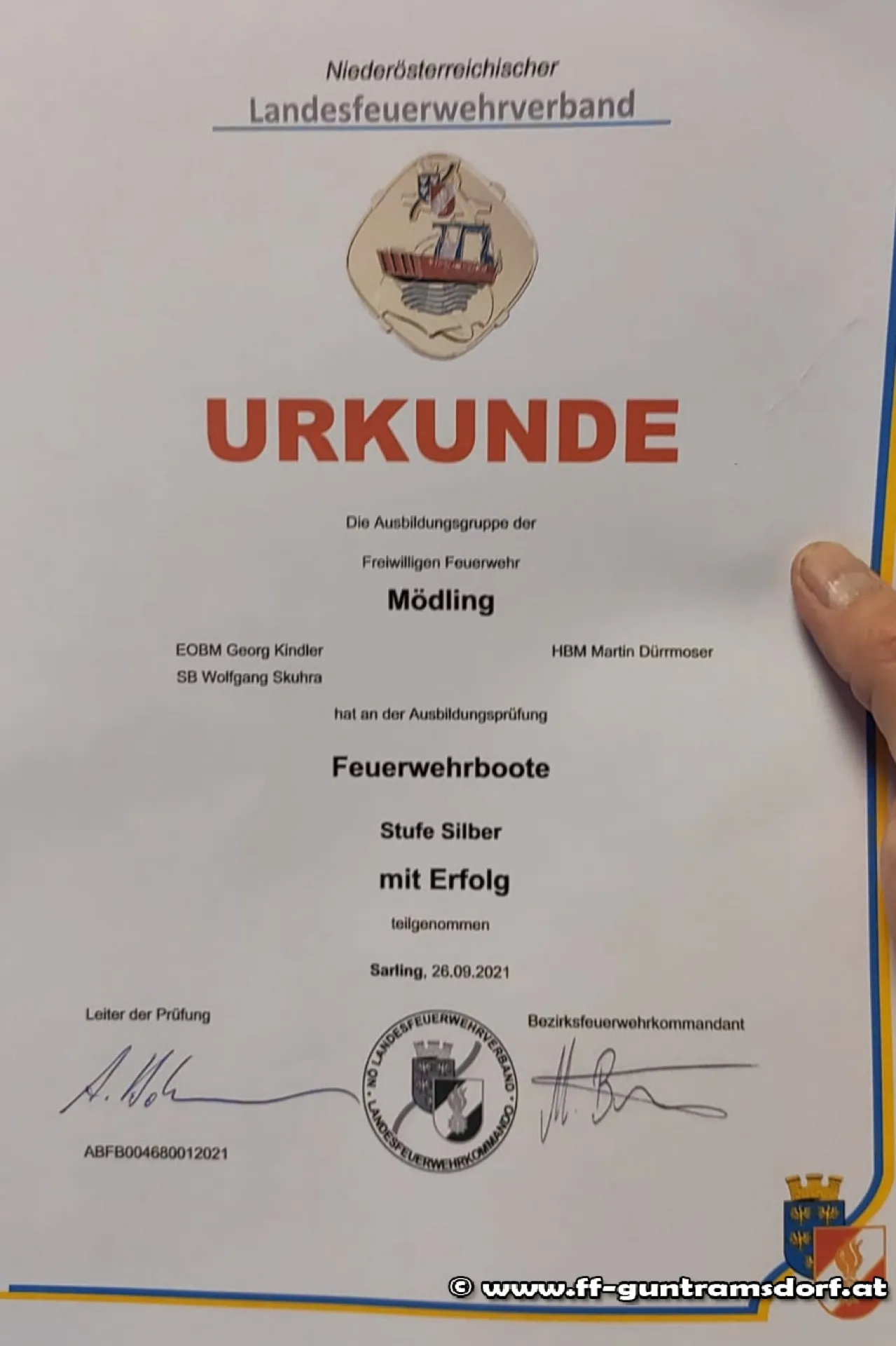Nach einer intensiven Schulung am Samstag, den 25.09.2021, absolvierten EOBM Georg Kindler und SB Wolfgang Skuhra am darauffolgenden Tag erfolgreich die Ausbildungsprüfung Feuerwehrboot (APFB) in Silber. Um die Mannschaft zu komplettieren, unterstützte uns HBM Martin Dürrmoser (absolvierte APFB Gold bereits 2018) von der Freiwilligen Feuerwehr Breitenfurt, ebenfalls aus dem Bezirk Mödling.