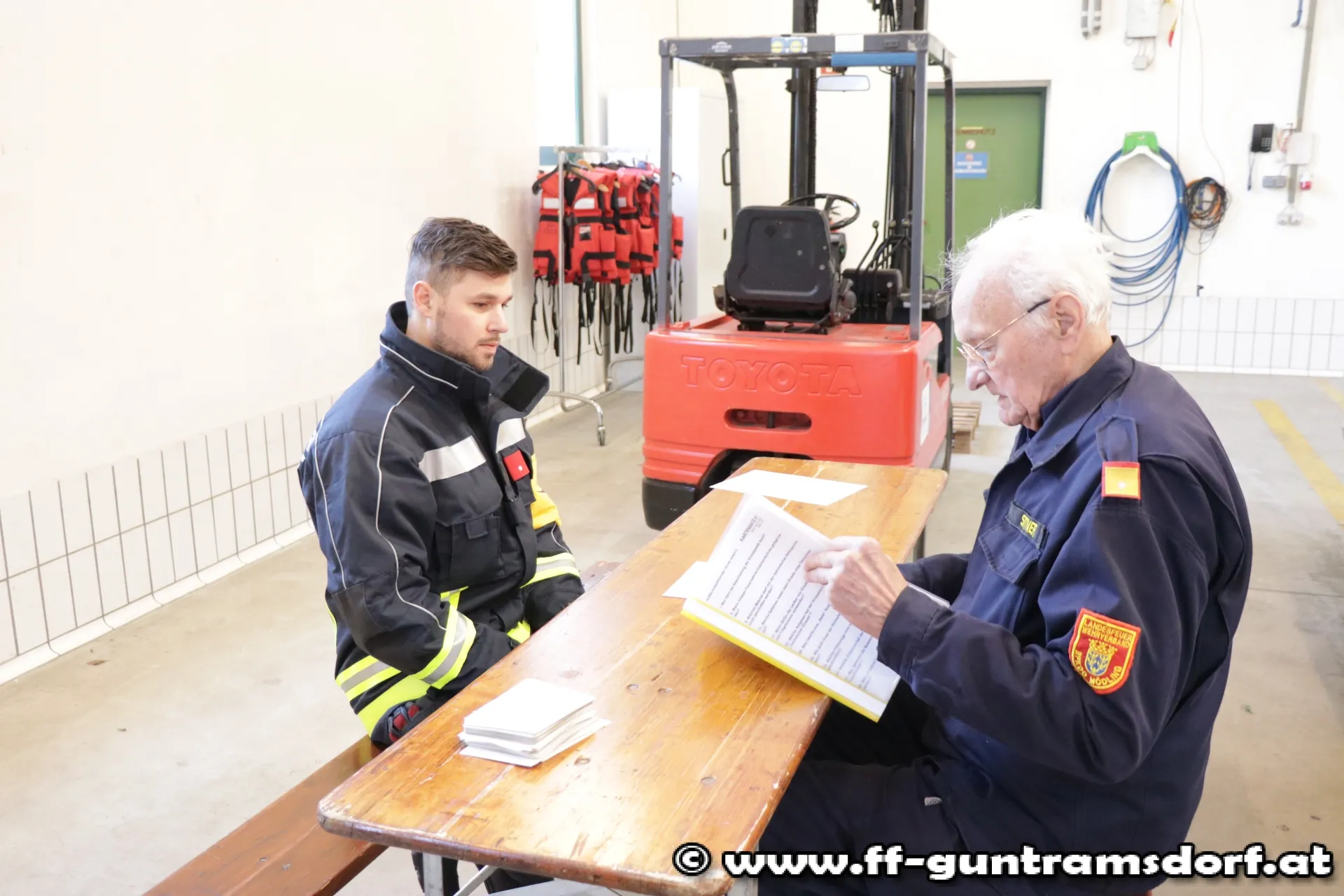 Beim theoretischen Teil der Prüfung geht es einerseits um das Vorzeigen diverser Erste- Hilfe-Maßnahmen, Gerätekunde, Fragen aus einem Fragenkatalog und spezielle Fragen an den Maschinisten. Bei der Gerätekunde muss jedes Mitglied aus einer Vielzahl von Gerätekärtchen (die nahezu alle im Fahrzeug befindlichen Geräte umfassen) zwei Kärtchen ziehen und dem Prüfer (bei geschlossenen Rollläden) zeigen, wo dieses Gerät im Fahrzeug gelagert ist und dieses kurz erklären.