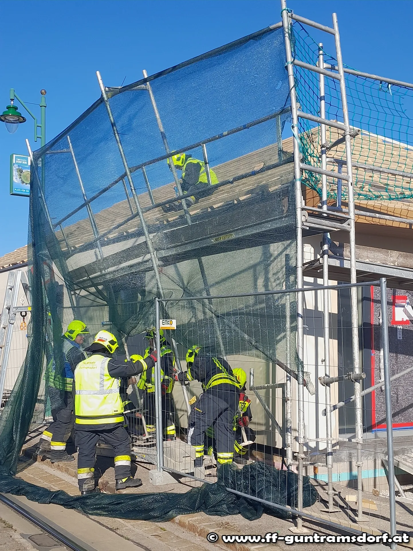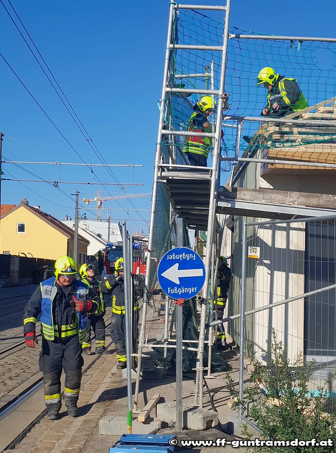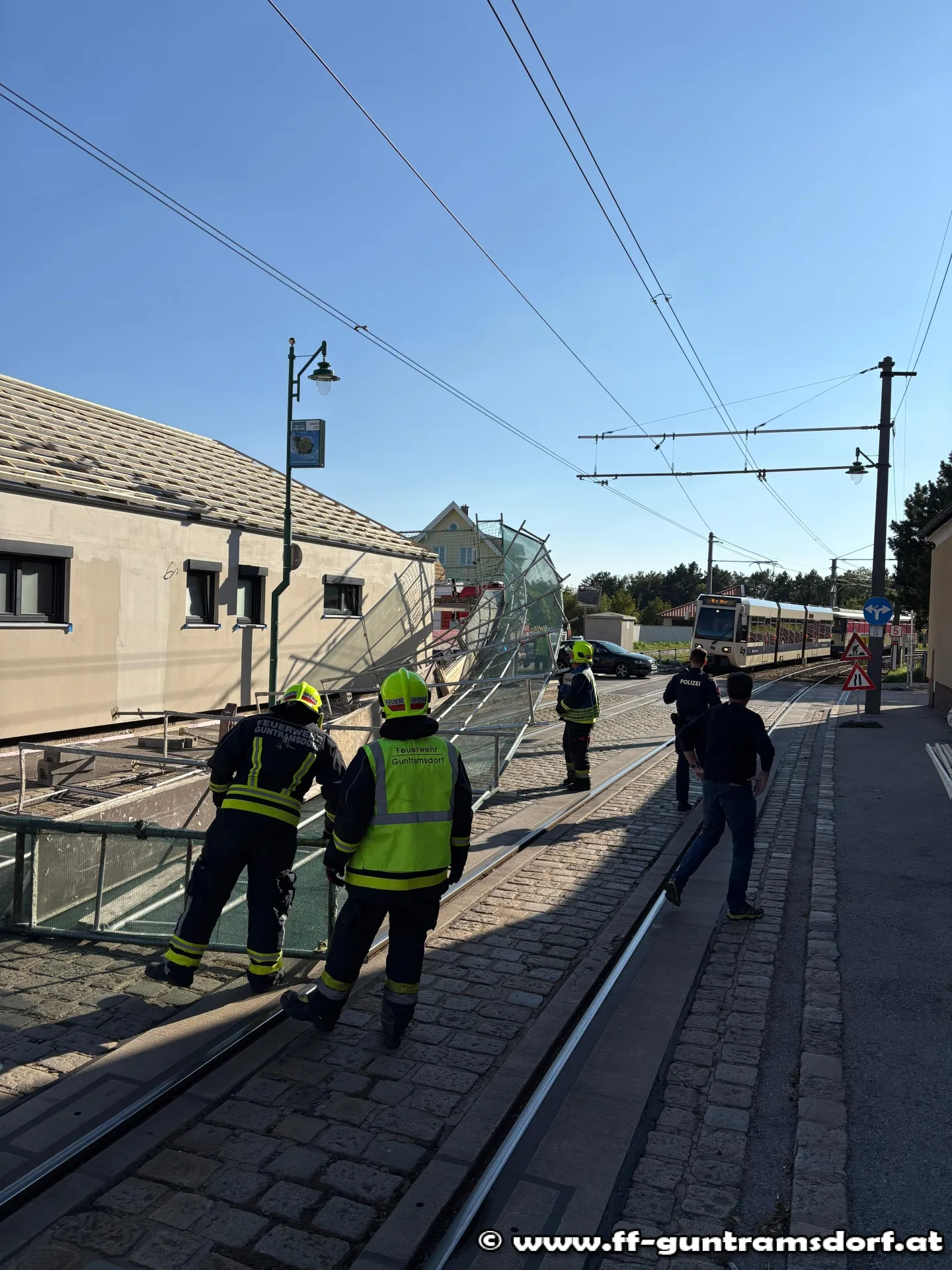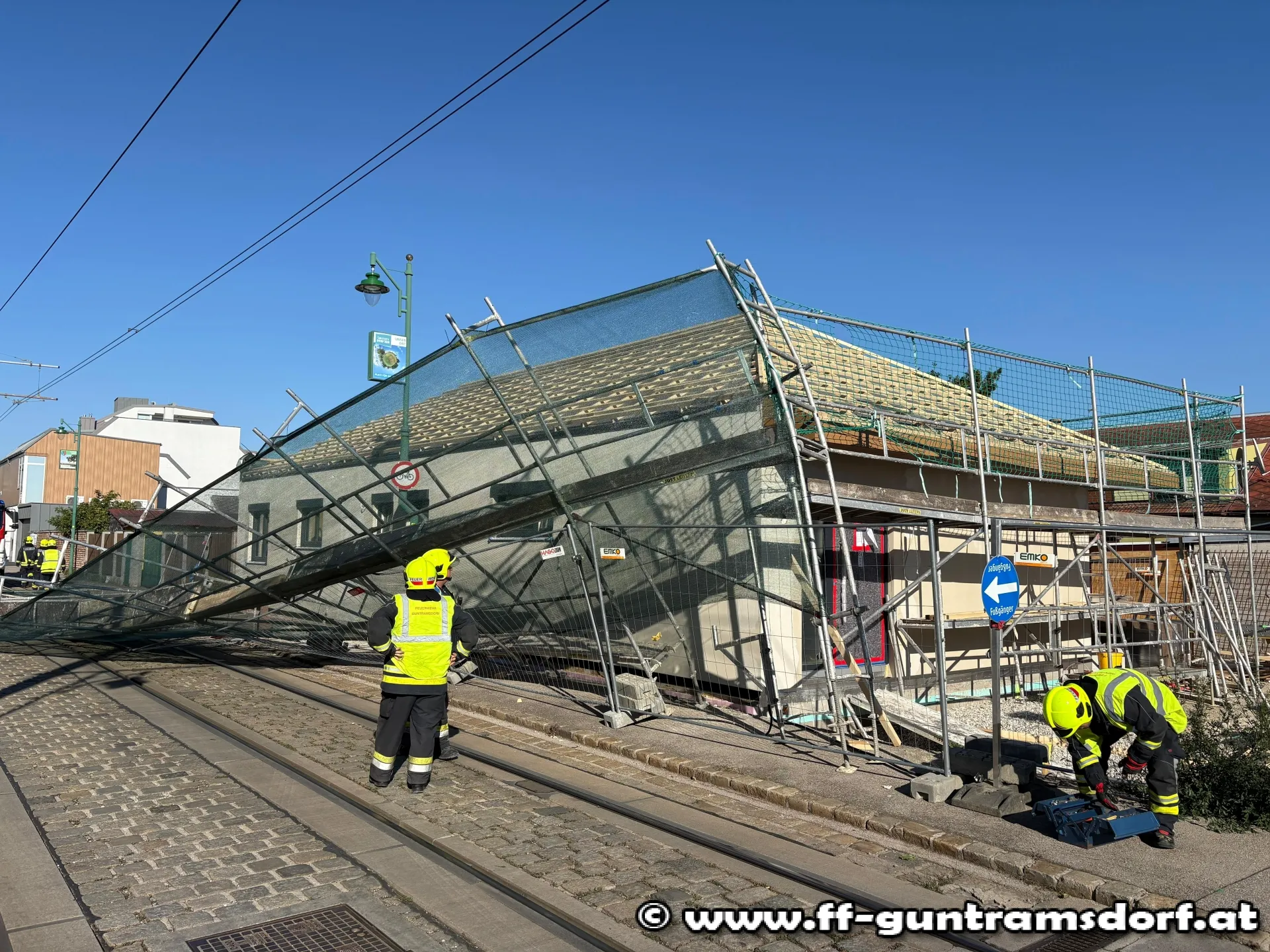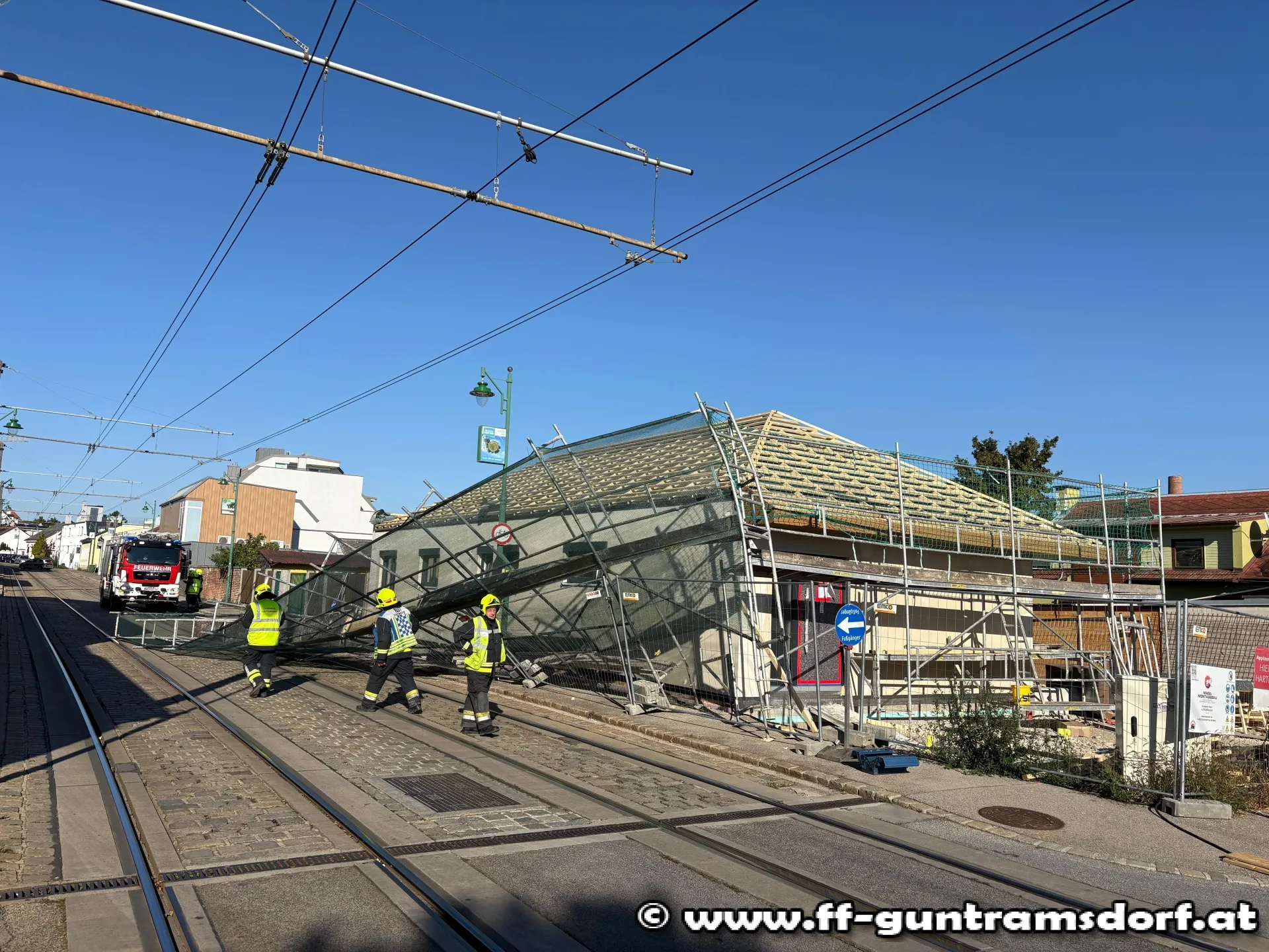 Mit dem Alarmierungstext „Steinfeldgasse, Baugerüst auf Schienen gestürzt“ wurde die FF Guntramsdorf kurz nach 15 Uhr zu diesem Einsatz alarmiert.