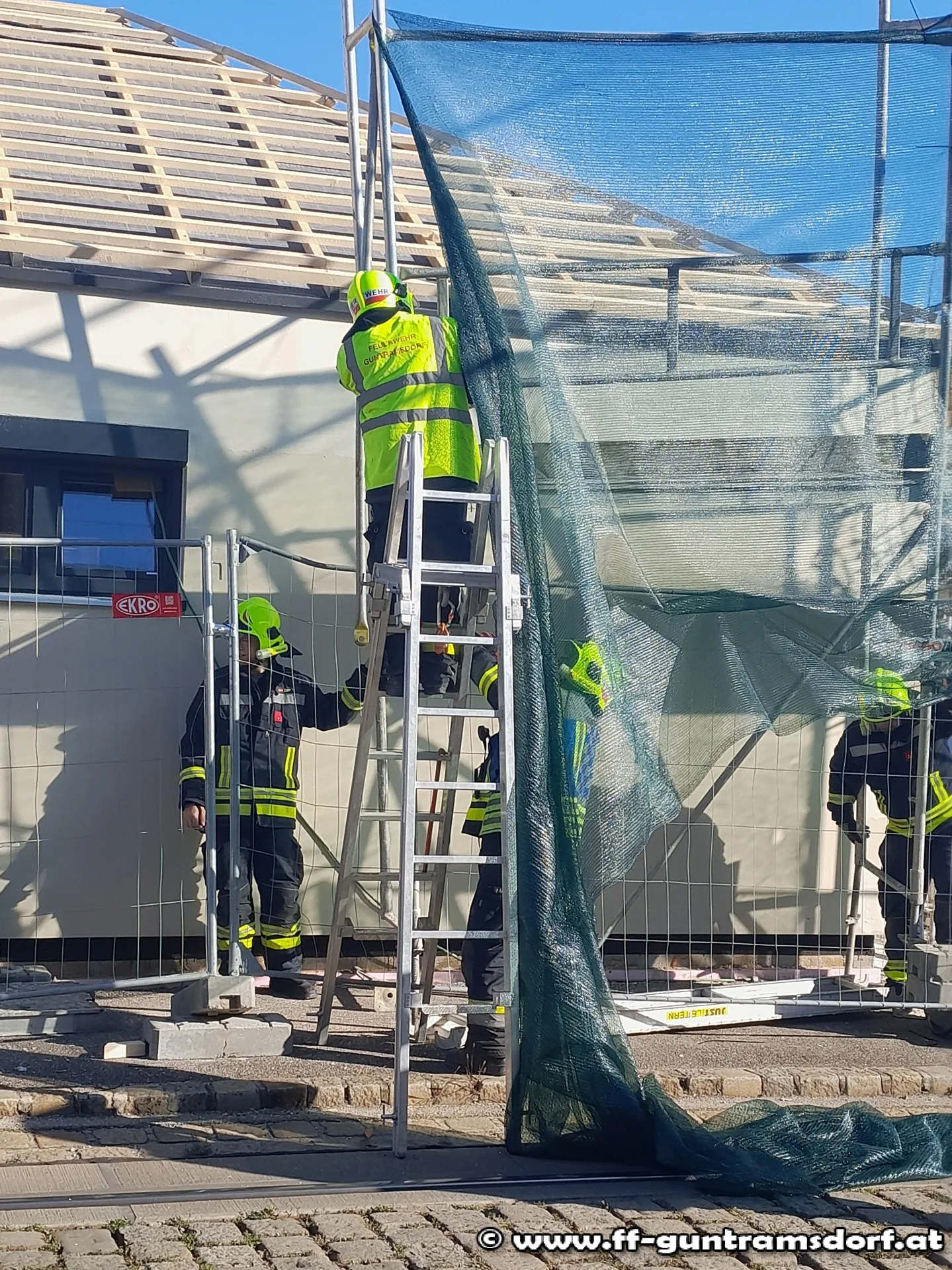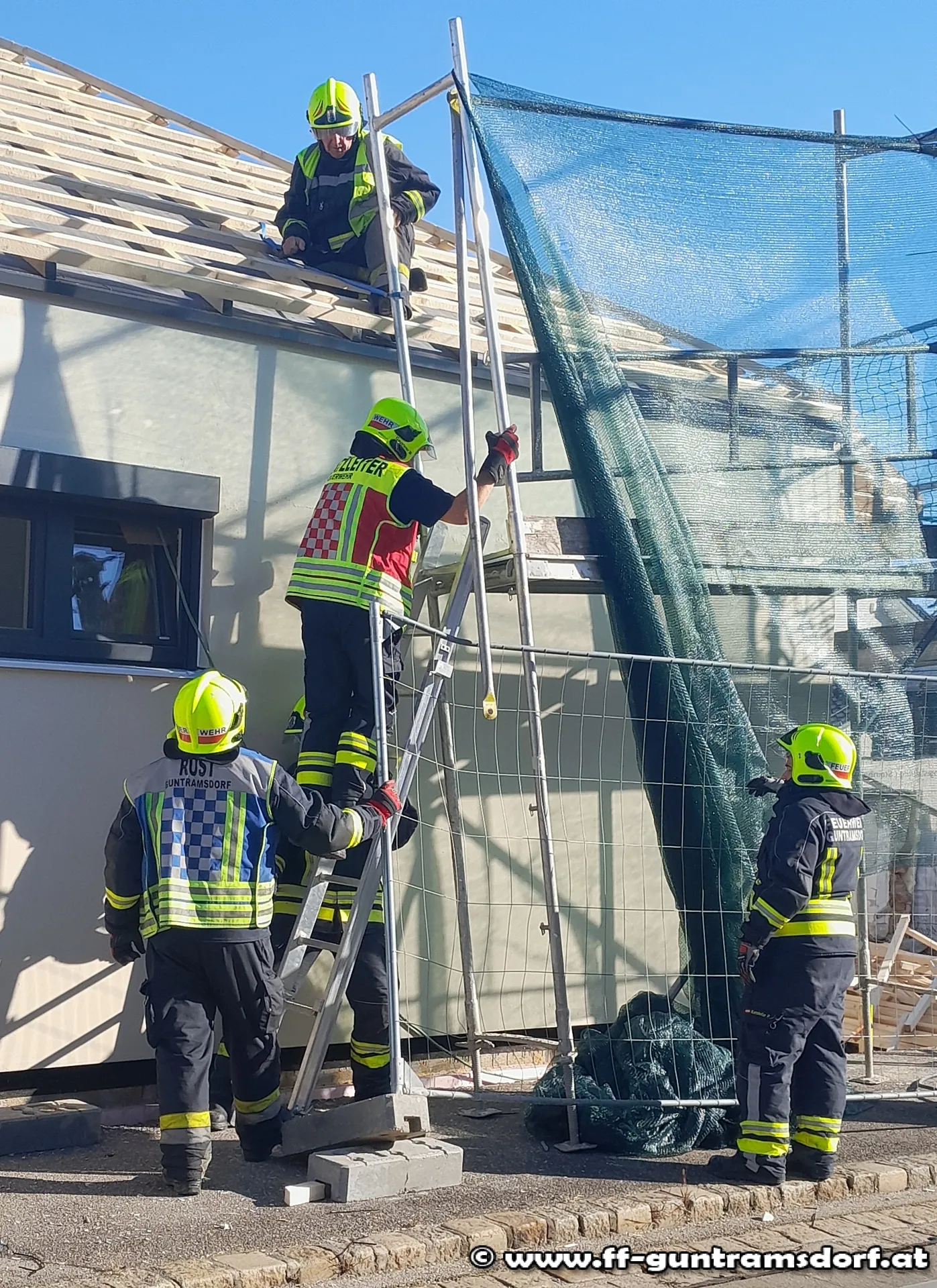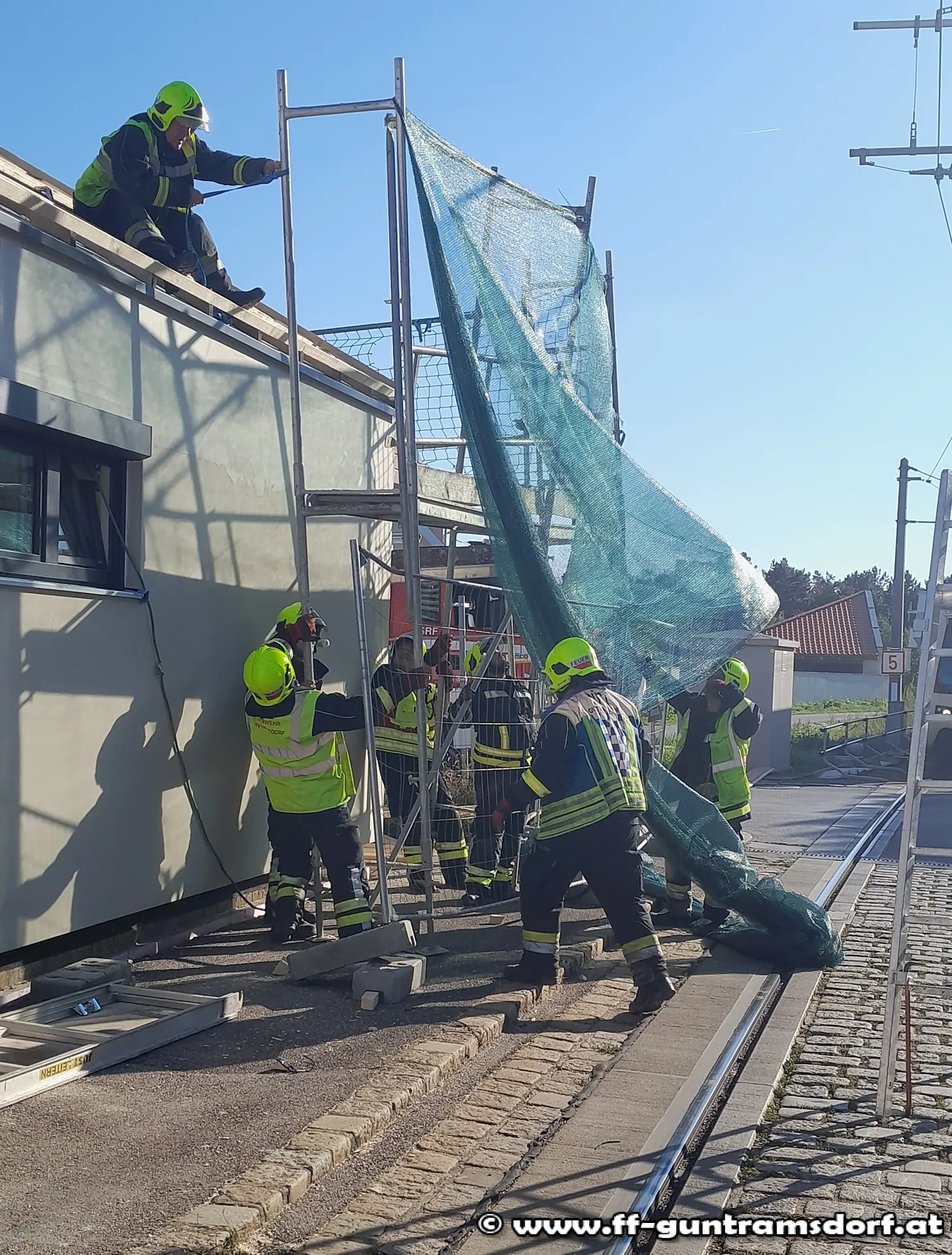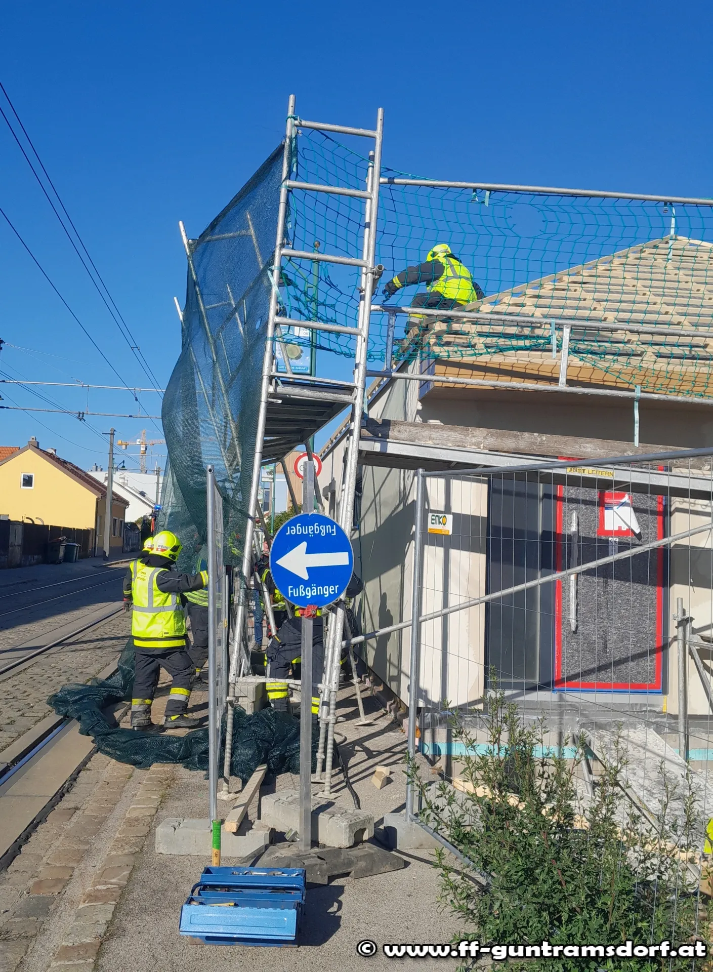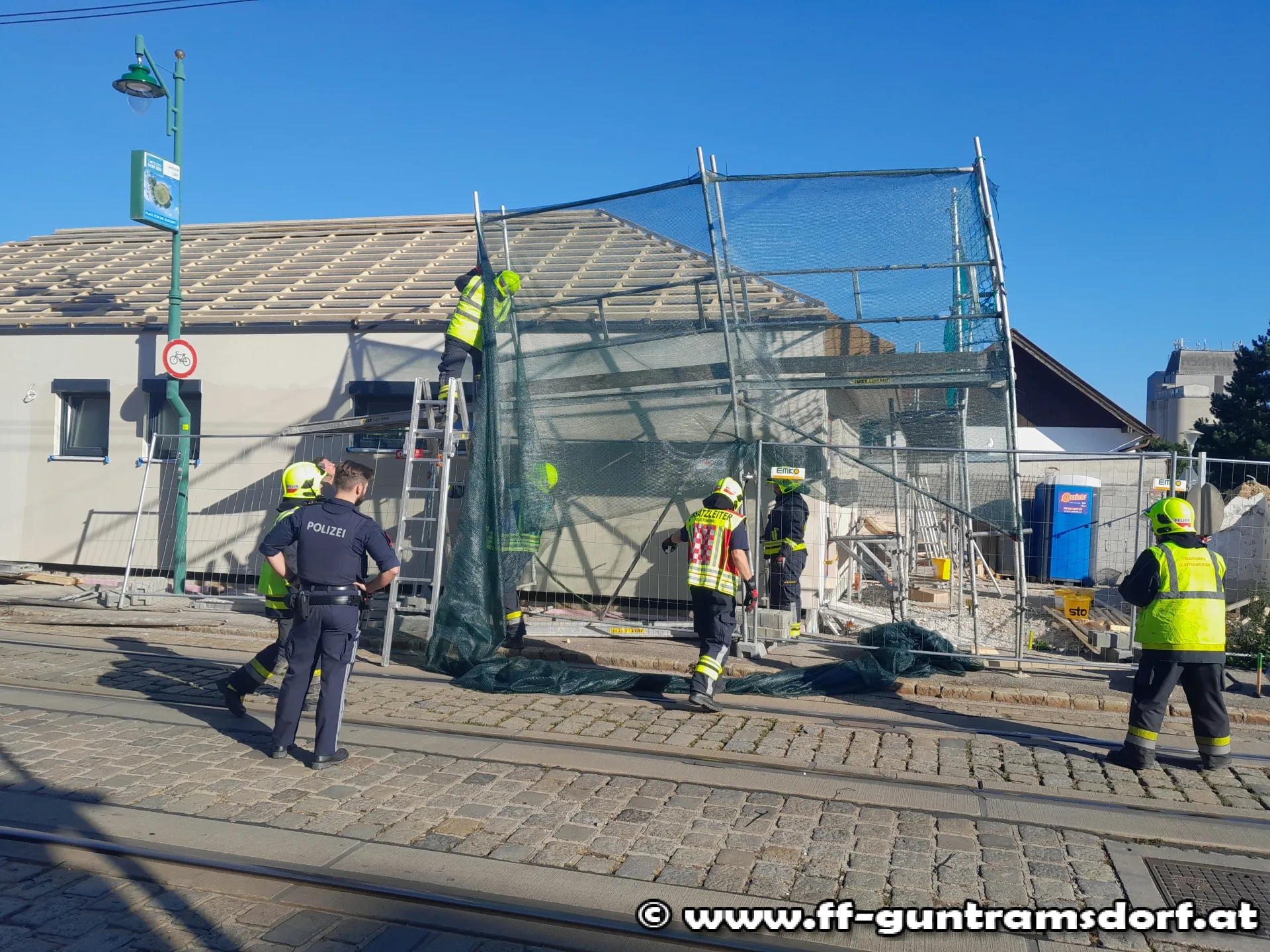 Mit dem Alarmierungstext „Steinfeldgasse, Baugerüst auf Schienen gestürzt“ wurde die FF Guntramsdorf kurz nach 15 Uhr zu diesem Einsatz alarmiert.