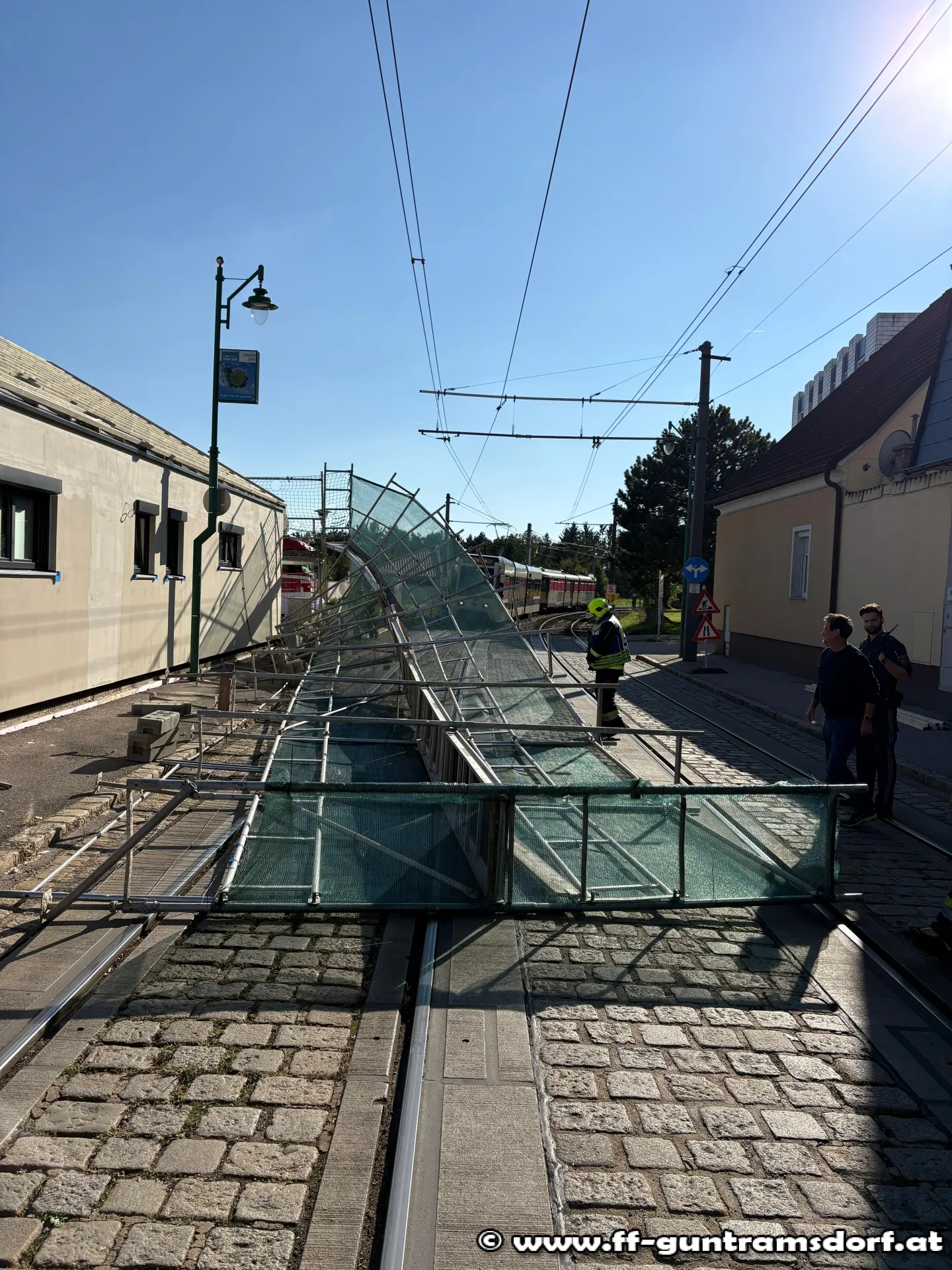 Aus bislang unerklärlicher Ursache war ein Baugerüst Ecke Steinfeldgasse/Feldgasse plötzlich umgestürzt. Die Oberleitung der Wiener Lokalbahn wurde zwar nicht beschädigt, jedoch waren beide Geleise der Bahn blockiert.