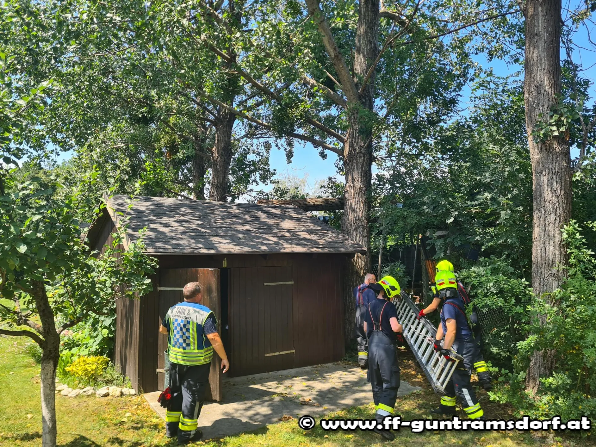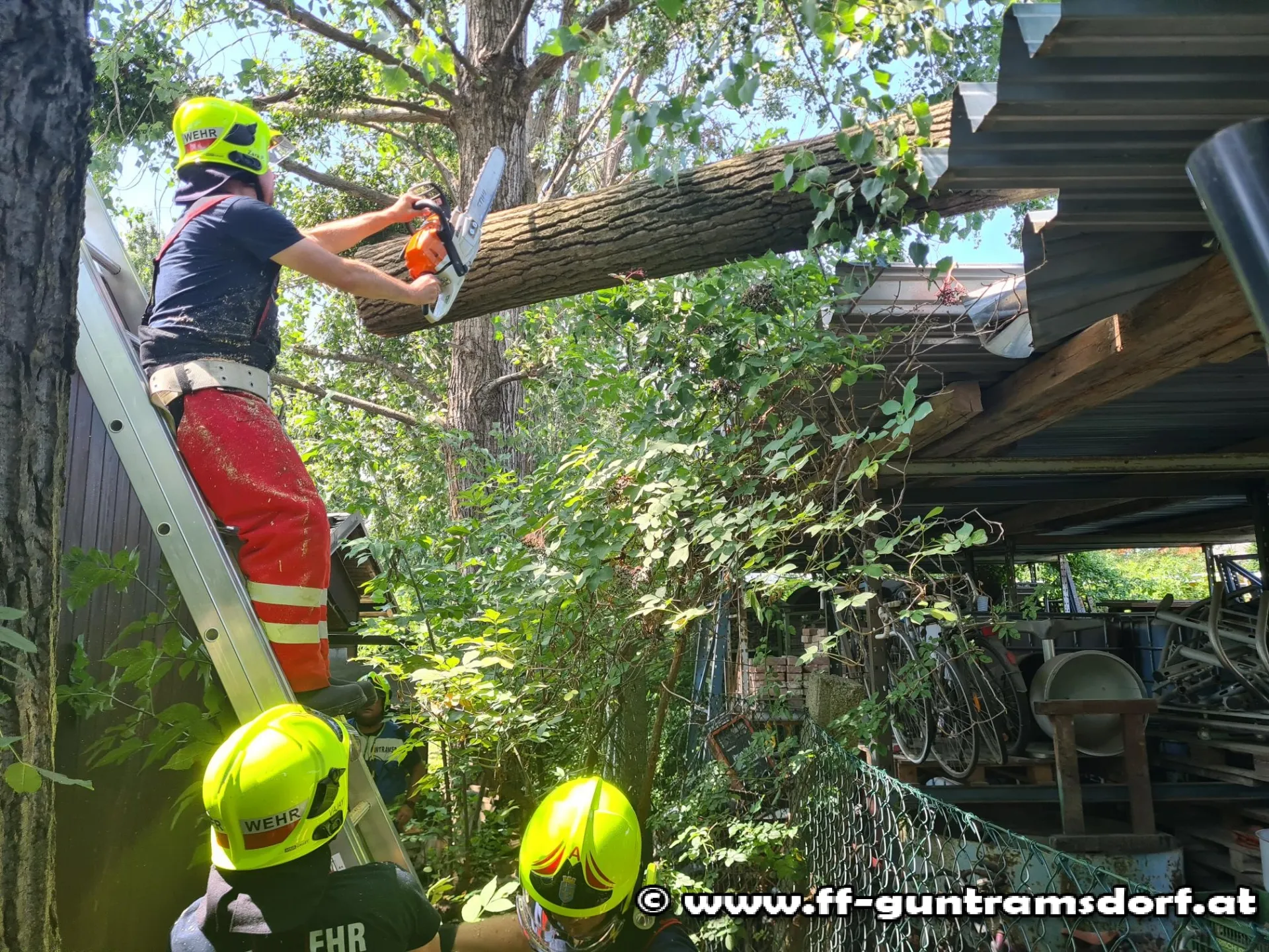 Nachdem die Schiebleiter im schmalen Bereich hinter der betroffenen Hütte aufgestellt war, konnte der Baum mittels Motorkettensäge zerkleinert werden. Somit war die Gefahr gebannt. Die restliche Entfernung führt eine Fachfirma in den kommenden Tagen durch.