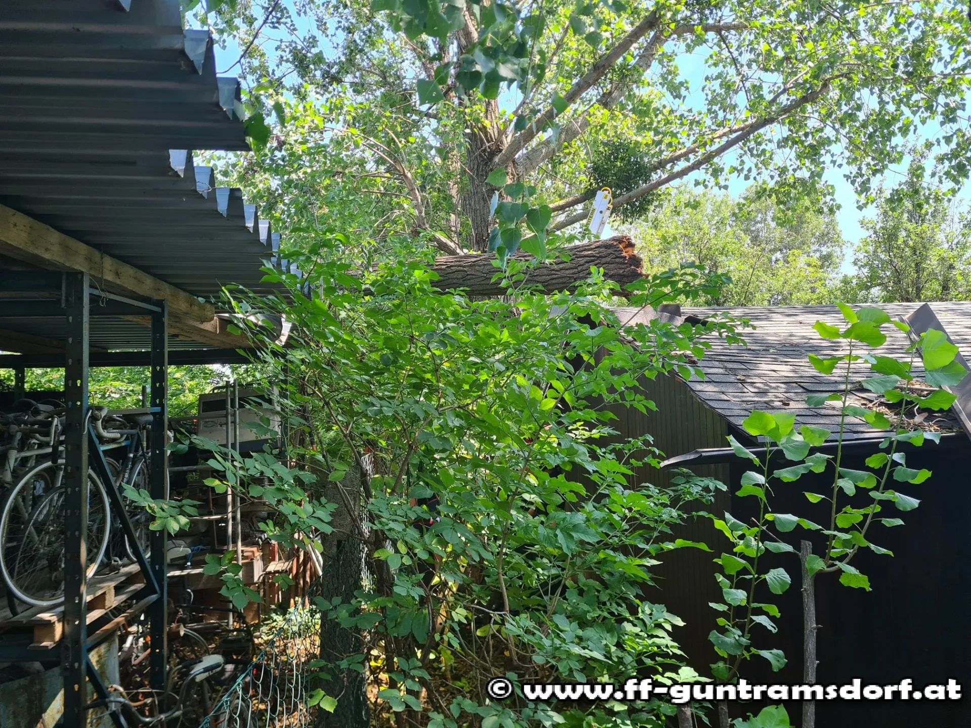 Der Wind der vorhergegangen Nacht hatte einen massiven Baum abgebrochen, der daraufhin auf eine Gartenhütte sowie auf das Dach einer Lagerhalle fiel.