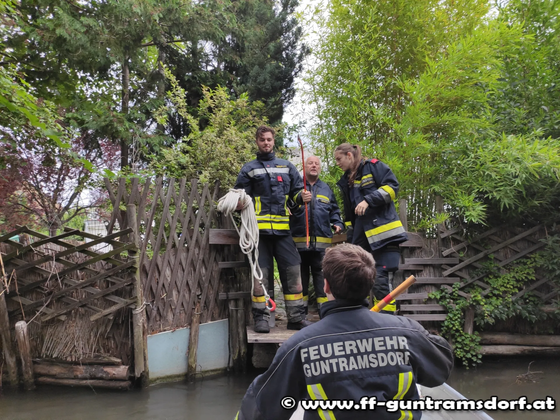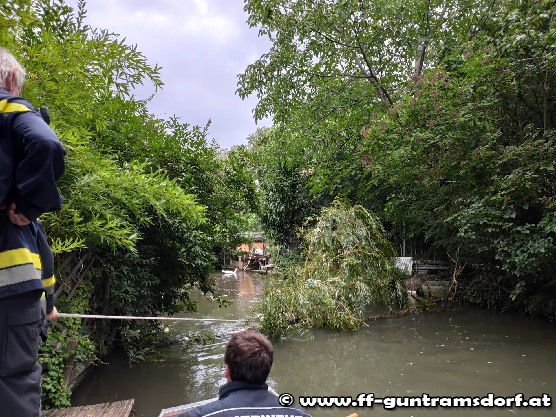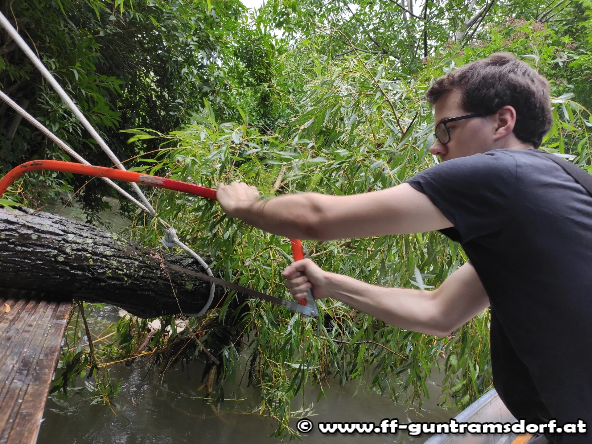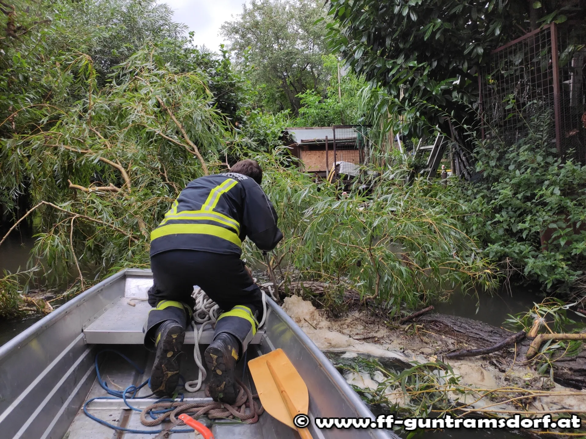 Anrainer hatten einen großen Weidenast im Bachbett entdeckt und die Feuerwehr veständigt. Einmal mehr bewährte sich die Anschaffung des Alu-Bootes, war doch der Einsatzort nur über Grundstücke von Anrainern und auf dem Wasserweg erreichbar. Vom Alu-Boot aus wurden Seile an dem im Wasser liegenden Ast angebracht, sodass dieser händisch aus dem Bachbett gezogen werden konnte.
