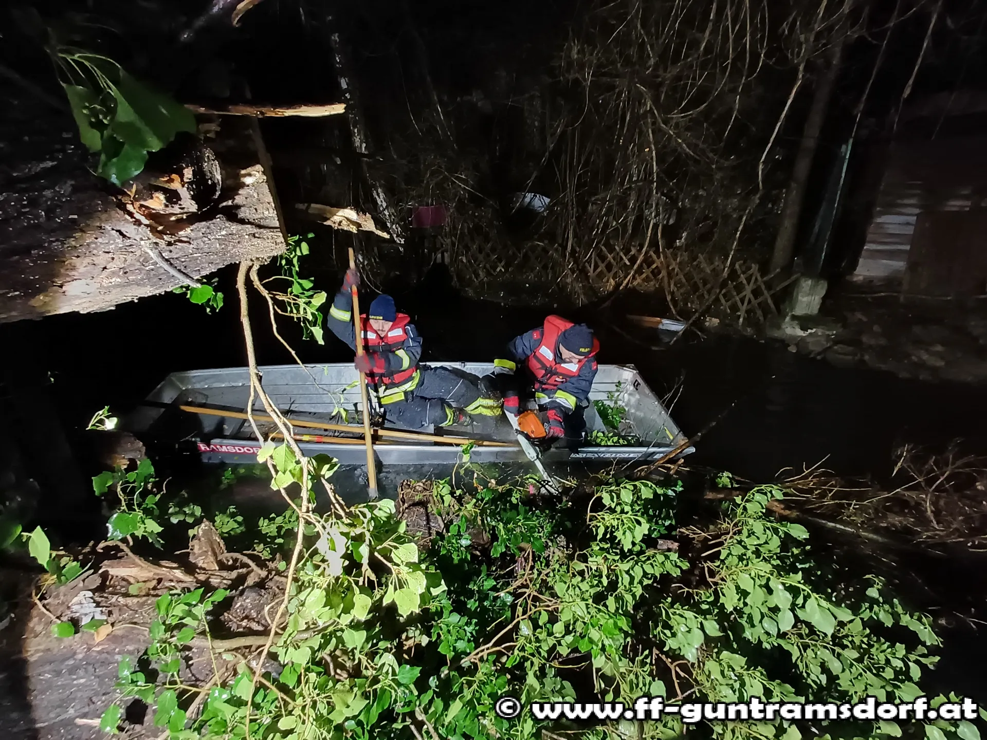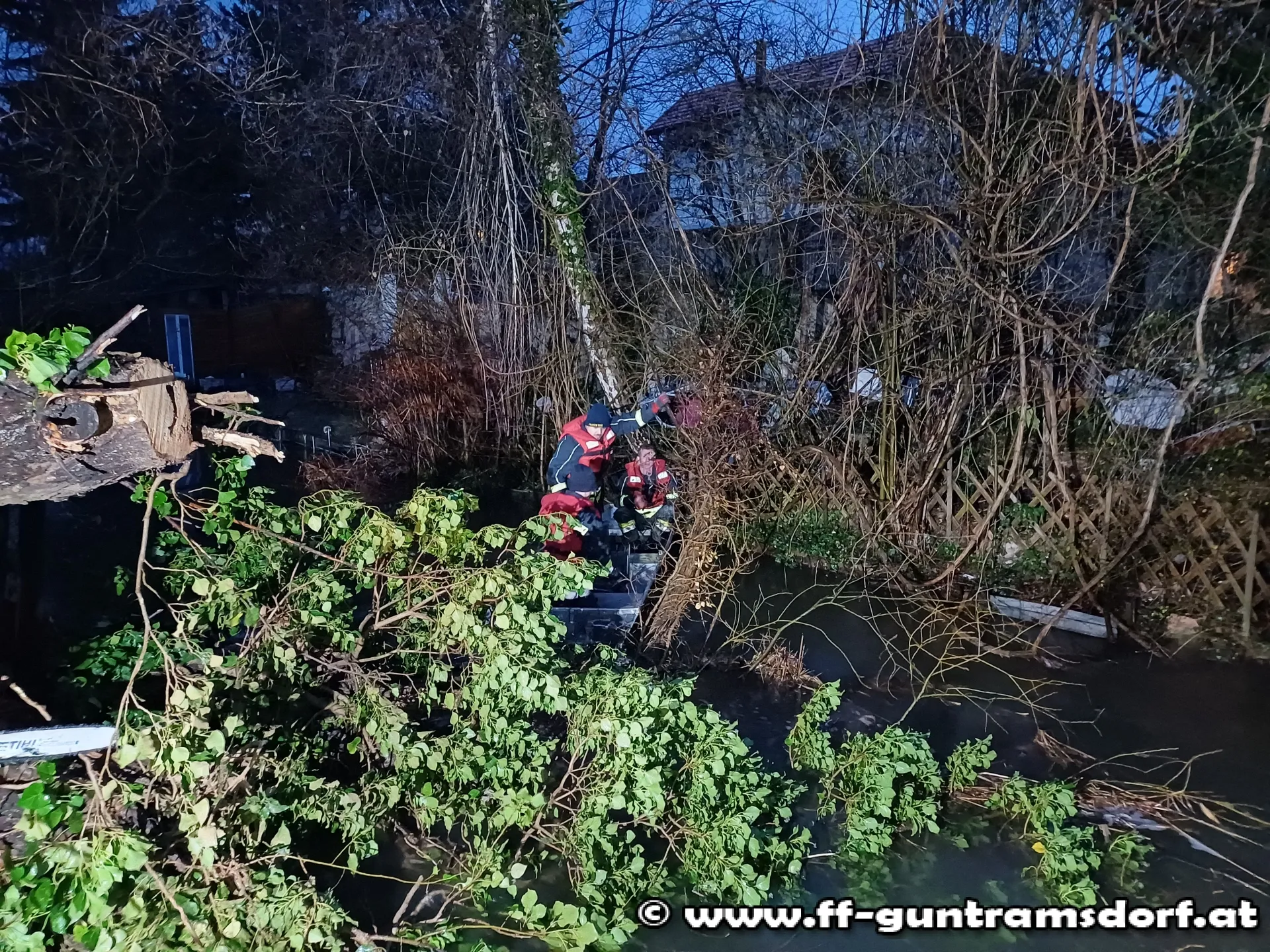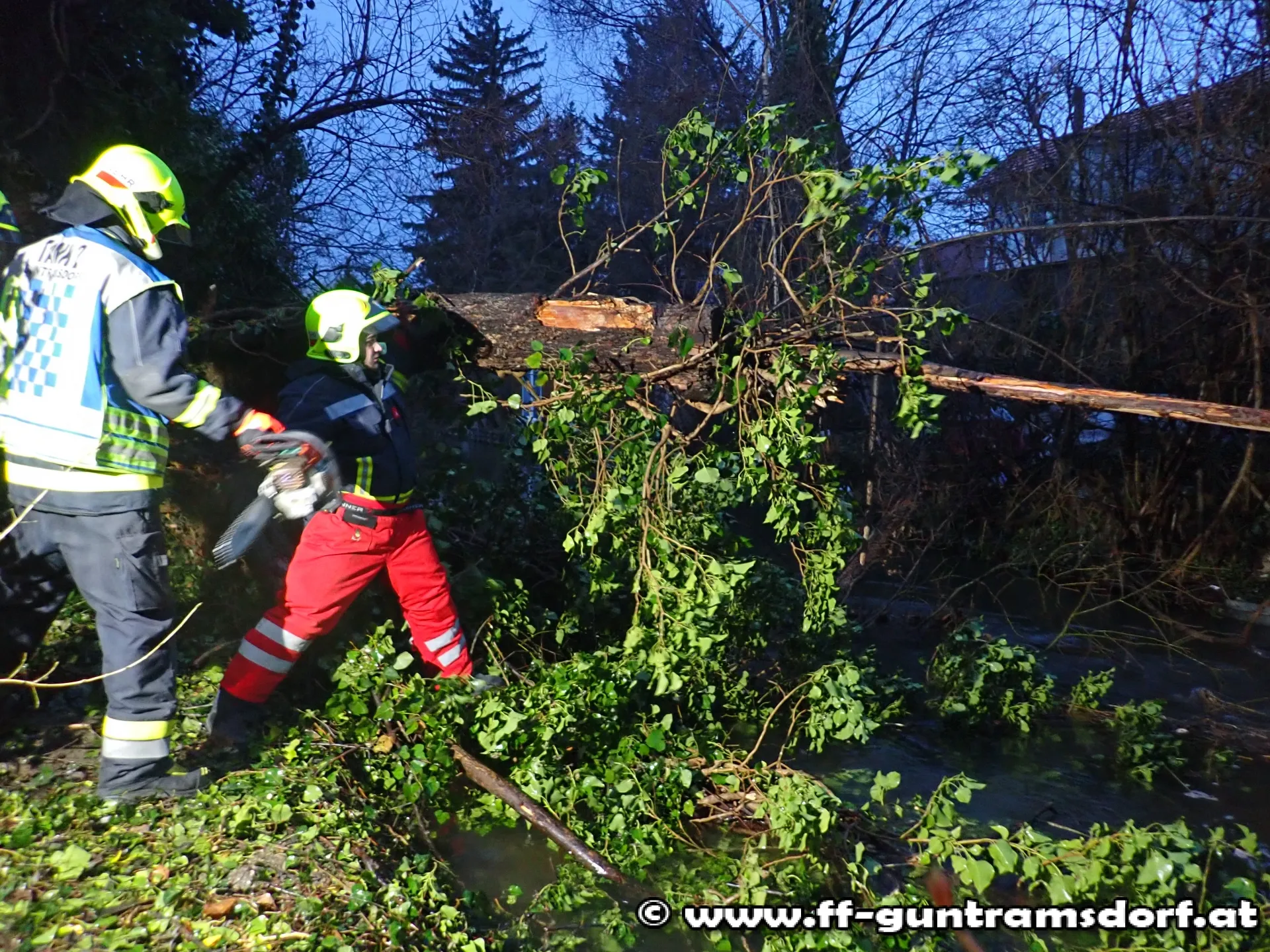 Da ein Teil des Baumes nur wasserseitig zu erreichen war, wurde zusätzlich das Aluboot in Einsatz gebracht. Die Mannschaft des Bootes konnte so die auf das andere Ufer ragenden Stämme und Äste zerkleinern und aus dem Wasser entfernen.