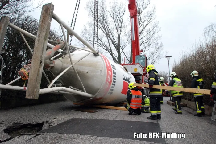 Am Einsatzort eingetroffen wurde mit dem Bergekran des schweren Rüstfahrzeuges versucht den Baustoffsilo zu bewegen. Da dieser Versuch scheiterte wurde vom Einsatzleiter entschieden das Kranfahrzeug Mödling nachzualarmieren.