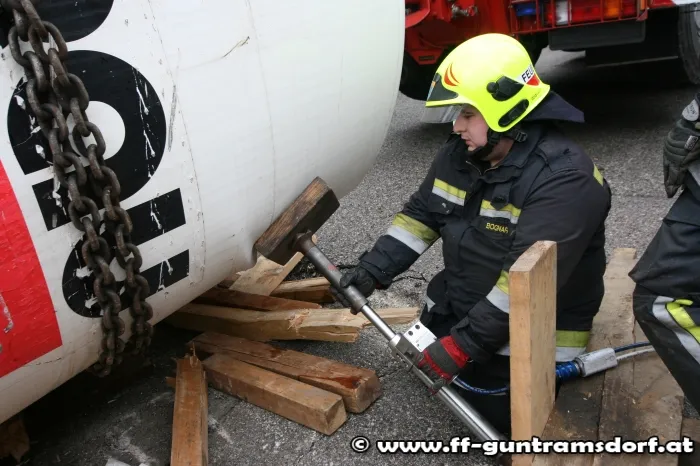 Um diesen jedoch seitlich bewegen zu können, mussten die Einsatzkräfte der Feuerwehr Guntramsdorf einen hydraulischen Rettungszylinder in Stellung bringen da durch das große Gewicht eine Drehbewegung des Krans nicht möglich war.