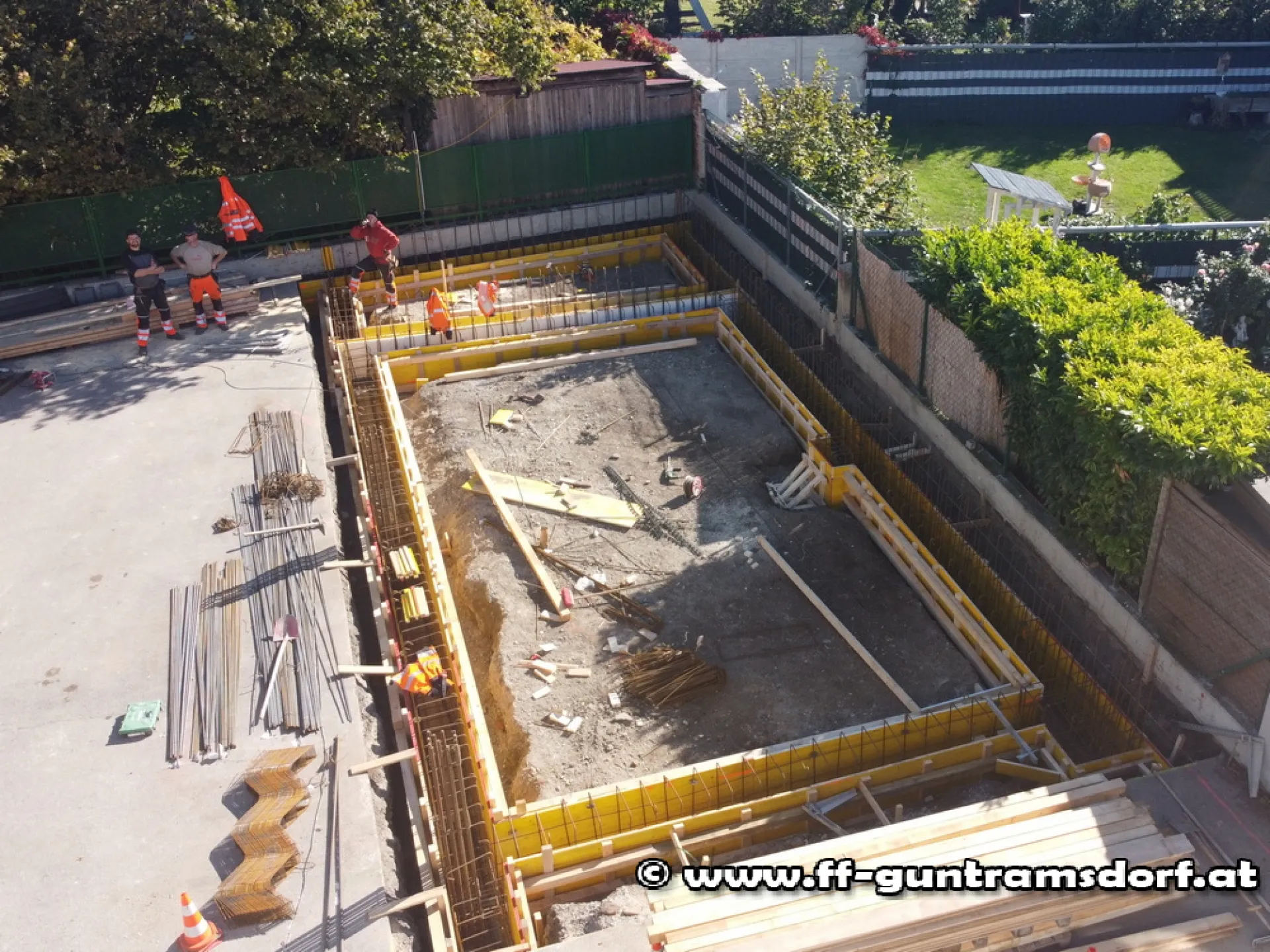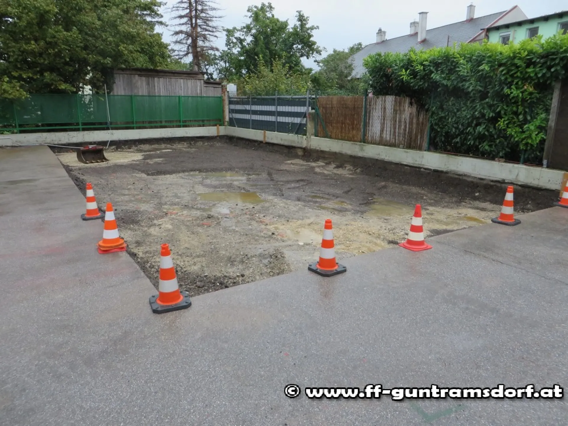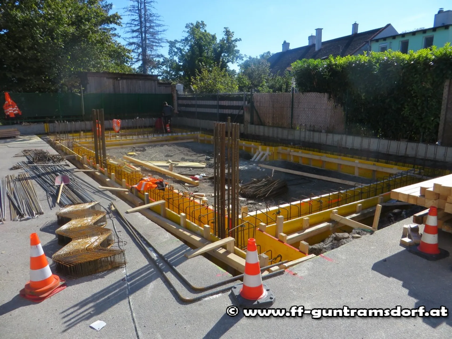 Innerhalb von zwei Wochen wurden für das neue Gebäude der Asphalt abgetragen, der Aushub für das Fundament durchgeführt, die Schalung gesetzt, Eisen eingebracht und schließlich das Fundament betoniert.