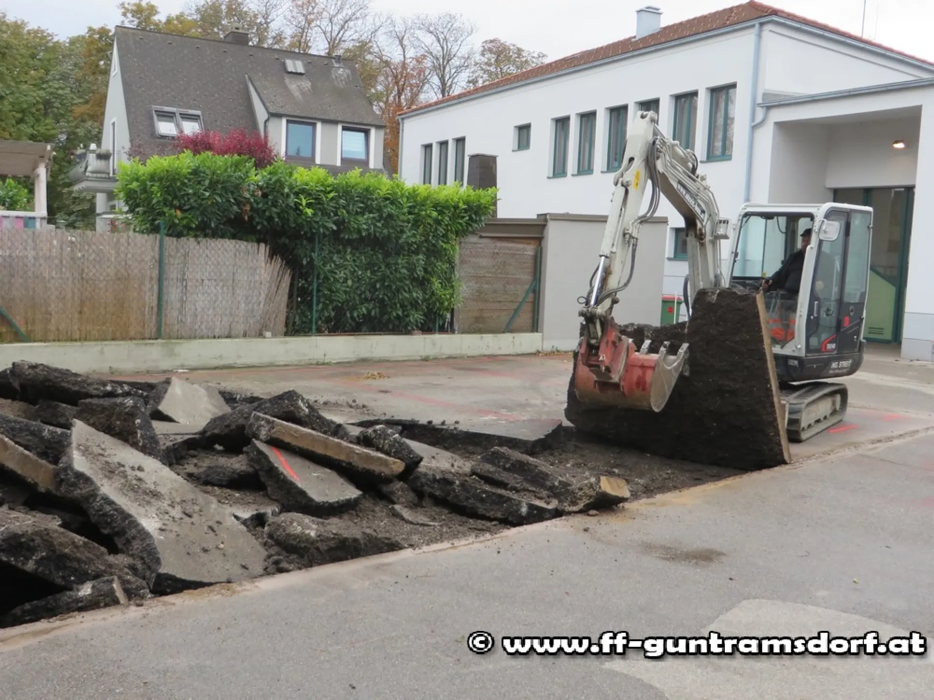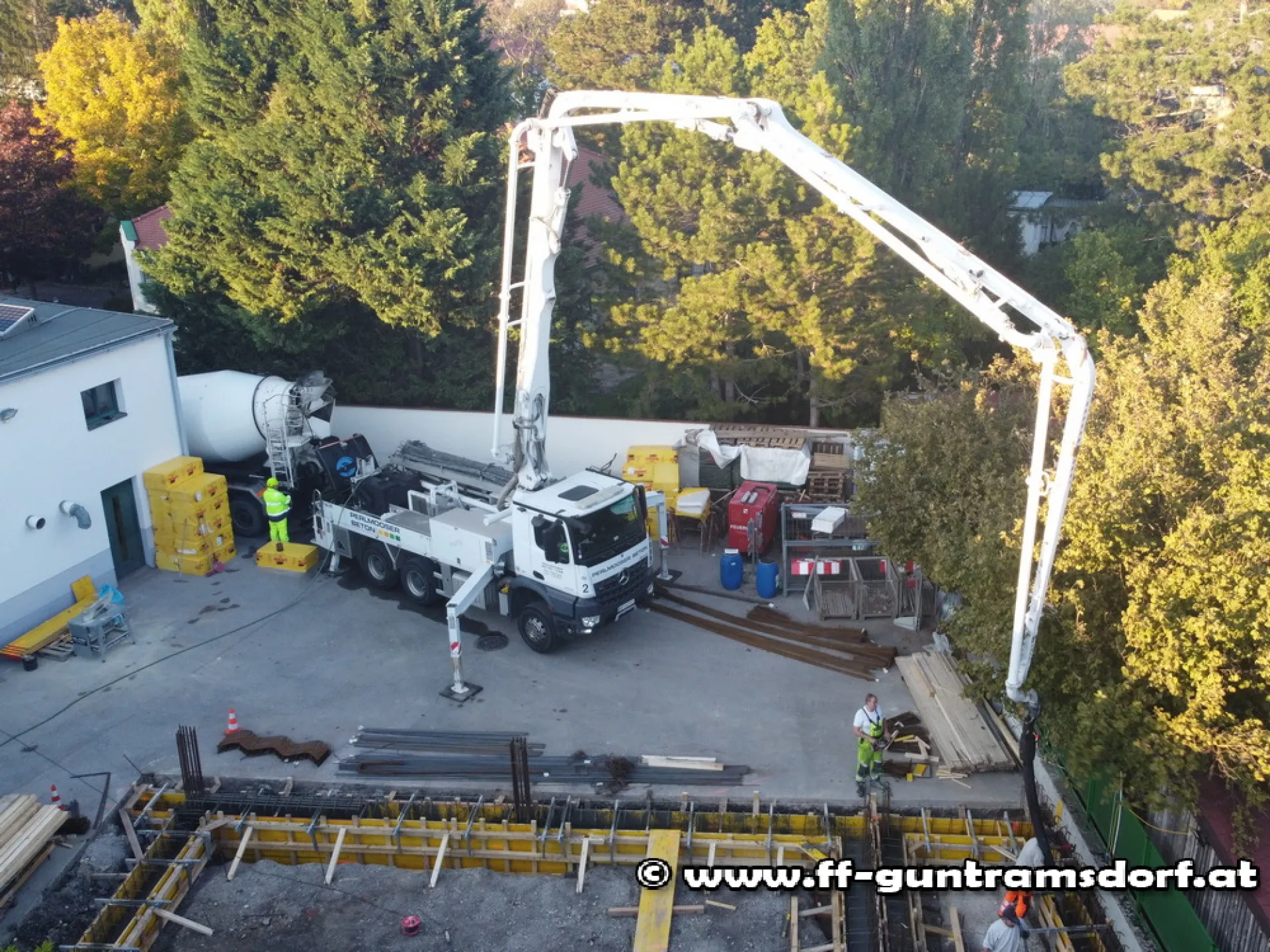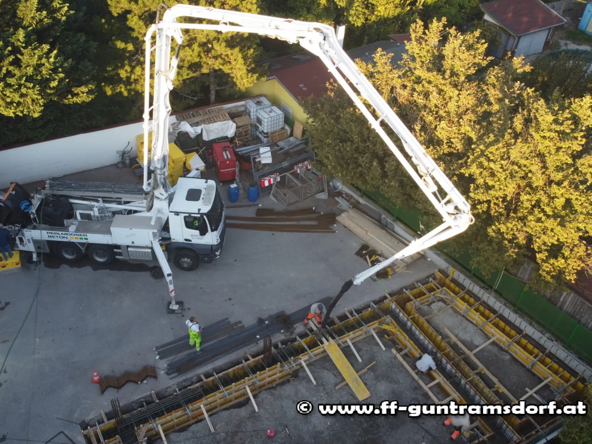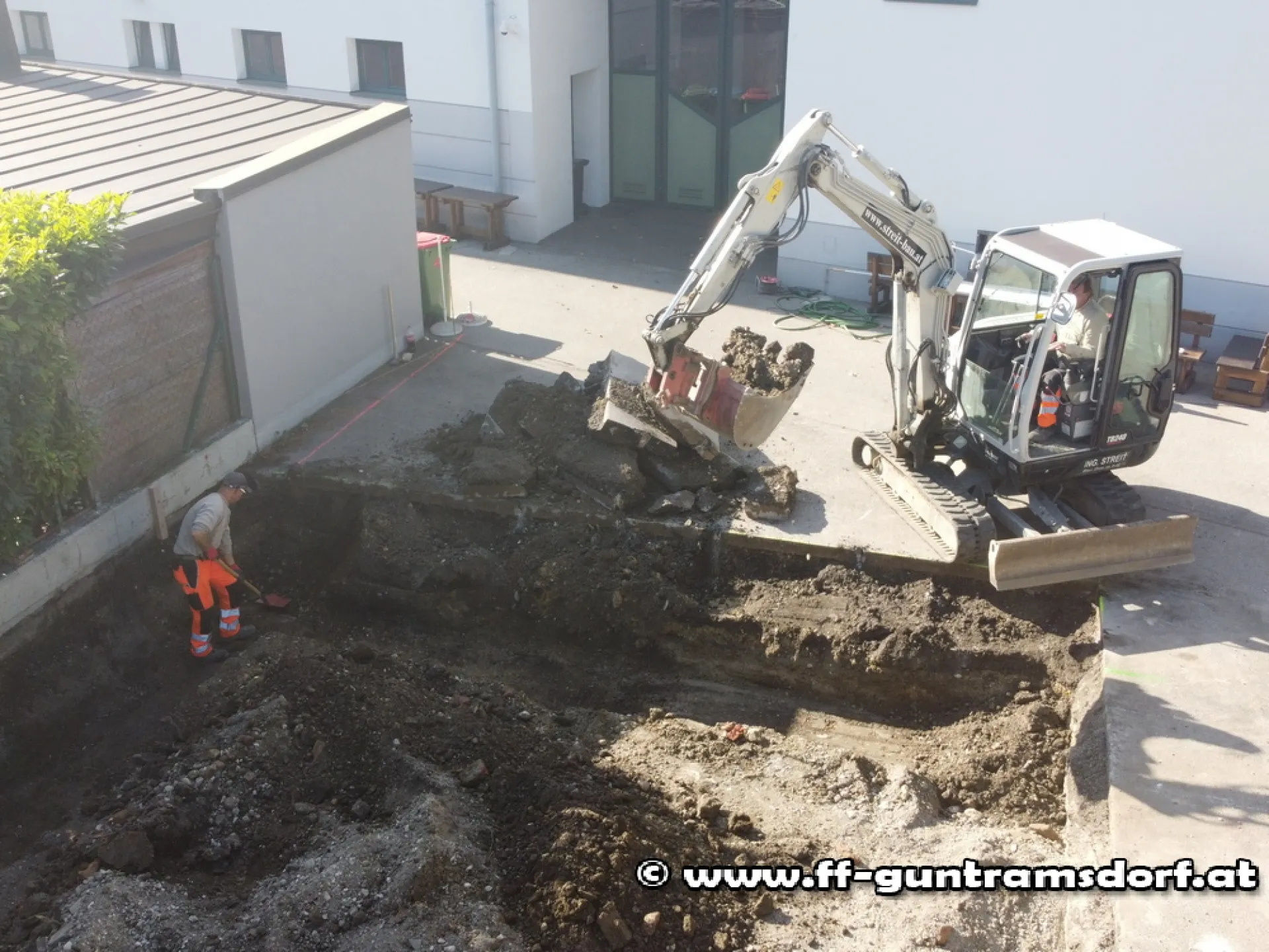 Innerhalb von zwei Wochen wurden für das neue Gebäude der Asphalt abgetragen, der Aushub für das Fundament durchgeführt, die Schalung gesetzt, Eisen eingebracht und schließlich das Fundament betoniert.