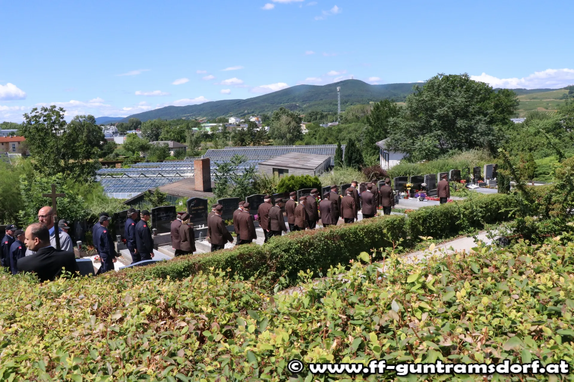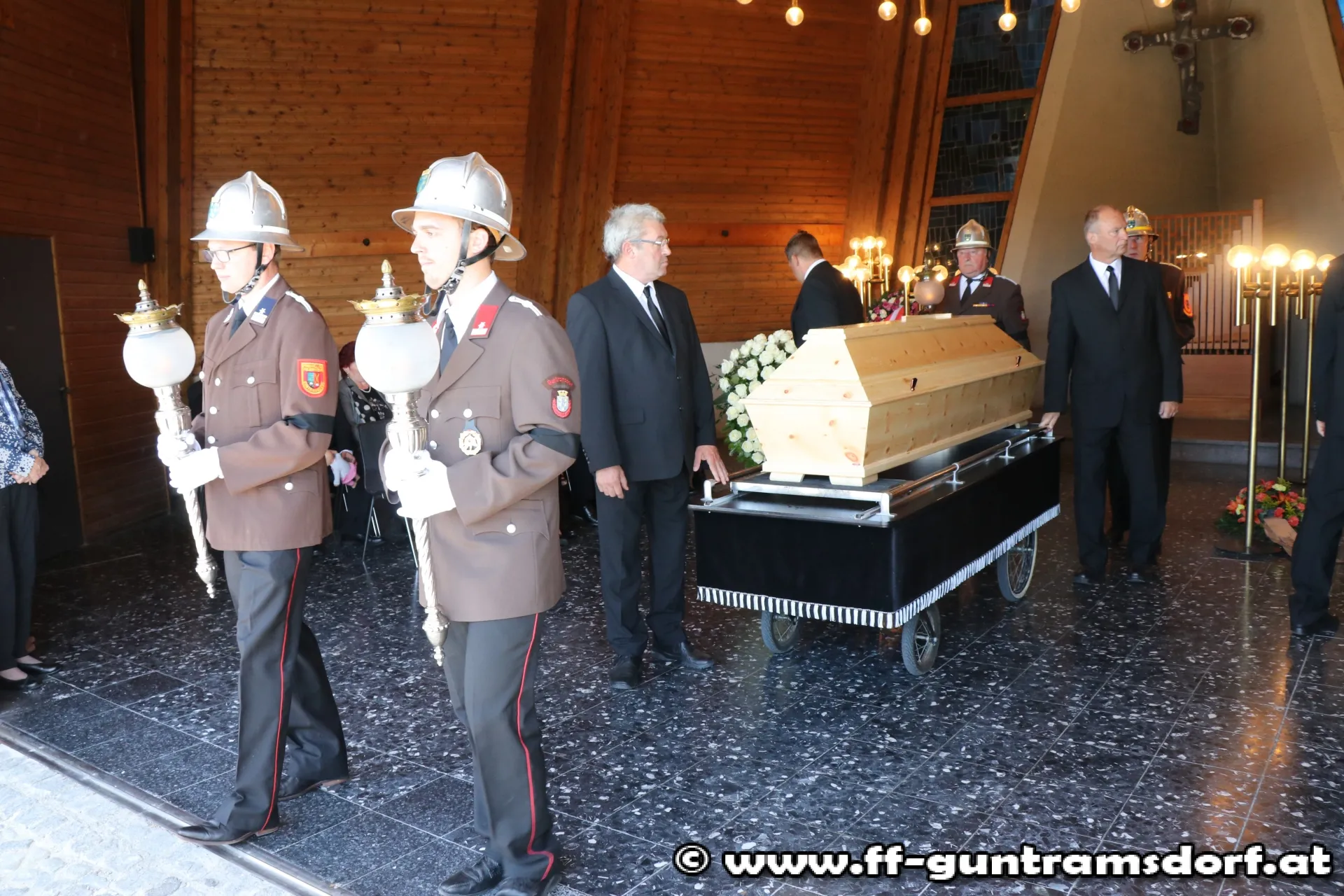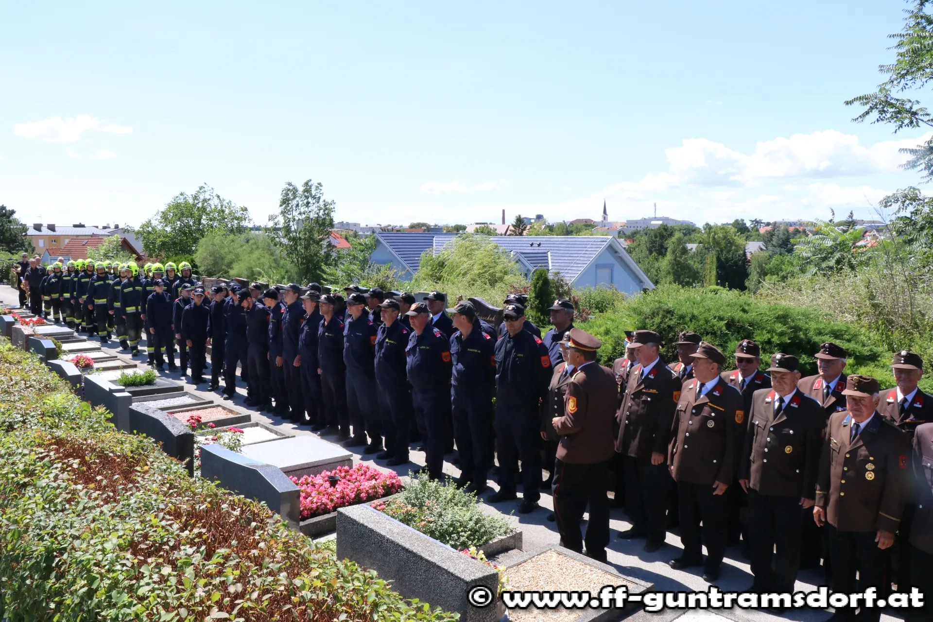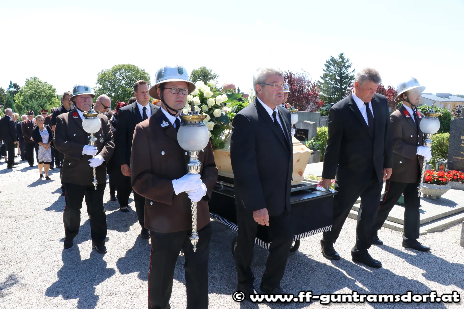 Die Trauerfeier am Samstag, den 1. Juli wurde zum eindrucksvollen Beweis von Feuerwehrkameradschaft: Nicht nur alle Guntramsdorfer Bewerbsteilnehmer, die noch in den frühen Morgenstunden beim Landesfeuerwehrleistungsbewerb in St.Pölten teilgenommen hatten, sondern auch die Einsatzmannschaft, die bei einem Brandeinsatz die FF Gumpoldskirchen unterstützt hatte, waren direkt vom Brandeinsatz zum Begräbnis gekommen. Insgesamt nahmen 76 Kameraden am Friedhof in Guntramsdorf von Franz Wokacek Abschied.