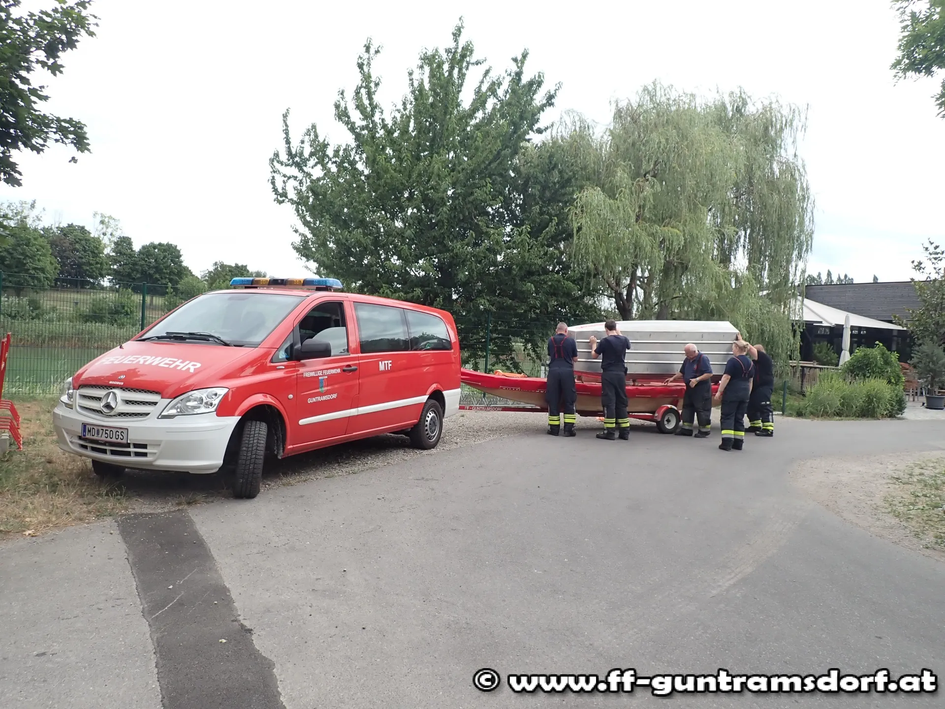 6 Mitglieder der FF Guntramsdorf mit Mannschaftstransportfahrzeug + Zillenanhänger mit Aluboot