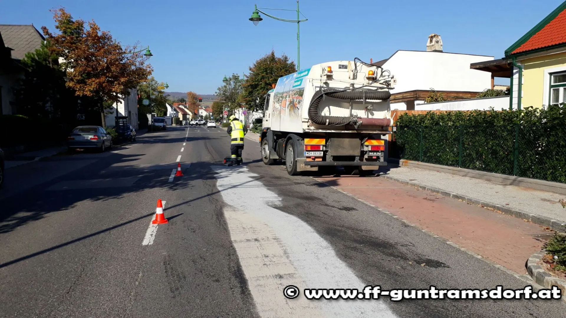 Nachdem das ausgeflossene Öl mittels Ölbindemittel gebunden war, wurde die Fahrbahn mit der Kehrmaschine der Gemeinde gereinigt.