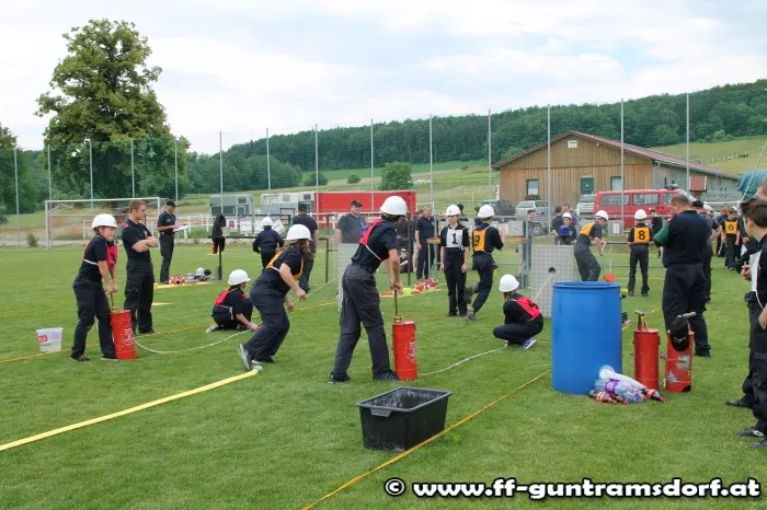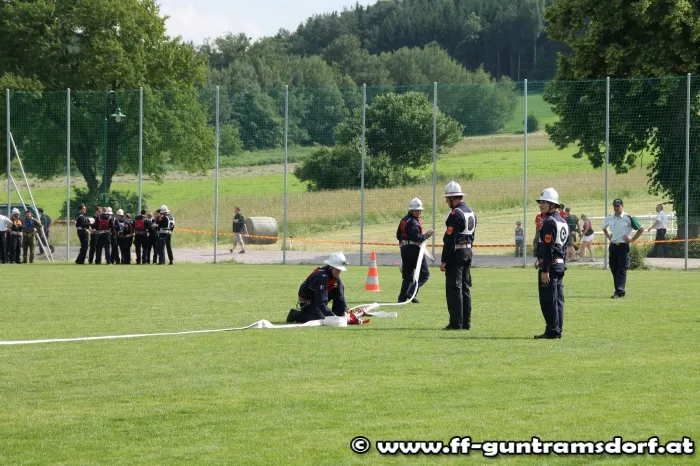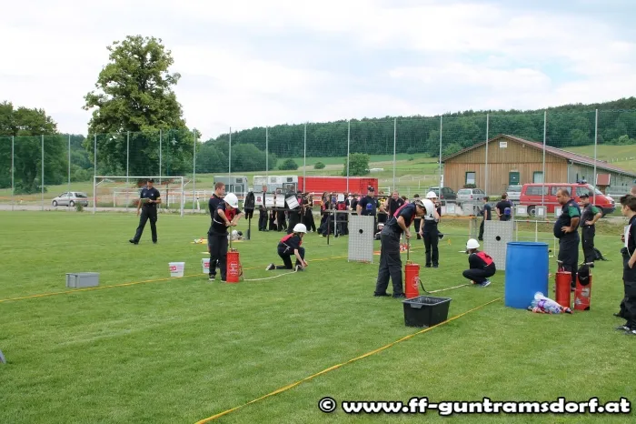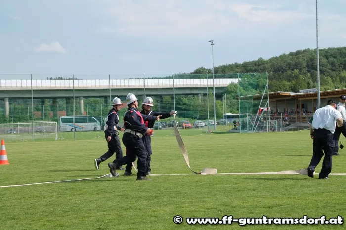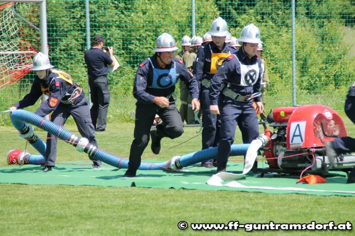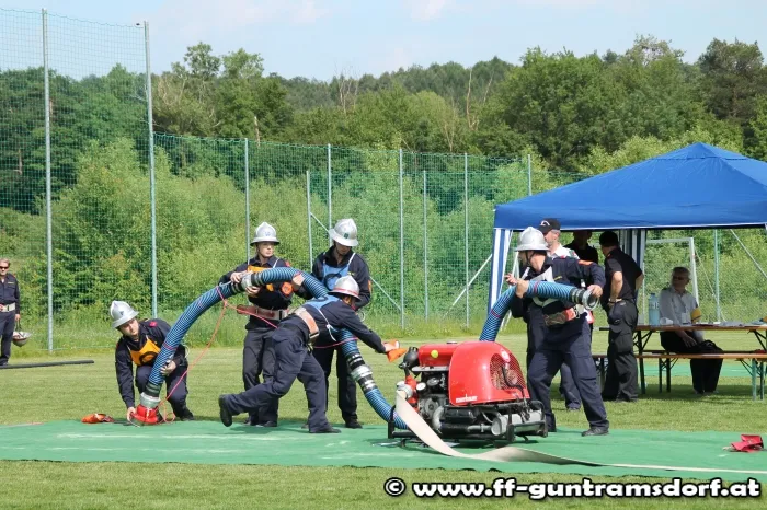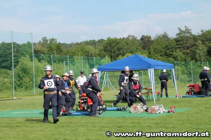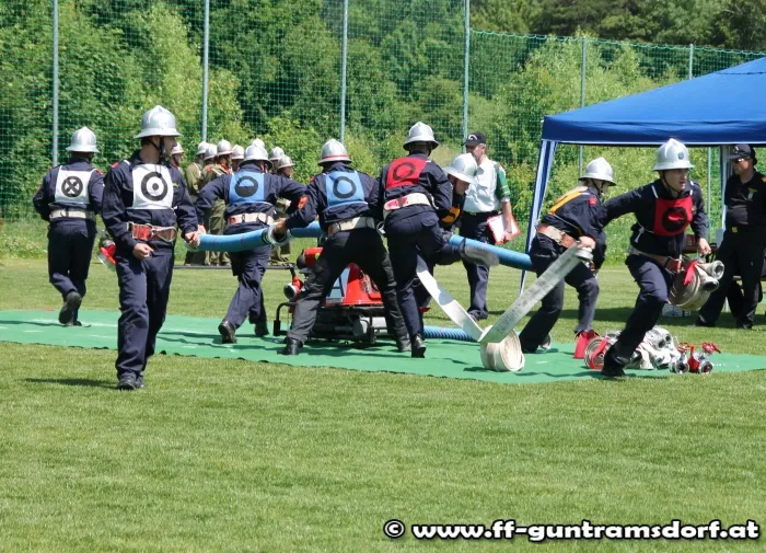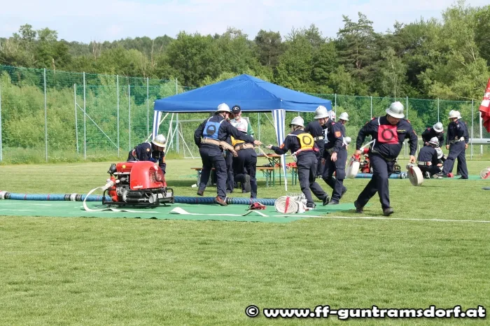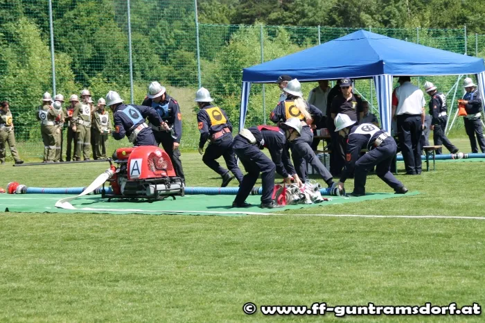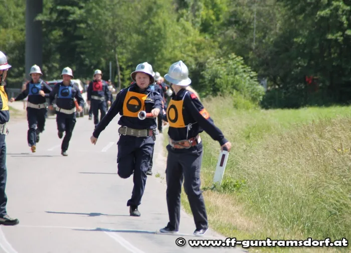 Am Nachmittag waren nun die „Aktiven“ gefordert. Hier wird in einer Gruppe von 9 Mitgliedern ein Löschangriff durchgeführt, jedoch ohne Wasser, und anschließend wird noch ein Staffellauf bewältigt. Die Feuerwehr Guntramsdorf nahm mit drei Gruppen in Bronze, sowie zwei Gruppen in Silber teil. Alle Gruppen zeigten auf dem ausgezeichnet vorbereiteten Bewerbsplatz solide Leistungen.