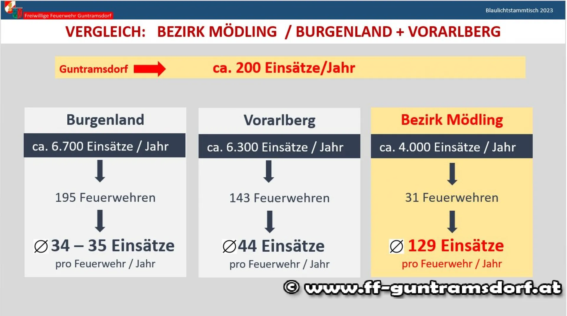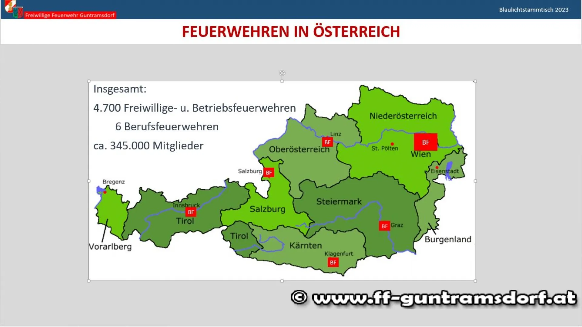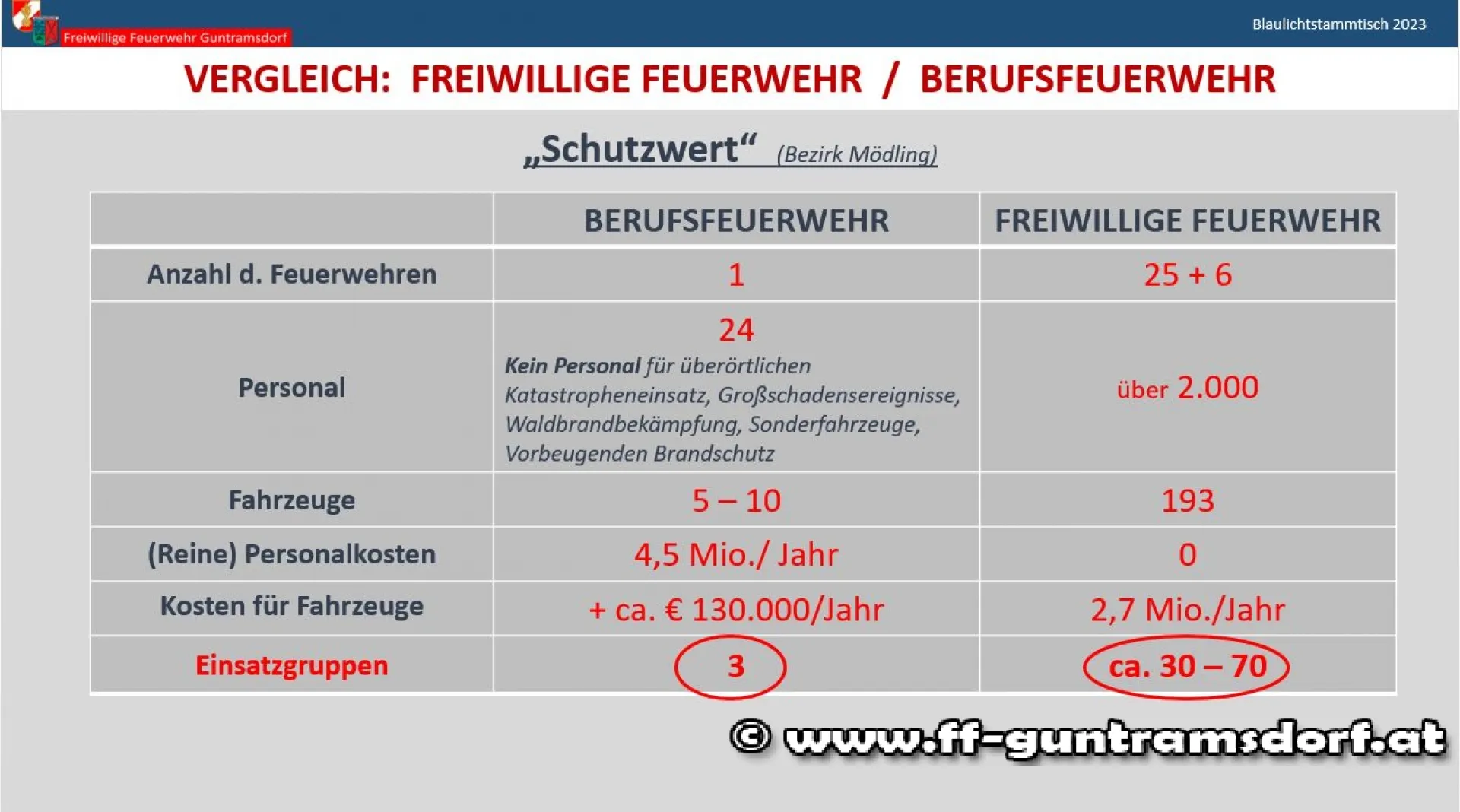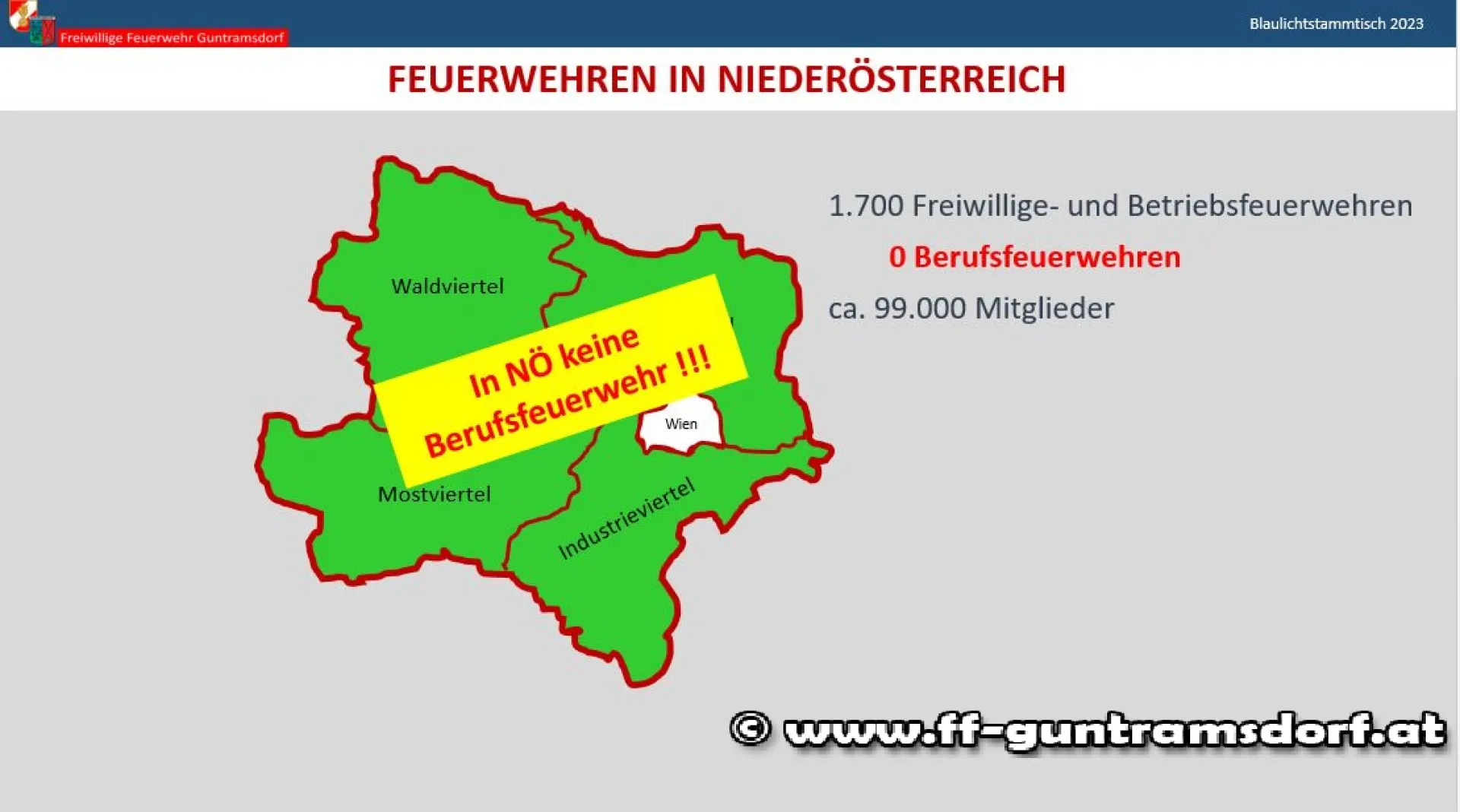 In Form einer Präsentation wurde den Gästen ein kurzer Überblick über das Feuerwehrwesen gegeben, der Katastrophenhilfsdienst und die Sonderdienste des NÖ Landesfeuerwehrverbandes vorgestellt. Einen Schwerpunkt bildete der (Kosten)Vergleich zwischen Freiwilliger Feuerwehr und Berufsfeuerwehr, der klar aufzeigte, dass es einfach kein kostengünstigeres Sicherheitssystem gibt als unser flächendeckendes System der Freiwilligen Feuerwehren mit rund 345.000 Mitgliedern in ca. 4.700 Feuerwehren!