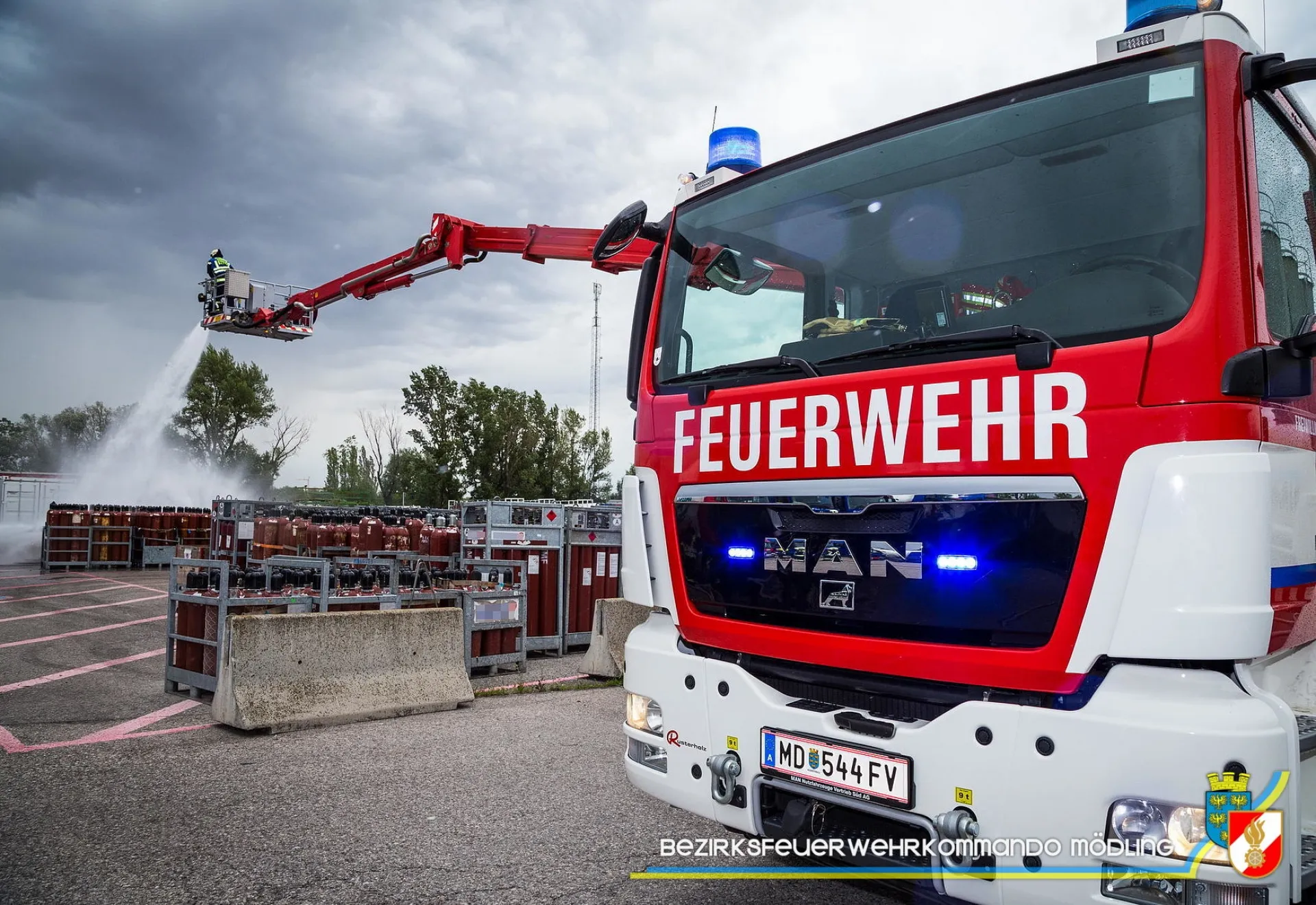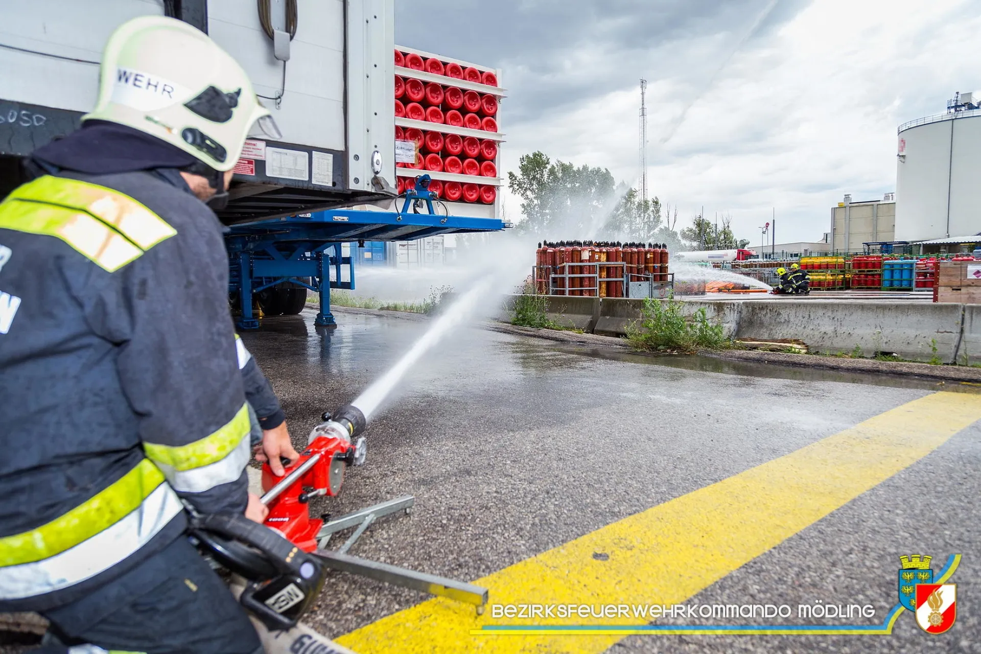 Da der Brand der brennenden Gasflaschen nicht gelöscht werden kann, wurde entschieden, diese zu kühlen. Für die Kühlmaßnahmen waren große Mengen Wasser notwendig, da mittels mehrerer Wasserwerfer versucht wurde, die Temperatur der Gasflaschen zu senken. Mittels Tank 3 und TS (Tragkraftspritze) des Tank 3 wurden die Fahrzeuge der FF Gumpoldskirchen sowie der Tank 1 Guntramsdorf gespeist. Ebenfalls wurden mehrere Hydranten sowie eine zusätzliche Tragkraftspritze der FF Gumpoldskirchen für die Wasserversorgung eingesetzt. Da mit den Wasserwerfern nicht alle Flaschen erreicht werden konnte, wurde ebenfalls der Steig Mödling zur Unterstützung angefordert – welcher von oben die Gasflaschen gezielt kühlen konnte.