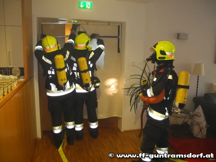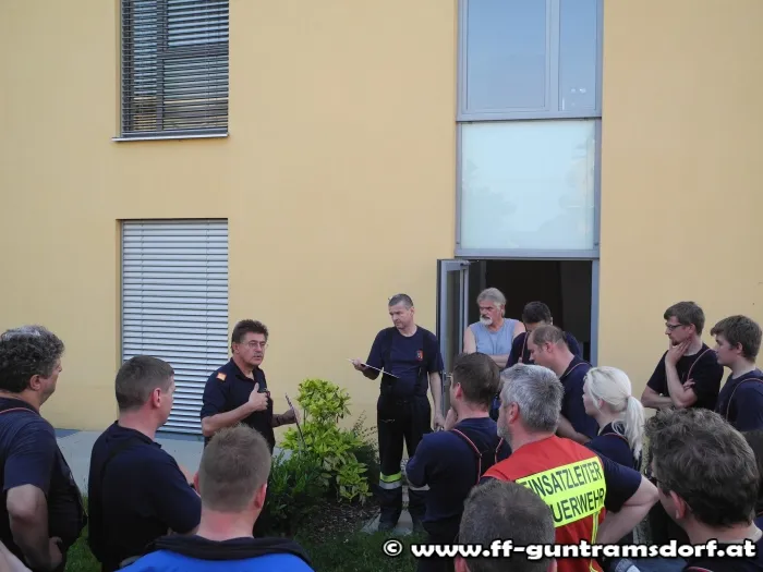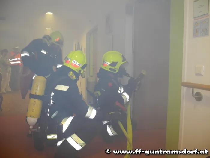 Angenommen wurde ein Brand in einem der Zimmer im Nordflügel des Objektes im ersten Obergeschoss mit einer eingeschlossenen Person. Mittels Nebelmaschine wurde der Brandrauch im Zimmer simuliert, welcher in kürzester Zeit den Rauchmelder im betroffenen Zimmer auslöste. Unmittelbar nach der Auslösung wurde die FF Guntramsdorf durch den Übungsleiter „alarmiert“.
