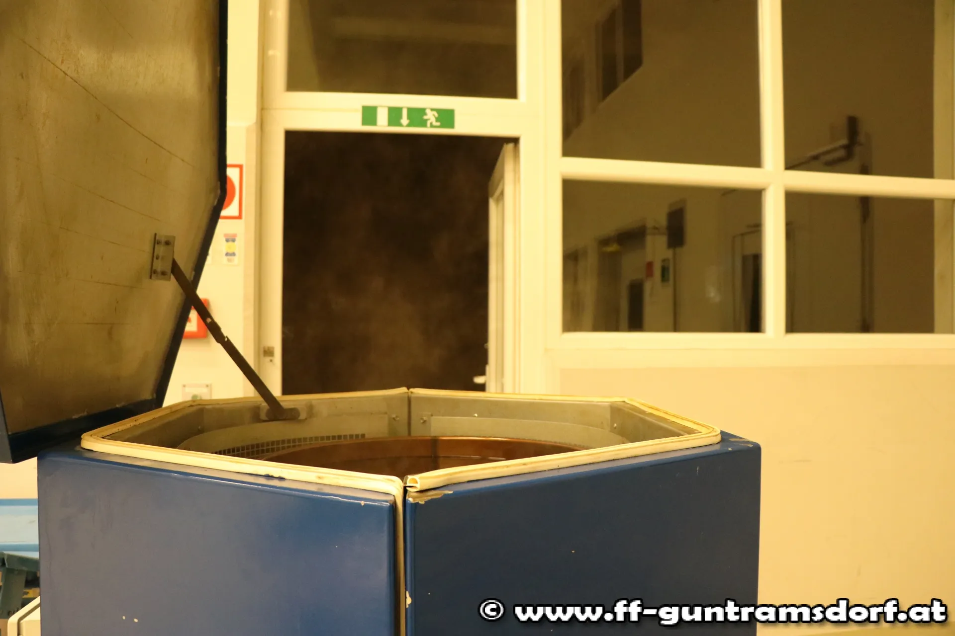 Bei der Erkundung stellte der Einsatzleiter fest, dass die Halle, in welcher ein Rauchmelder ausgelöst hatte, bereits verraucht war. Sofort wurde ein Atemschutztrupp zur genauen Lageerkundung losgeschickt. Dieser stellte fest, dass aus einem Erwärmungsgerät Rauch austrat. Inzwischen wurden ein Belüftungsgerät, sowie ein Entlüfter in Stellung gebracht um die Halle vom Rauch zu befreien. Durch den Brandschutzbeauftragten wurde der Inhalt als Vaseline deklariert, welches gesundheitlich ungefährlich ist. Dieses wurde aus noch ungeklärter Ursache zu heiß. Durch das öffnen des Deckels und das Abschalten des Gerätes konnte die Temperatur rasch reduziert werden.