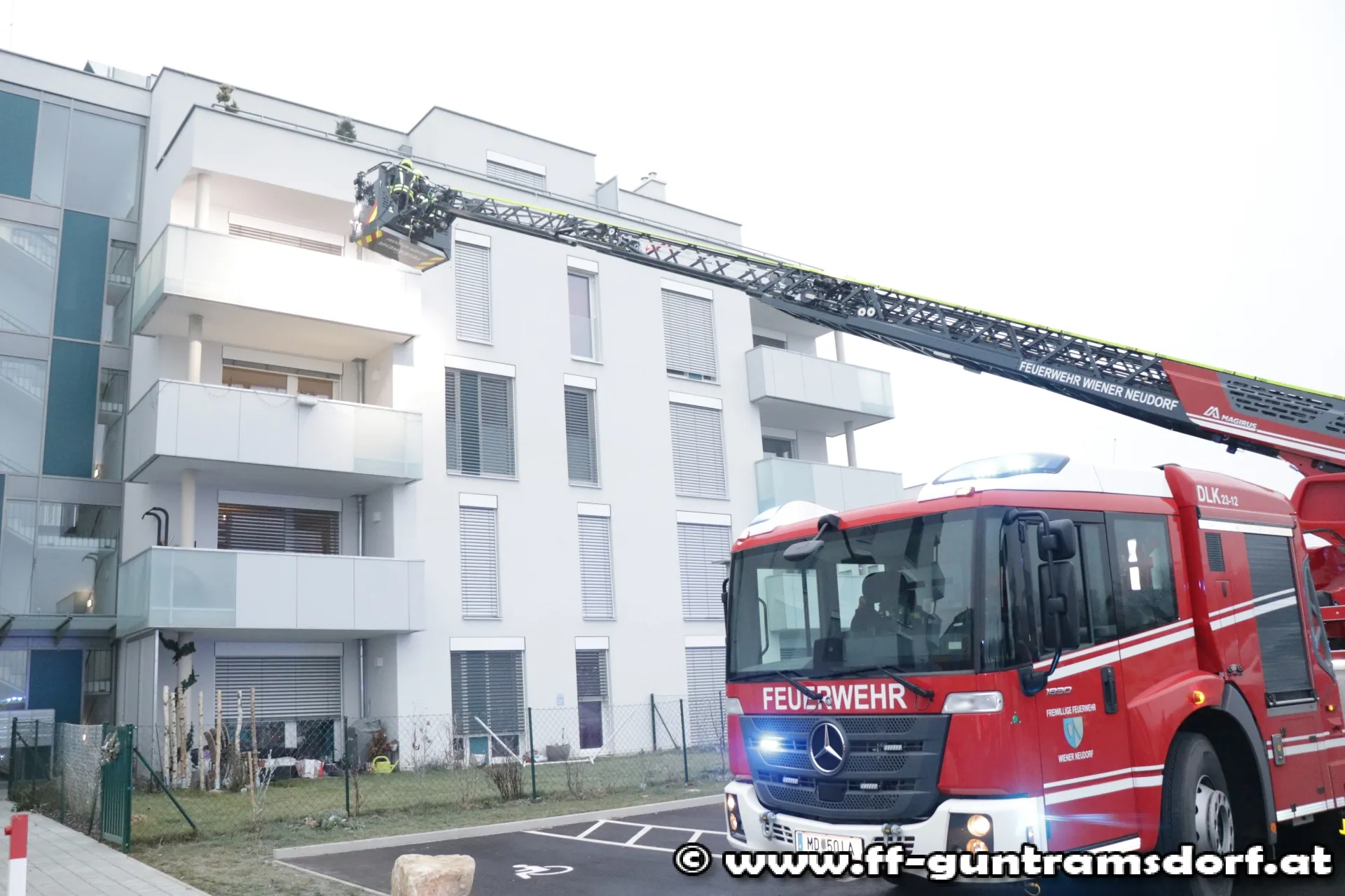 Beim Eintreffen am Einsatzort erkundete der Einsatzleiter sofort die Lage und konnte weder im Stiegenhaus Brandgeruch, noch von außen einen Brand wahrnehmen. Daher wurde beschlossen, die Türe nicht gewaltsam zu öffnen, sondern zur weiteren Erkundung von außen die Drehleiter Wr. Neudorf (welche ebenfalls mitalarmiert wurde) heranzuziehen. Während der Kontrolle von außen mit Hilfe der Drehleiter, traf eine Angehörige der Besitzer am Einsatzort ein und ermöglichte den Zugang zur Wohnung. Offenbar wegen eines technischen Defekts dürfte ein Rauchmelder ausgelöst haben.