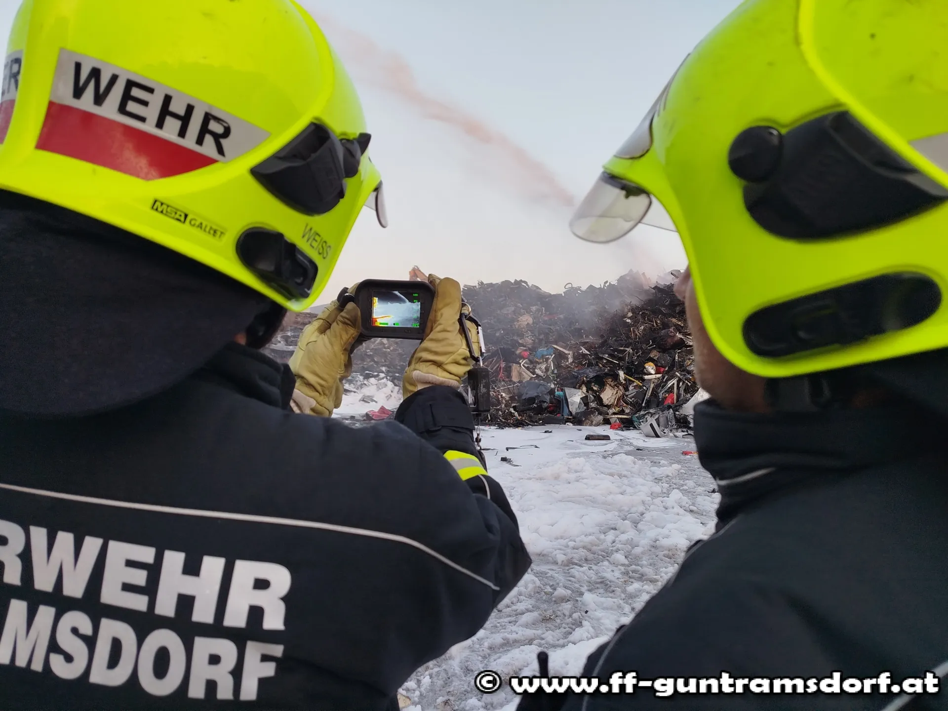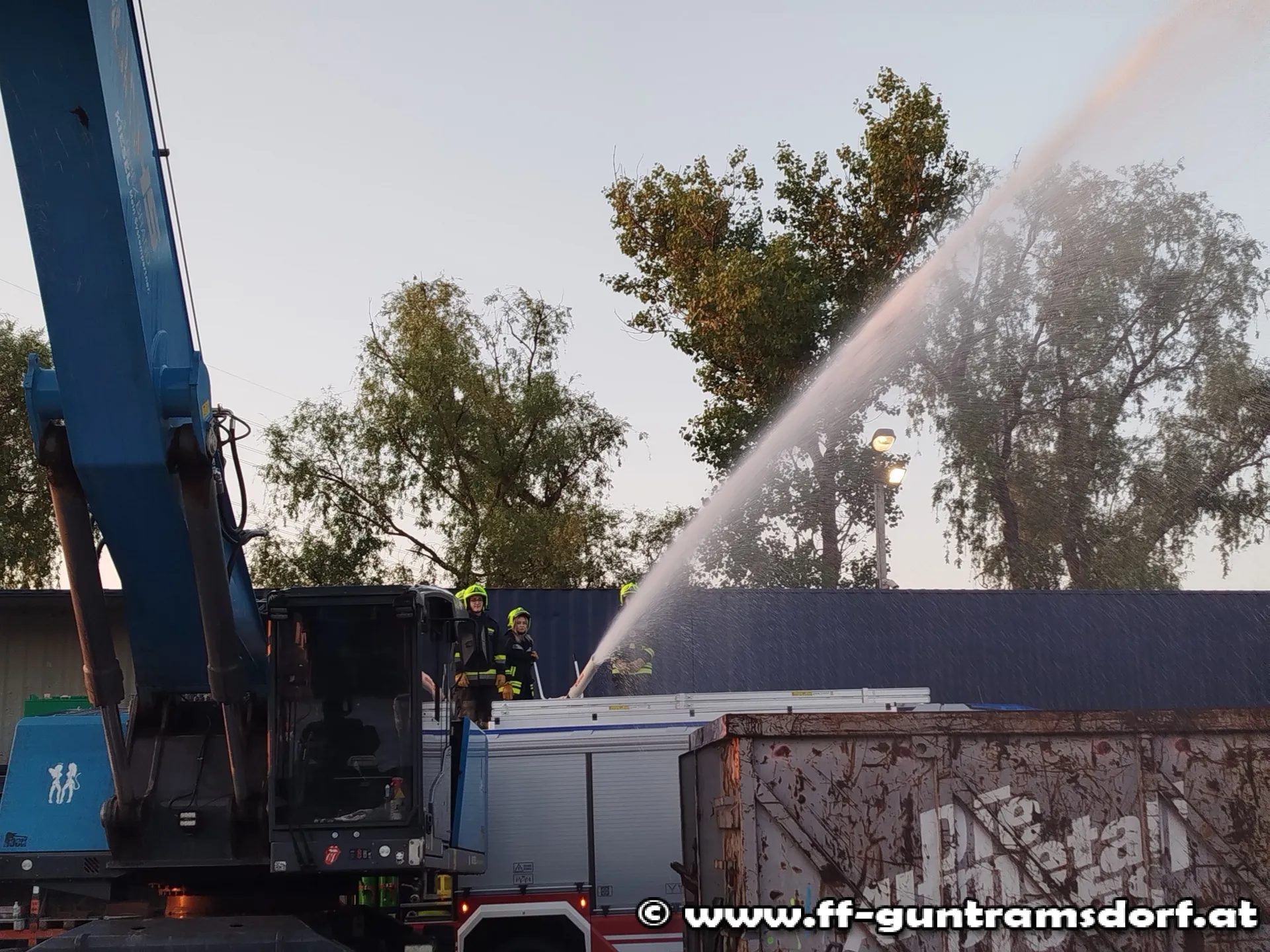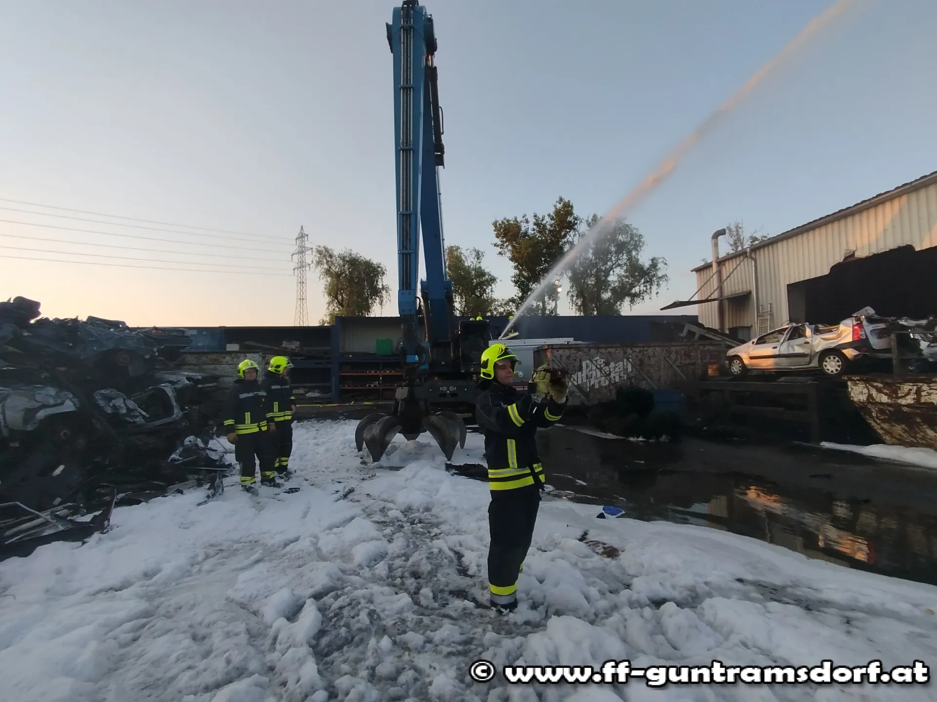 Um den in Brand geratenen Schrotthaufen zu kühlen und Glutnester zu bekämpfen, setzten die ausgerückten Guntramsdorfer Kräfte einen Wasserwerfer ein.