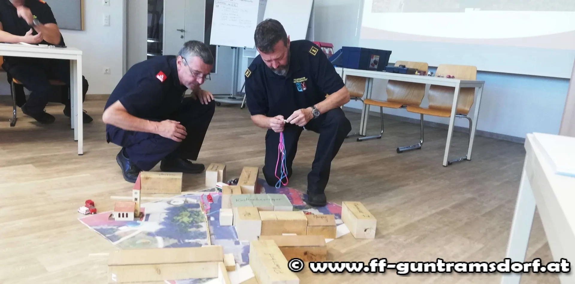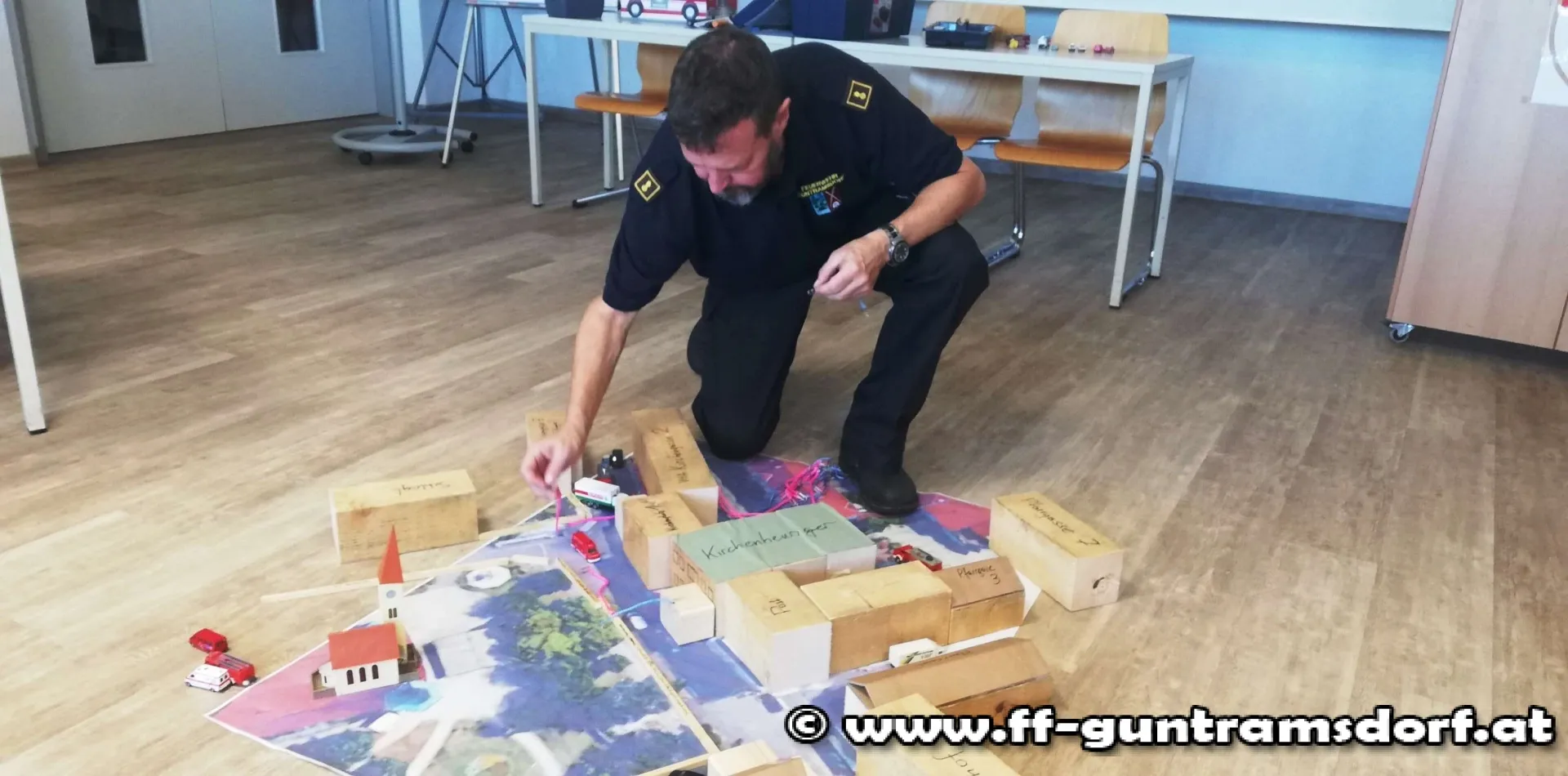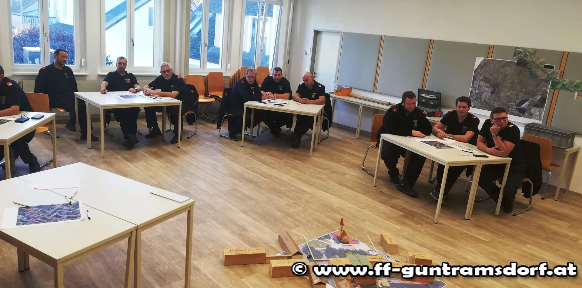Der Nachmittag bestand anschließend aus zwei Planspielen, die von FT André Grossberger und EBR Robert Moser akribisch vorbereitet und den Teilnehmern vorgestellt wurden. In Gruppen musste zuerst ein Brandereignis im Ortskern von Guntramsdorf mit all seinen Herausforderungen gemeistert werden.
