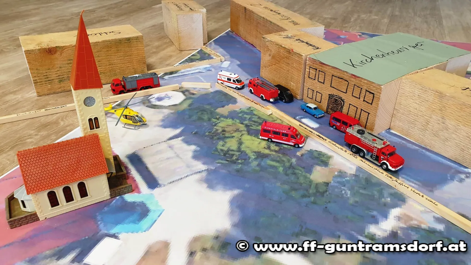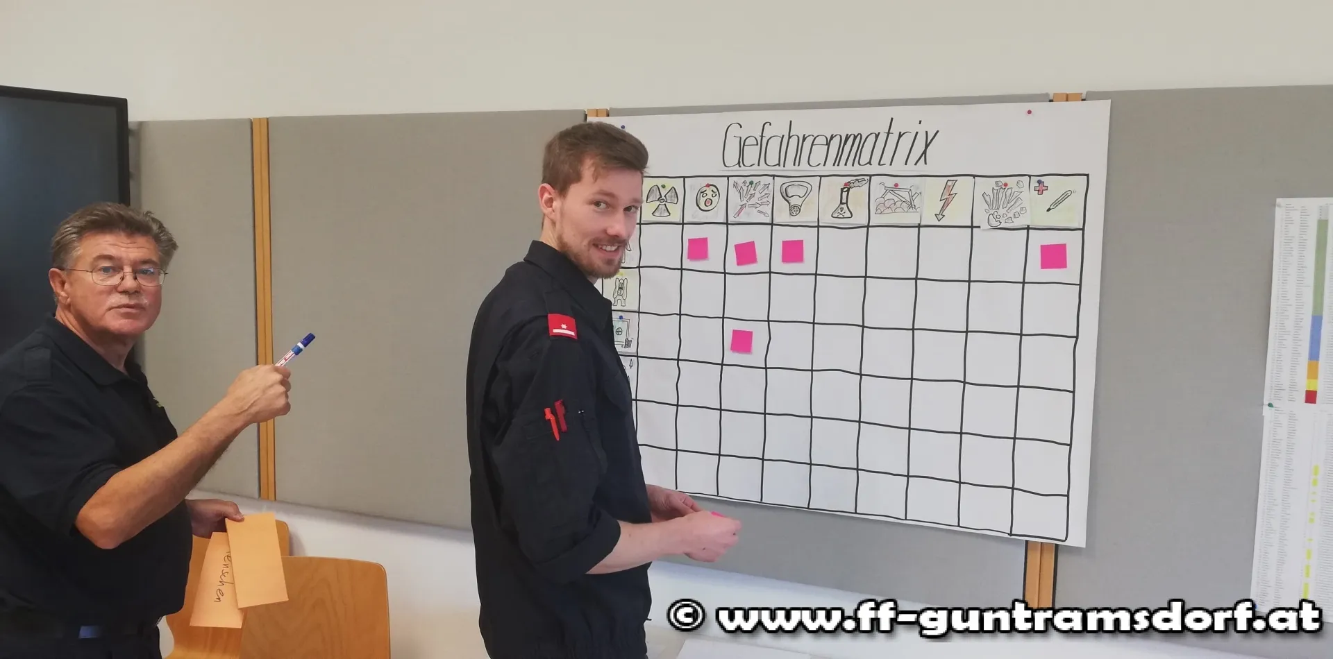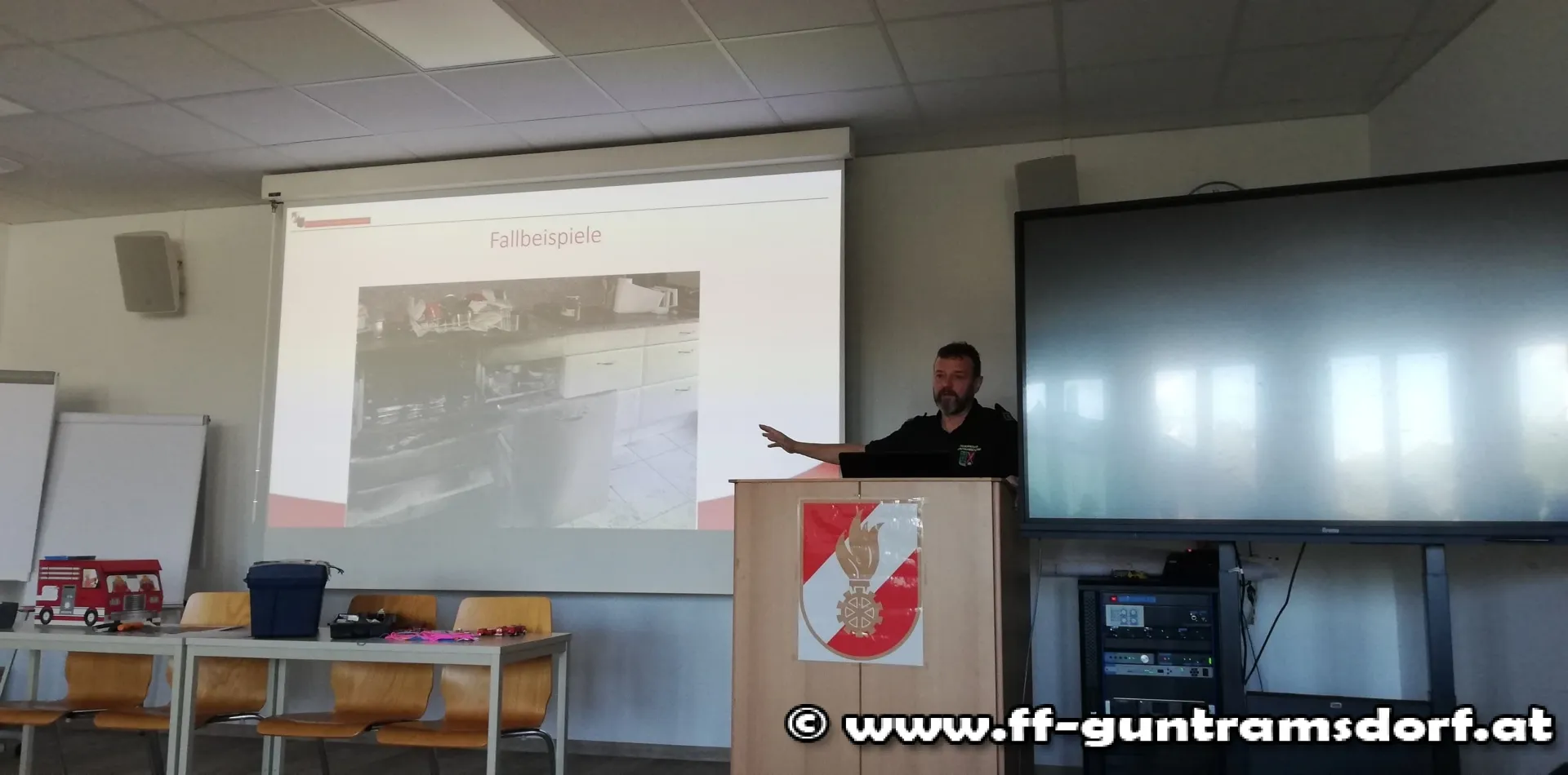 Der Nachmittag bestand anschließend aus zwei Planspielen, die von FT André Grossberger und EBR Robert Moser akribisch vorbereitet und den Teilnehmern vorgestellt wurden. In Gruppen musste zuerst ein Brandereignis im Ortskern von Guntramsdorf mit all seinen Herausforderungen gemeistert werden.