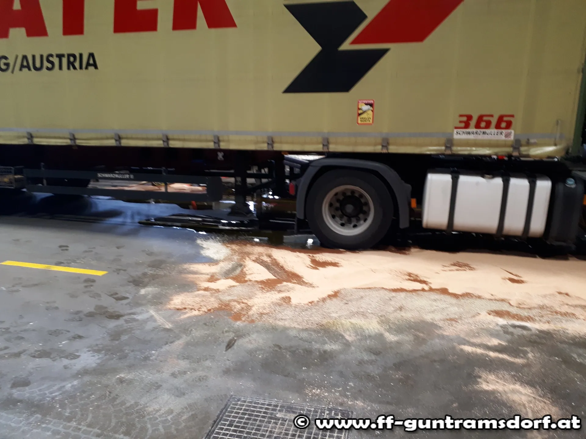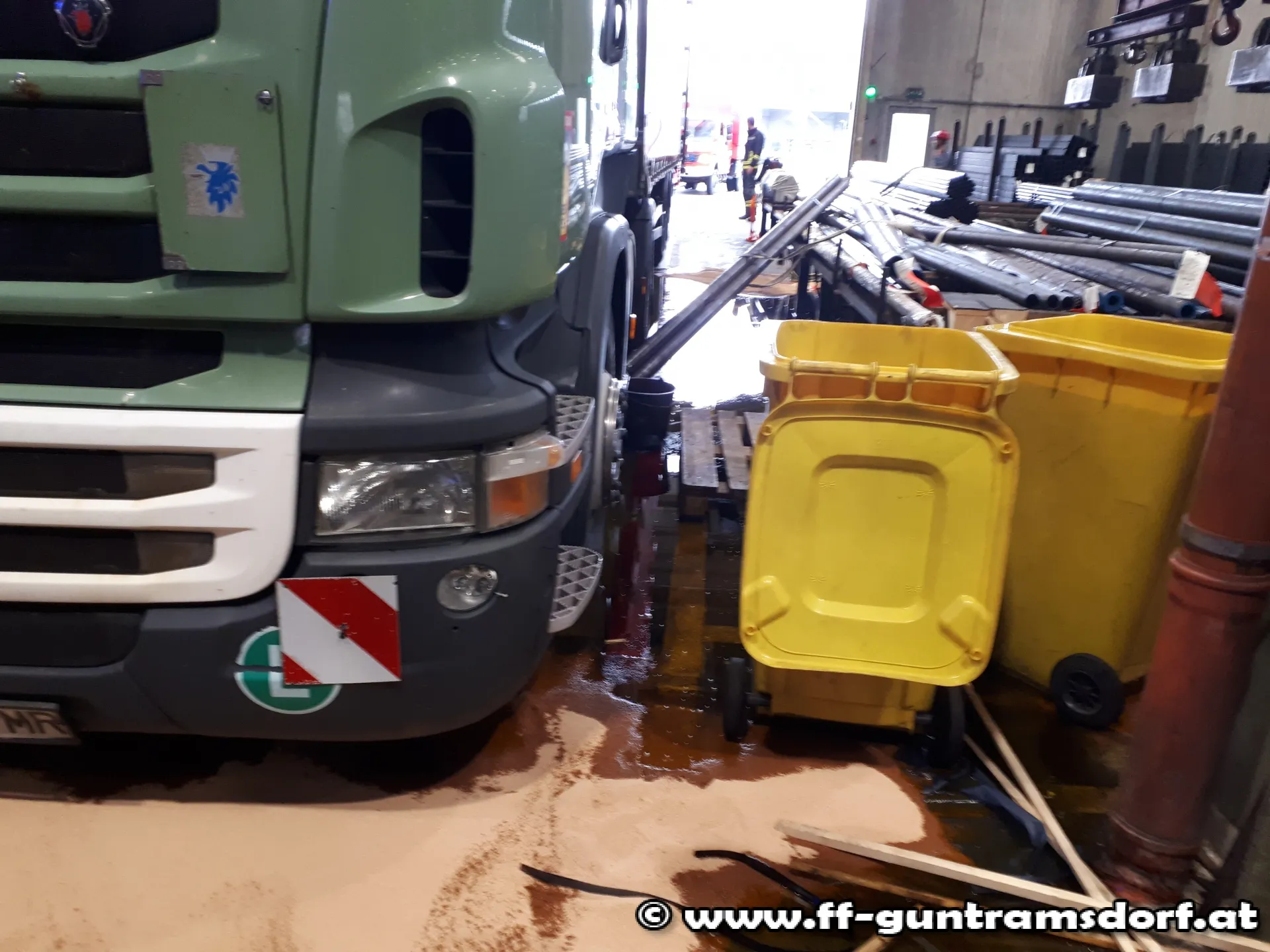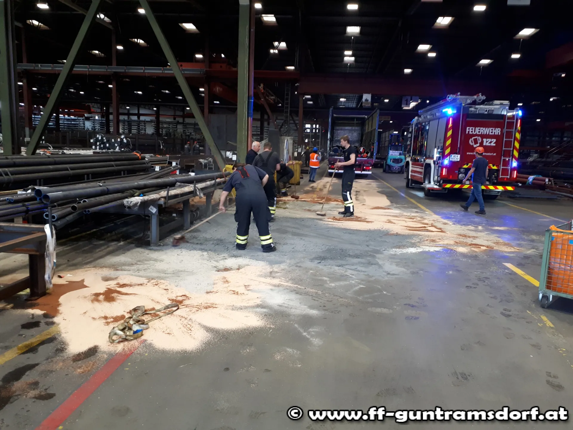 Um 10:50 Uhr wurde die Feuerwehr zu einem Dieselaustritt auf einem Firmengelände alarmiert. Bei Eintreffen der Kräfte stellte sich heraus, dass bei Verladearbeiten in einer Halle der Tank eines LKW´s von Stahlrohren perforiert worden war und dadurch ca. 600 Liter Diesel ausgeflossen waren. Von Betriebsangehörigen wurde zwischenzeitlich bereits versucht eine unkontrollierte Ausbreitung des Kraftstoffs durch Abschöpfen und Aufbringen von Bindemittel zu verhindern.