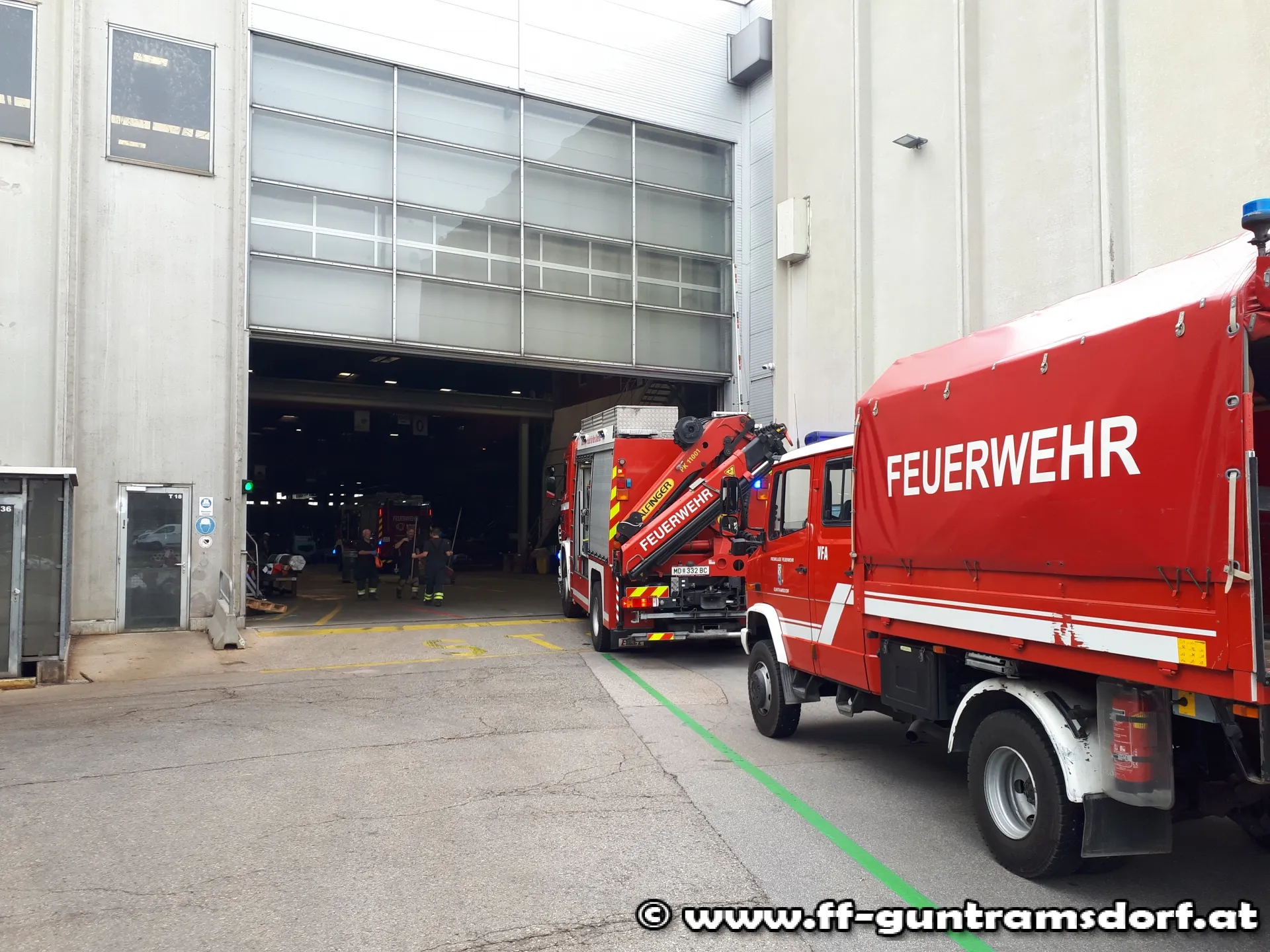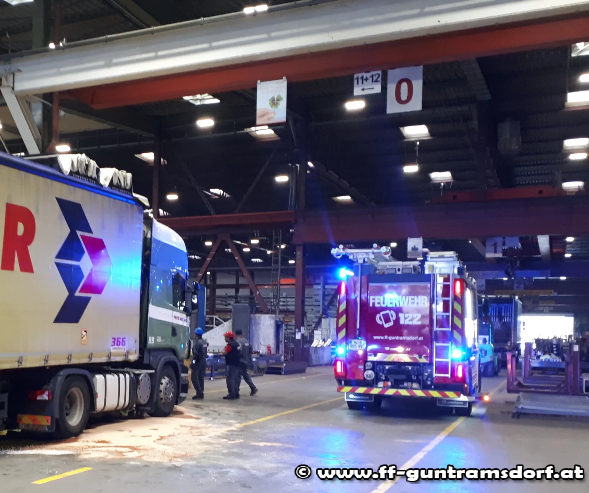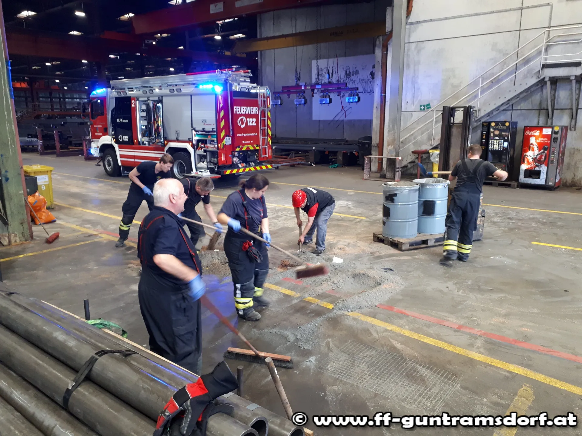 Um 10:50 Uhr wurde die Feuerwehr zu einem Dieselaustritt auf einem Firmengelände alarmiert. Bei Eintreffen der Kräfte stellte sich heraus, dass bei Verladearbeiten in einer Halle der Tank eines LKW´s von Stahlrohren perforiert worden war und dadurch ca. 600 Liter Diesel ausgeflossen waren. Von Betriebsangehörigen wurde zwischenzeitlich bereits versucht eine unkontrollierte Ausbreitung des Kraftstoffs durch Abschöpfen und Aufbringen von Bindemittel zu verhindern.