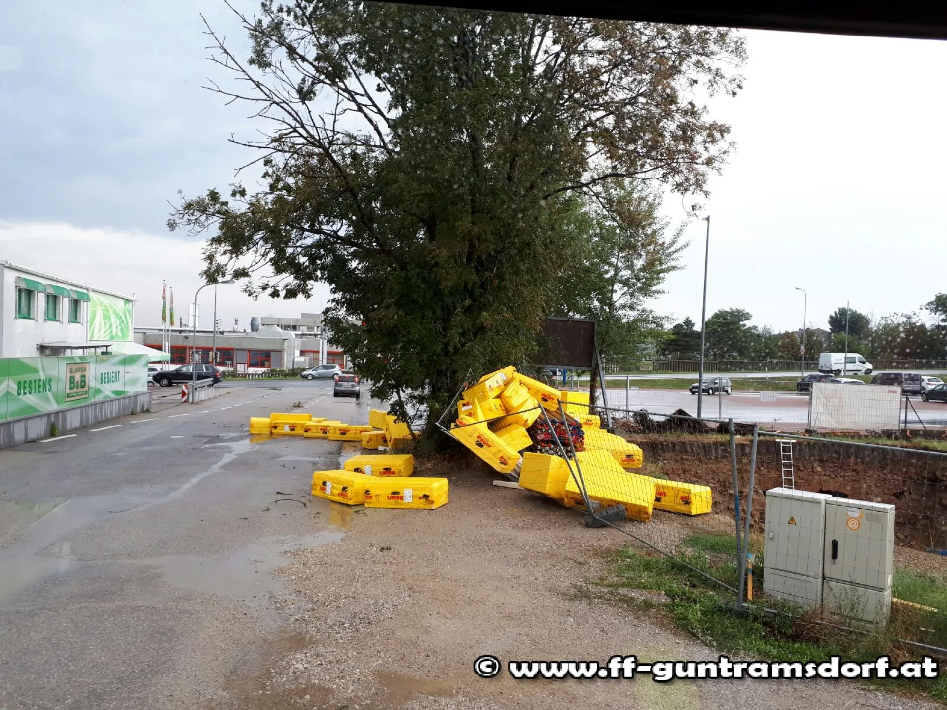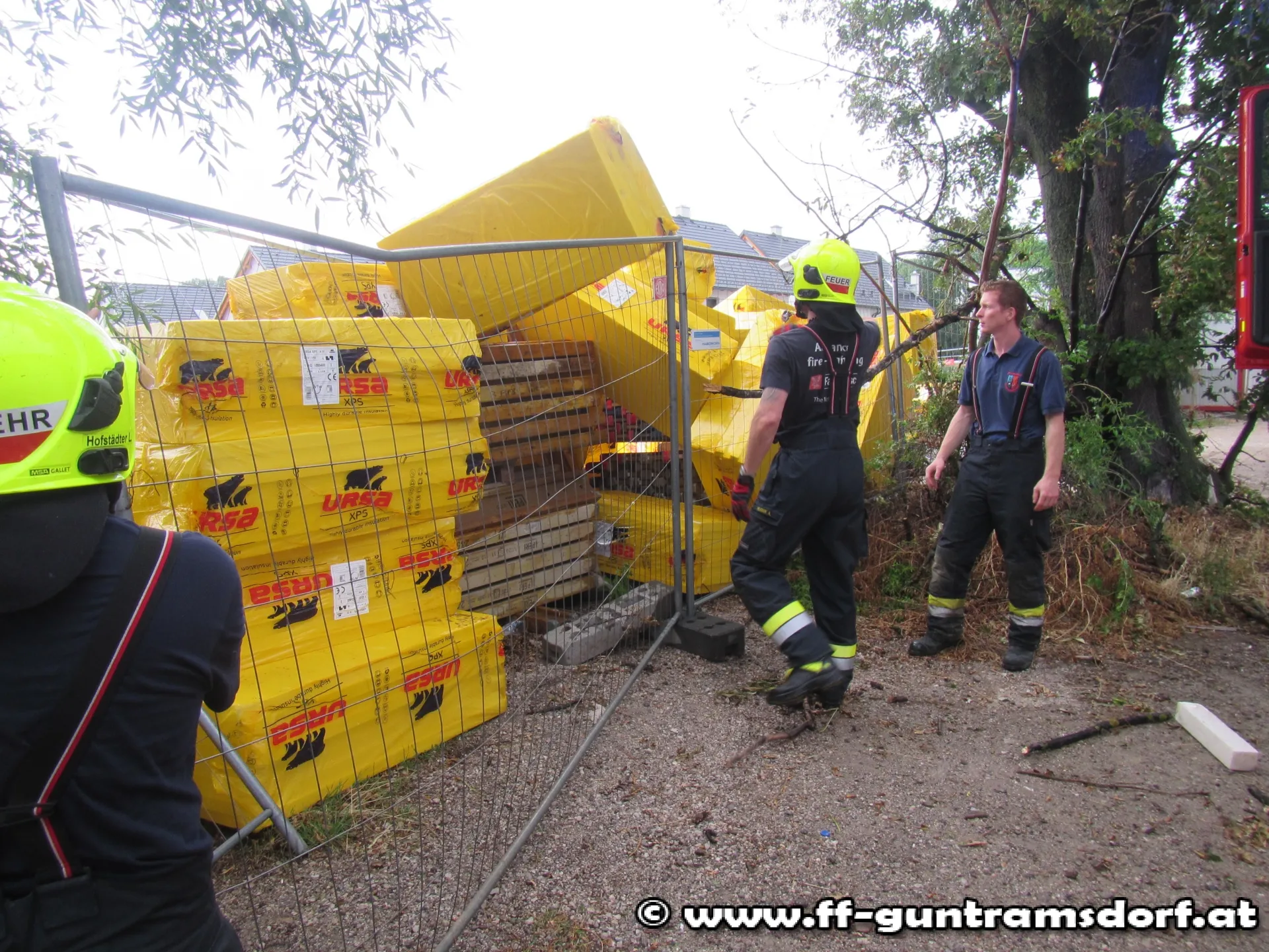 Noch während der Arbeiten am Ozeanteichgelände, bekamen wir über Funk eine weitere Einsatzmeldung über einen Sturmschaden in der Kammeringstraße. Ein Bauzaun war umgestürzt und Styroporteile hatten sich auf der Fahrbahn veteilt. Hierzu rückte die im Feuerwehrhaus verbliebene Mannschaft mit Tank 1 aus. Nachdem der Einsatz am Ozean abgearbeitet war, fuhren dann auch diese Kräfte den neuen Einatzort an.