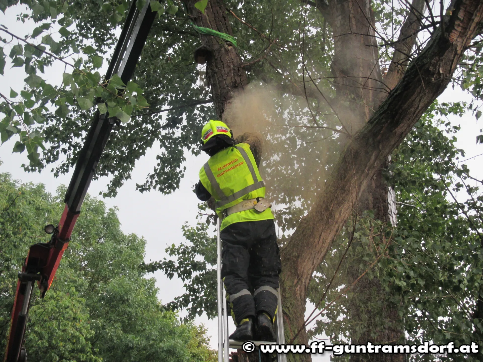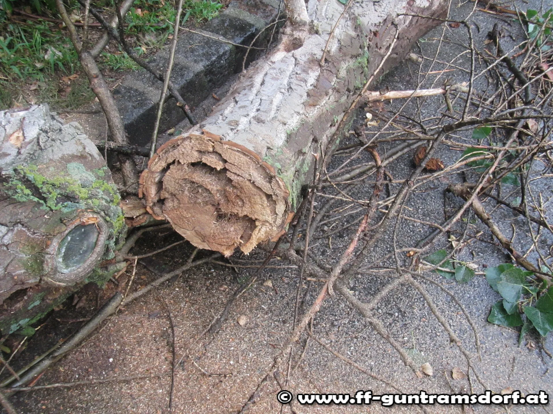 Am ursprünglichen Einsatzort angekommen, stellte sich heraus, dass ein großer Ast von einem am Teichgelände stehenden Baum abgebrochen und auf die Fahrbahn gestürzt war. Der Ast wurde mittels Motorkettensäge zerteilt und anschließend gesichert im Grünstreifen abgelegt. Da weitere Äste abzubrechen drohten, entschied der Einsatzleiter auch diese zu entfernen. Dazu wurde mittels Kran des SRF der Ast gesichert und anschließend abgeschnitten.
