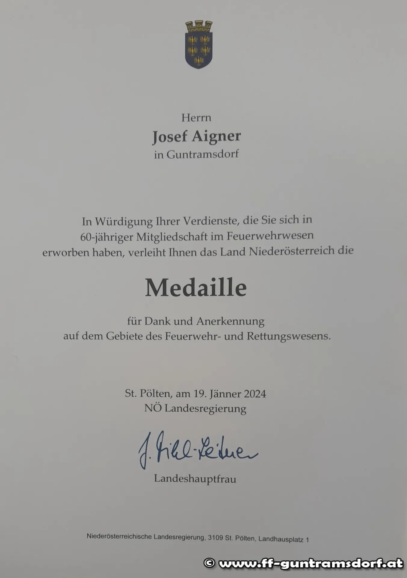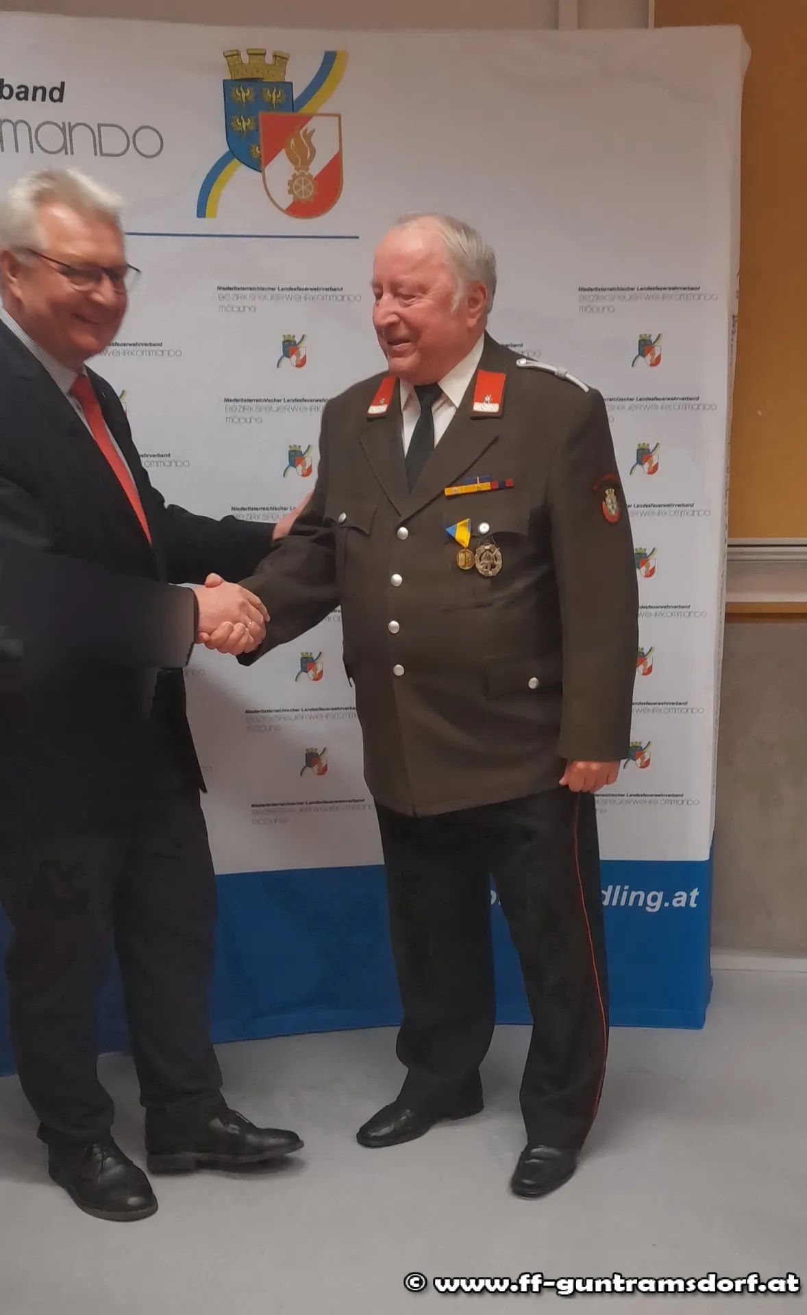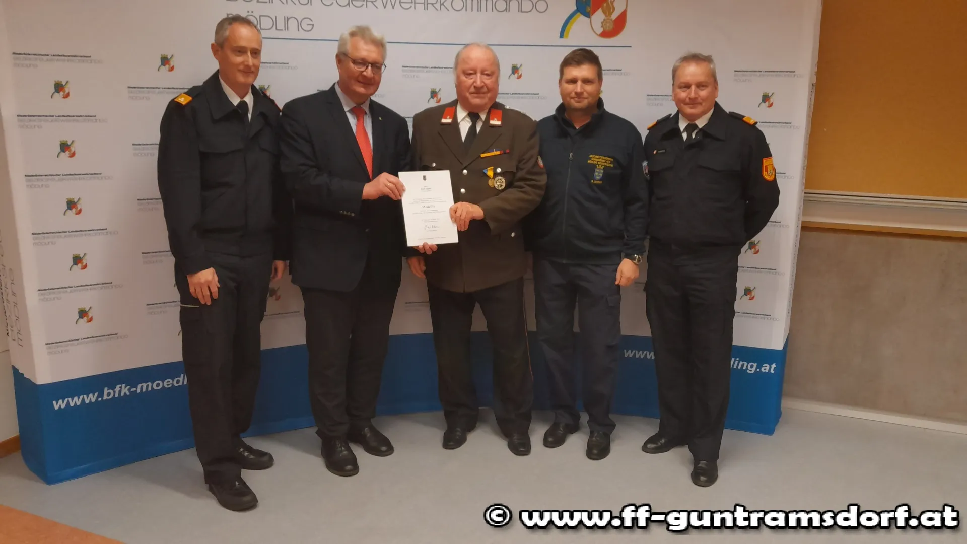 Traditionellerweise werden beim Bezirksfeuerwehrtag, der meist im Frühjahr stattfindet, verdiente Feuerwehrmitglieder ausgezeichnet bzw. geehrt. An alle jene, die heuer nicht dabei sein konnten, wurden die Auszeichnungen nun nachgereicht. So u. a. auch an Josef Aigner – seit 1964 Mitglied der FF Guntramsdorf.