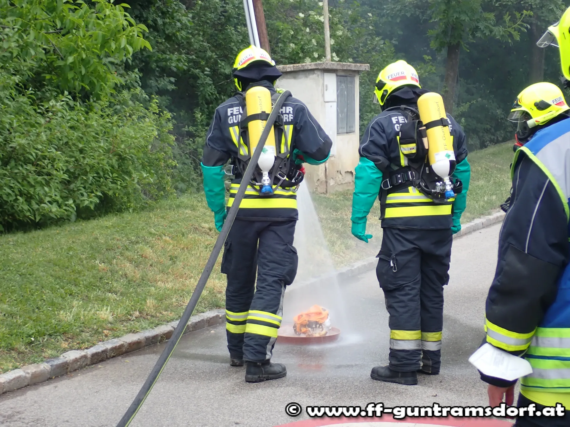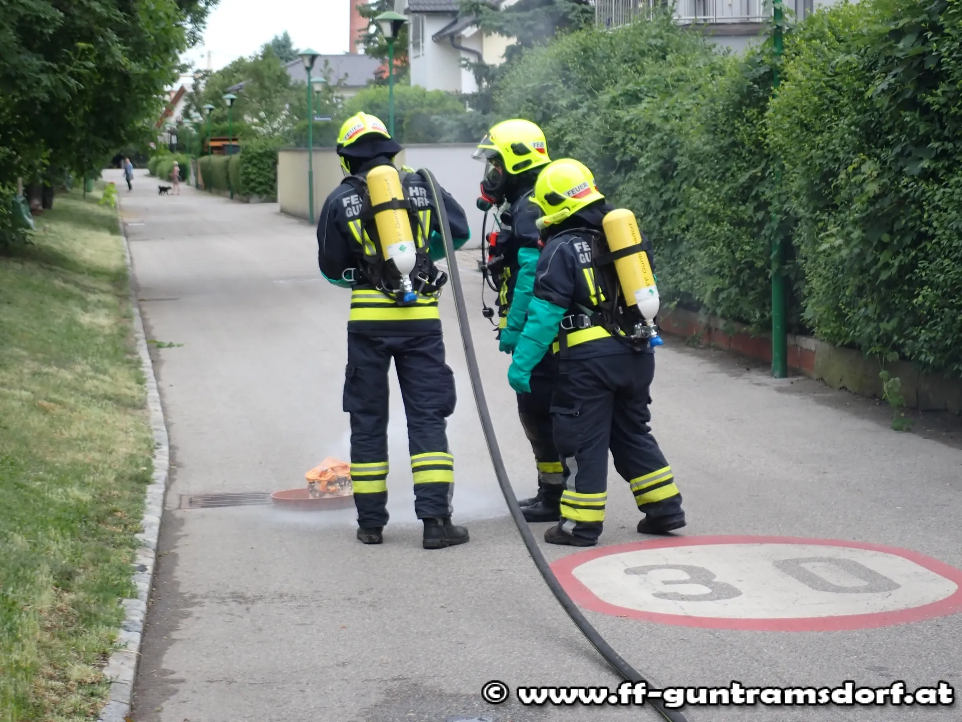 Im Freien liegende Chlortabletten hatten offenbar mit Regenwasser reagiert und sorgten für die Bildung von Chlorgasdämpfen. Da dieses Gas reizend bis ätzend wirken kann, mussten die eingesetzten Kräfte schweren Atemschutz und Chemieschutzhandschuhe anlegen. In Absprache mit dem ASB der Marktgemeinde Guntramsdorf wurden die Tabletten mit mehreren tausend Litern Wasser verdünnt und über das Abwassersystem unschädlich gemacht.