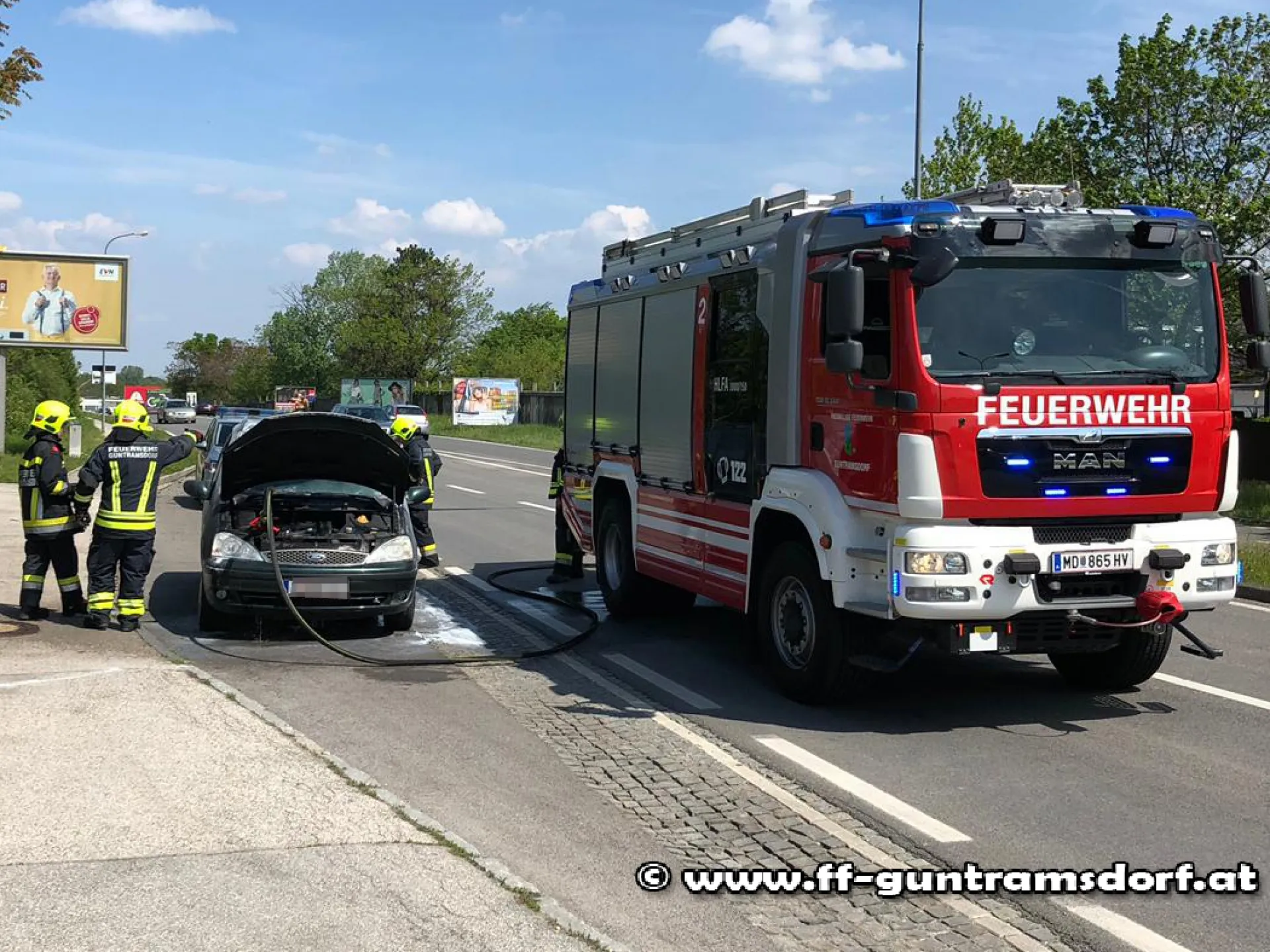 Am 2. Mai wurde die Feuerwehr Guntramsdorf mittels Sirene, Pager und Alarm-SMS zu einem Fahrzeugbrand auf der B17 in Alt-Guntramsdorf alarmiert.