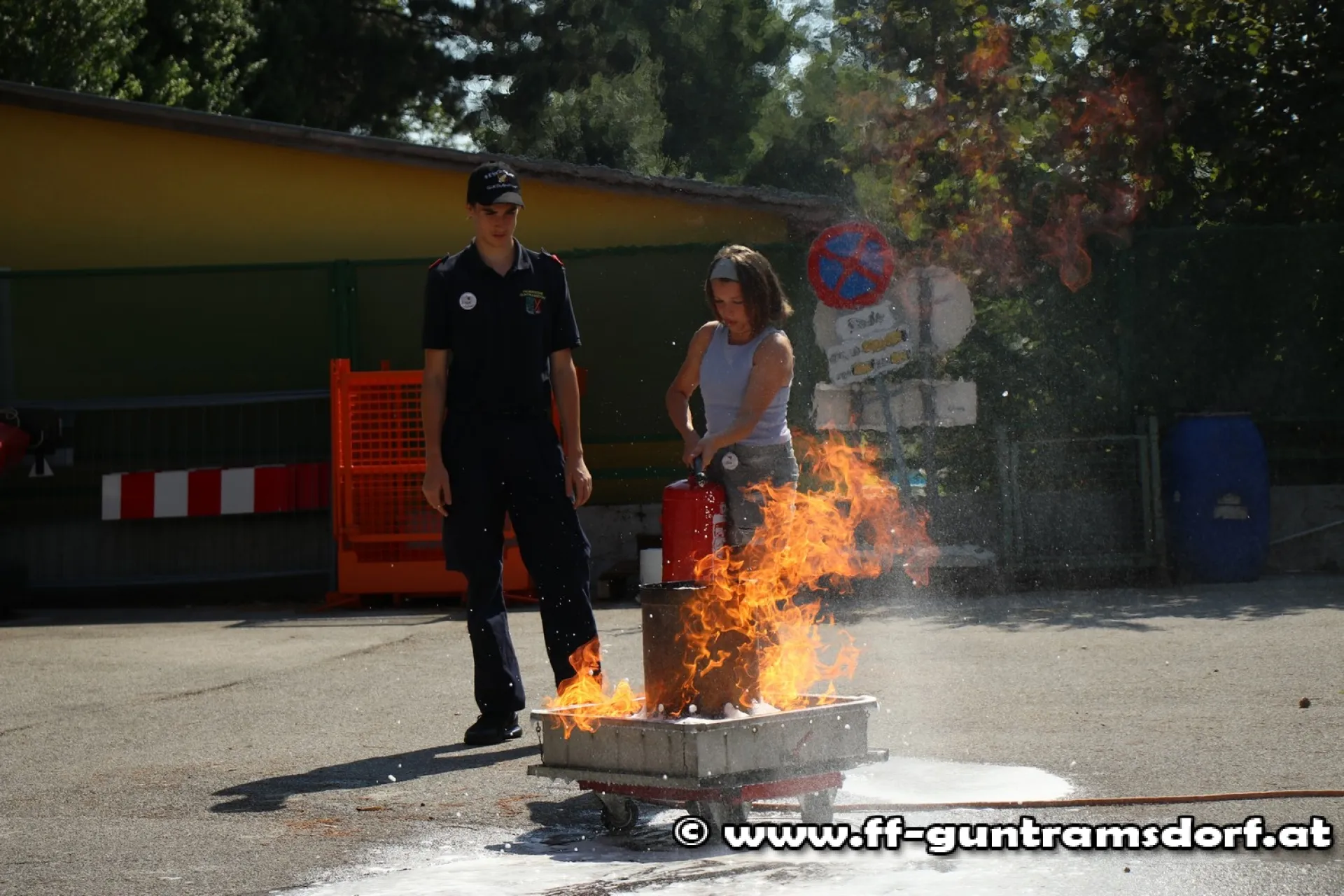 Natürlich durfte auch eine Löschübung nicht fehlen: Mit ebenso viel Respekt wie Abenteuerlust machten sich die Kids daran, einen (kontrollierten) Kleinbrand mit einem Handfeuerlöscher zu bekämpfen.