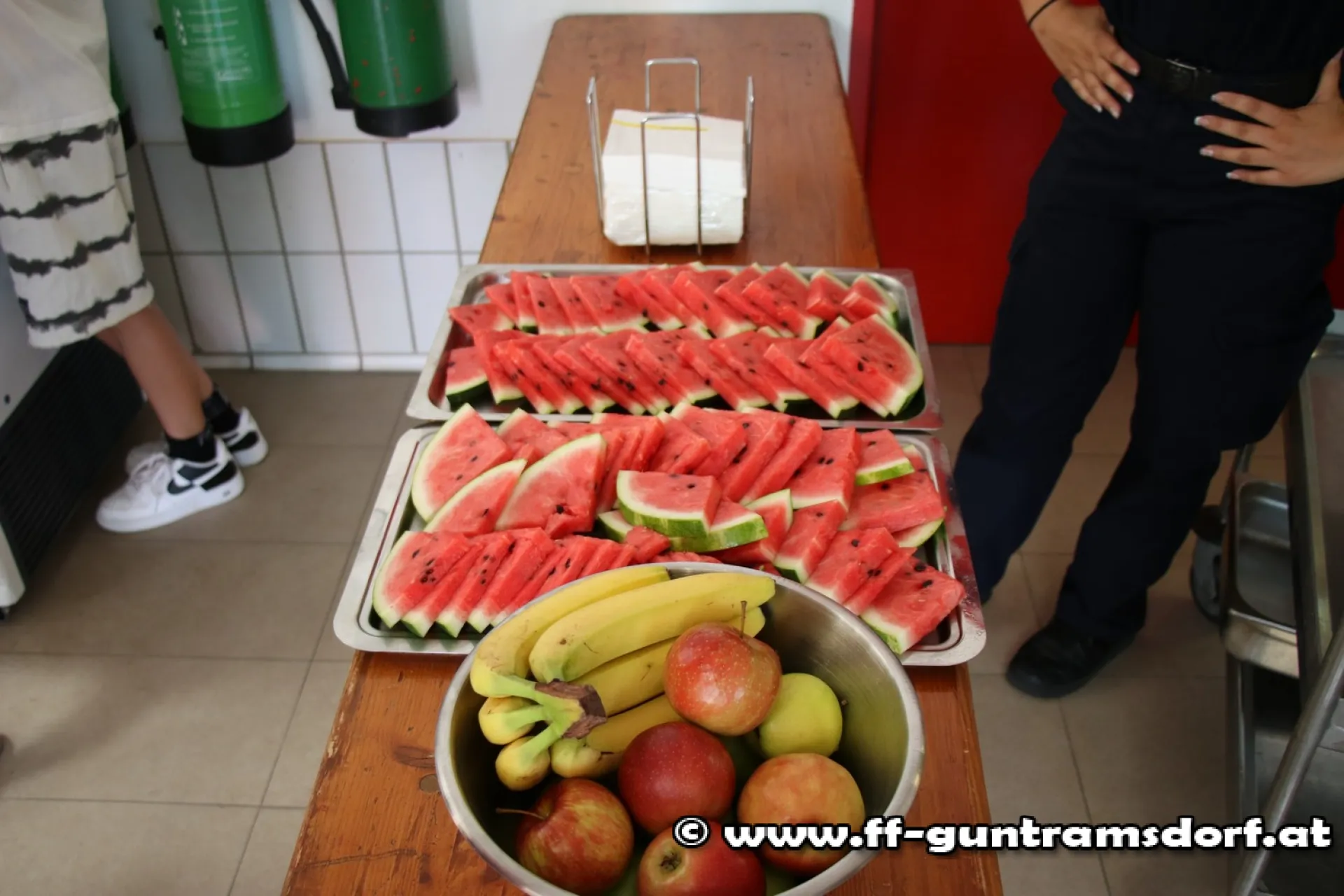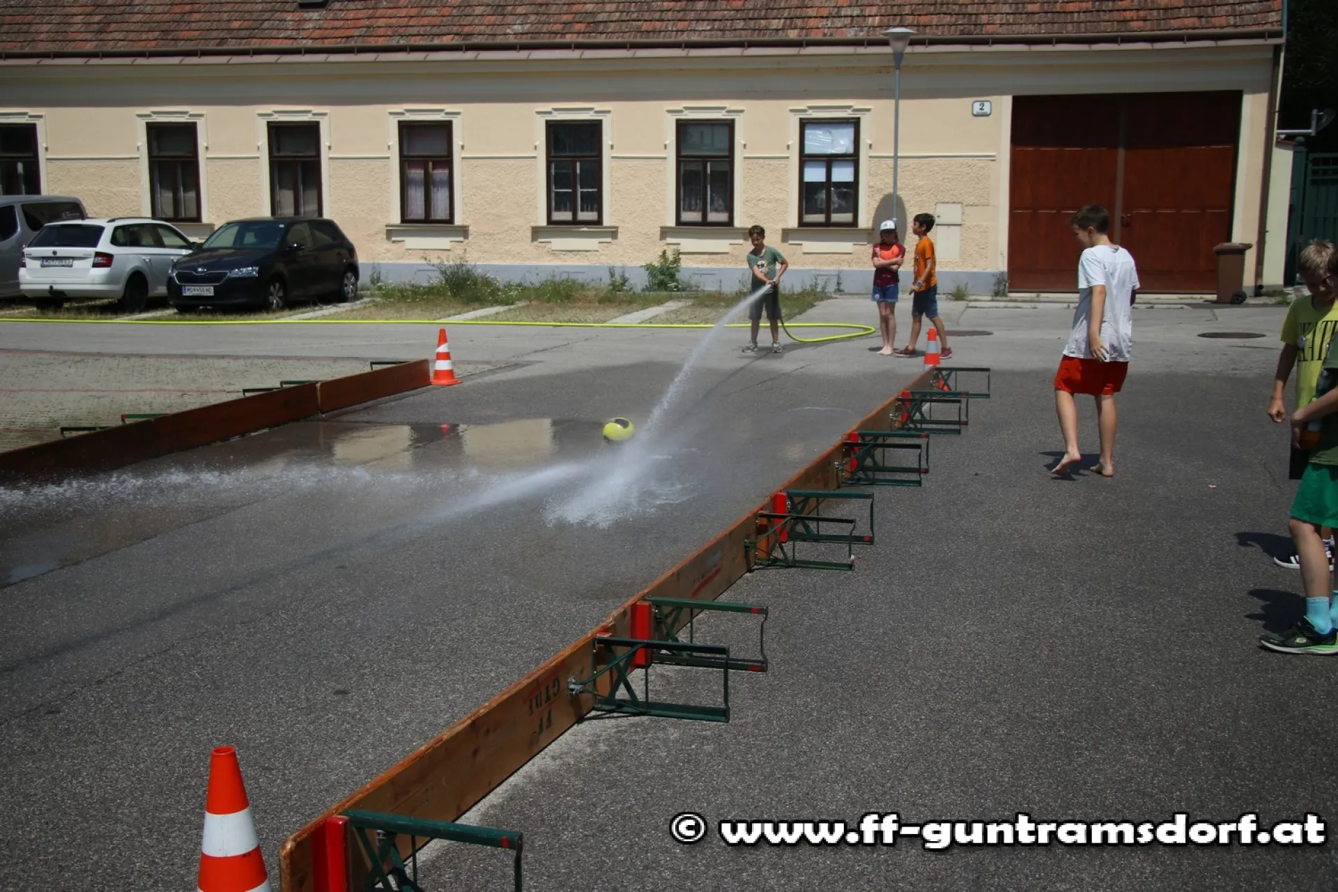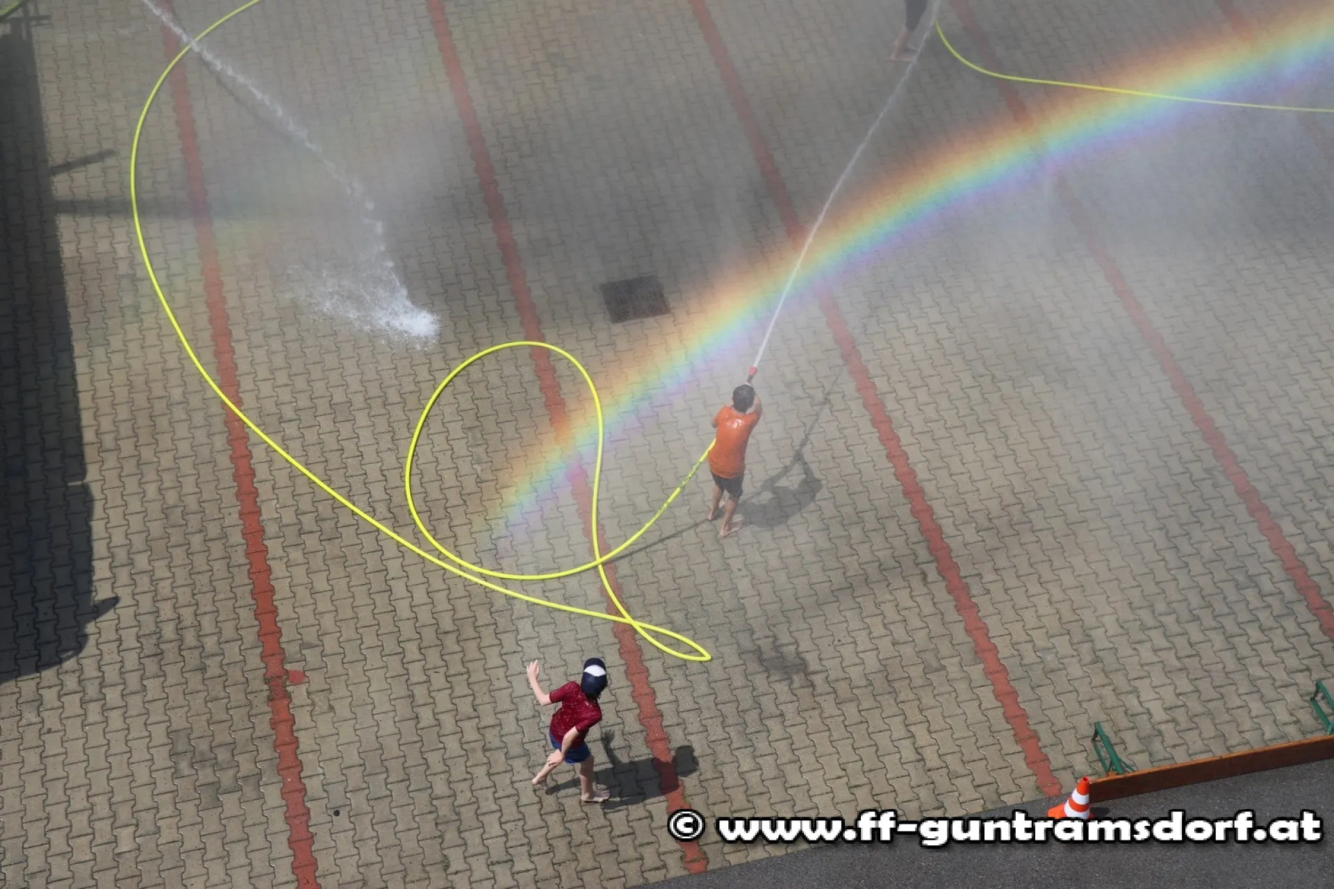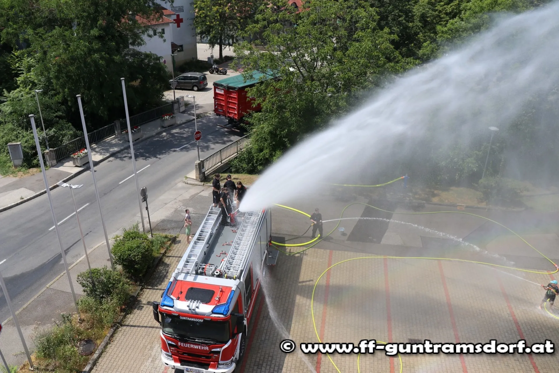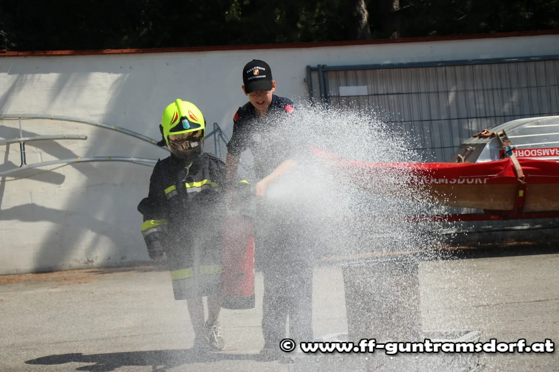 Nach dem Mittagessen wurde – bedingt durch einen realen Einsatz – die obligate „Wasserschlacht“ vorverlegt; angesichts der hochsommerlichen Temperaturen ein Riesenspaß! Dabei kam neben zwei Strahlrohren auch ein Wasserwerfer zu Einsatz.