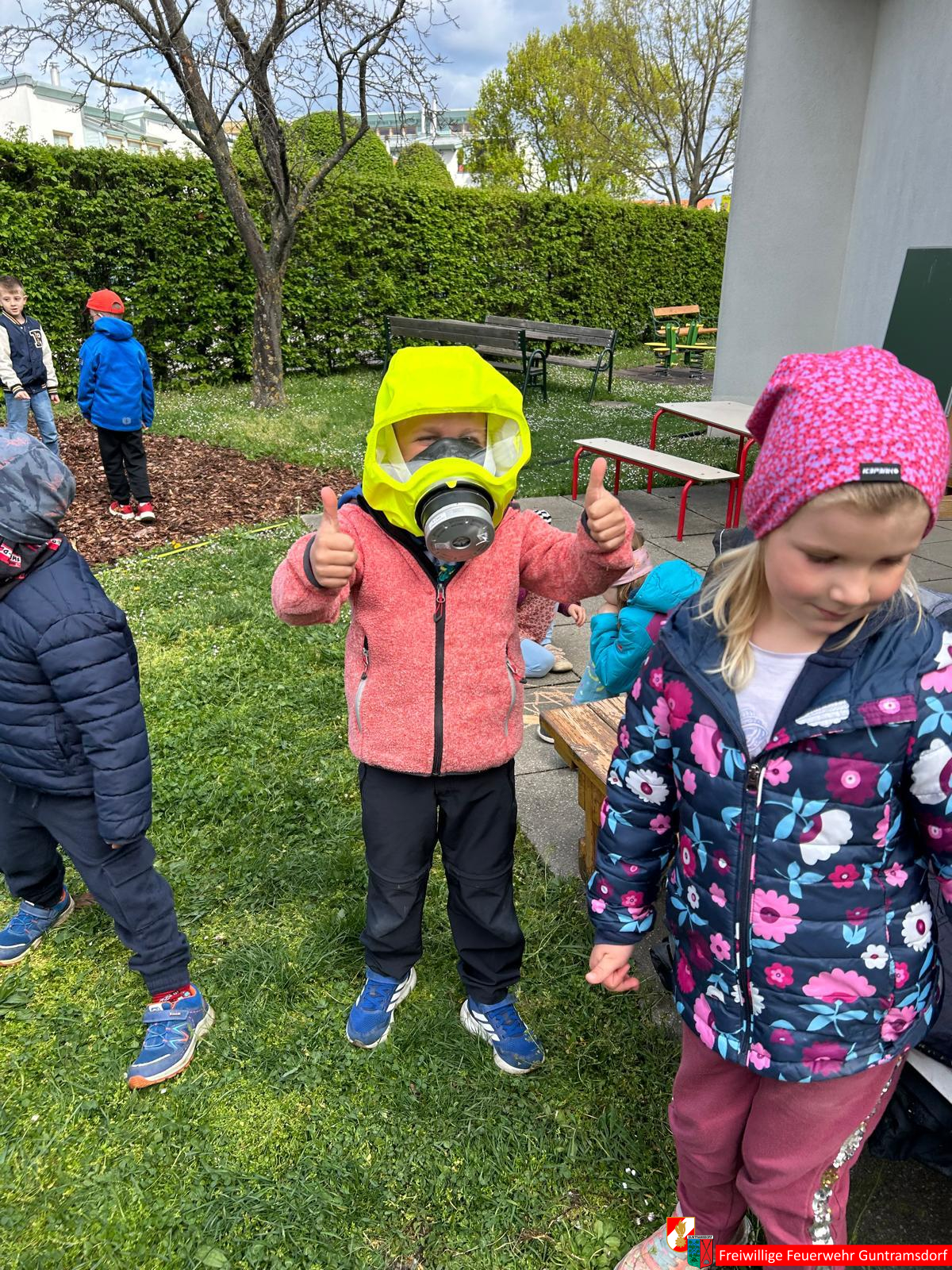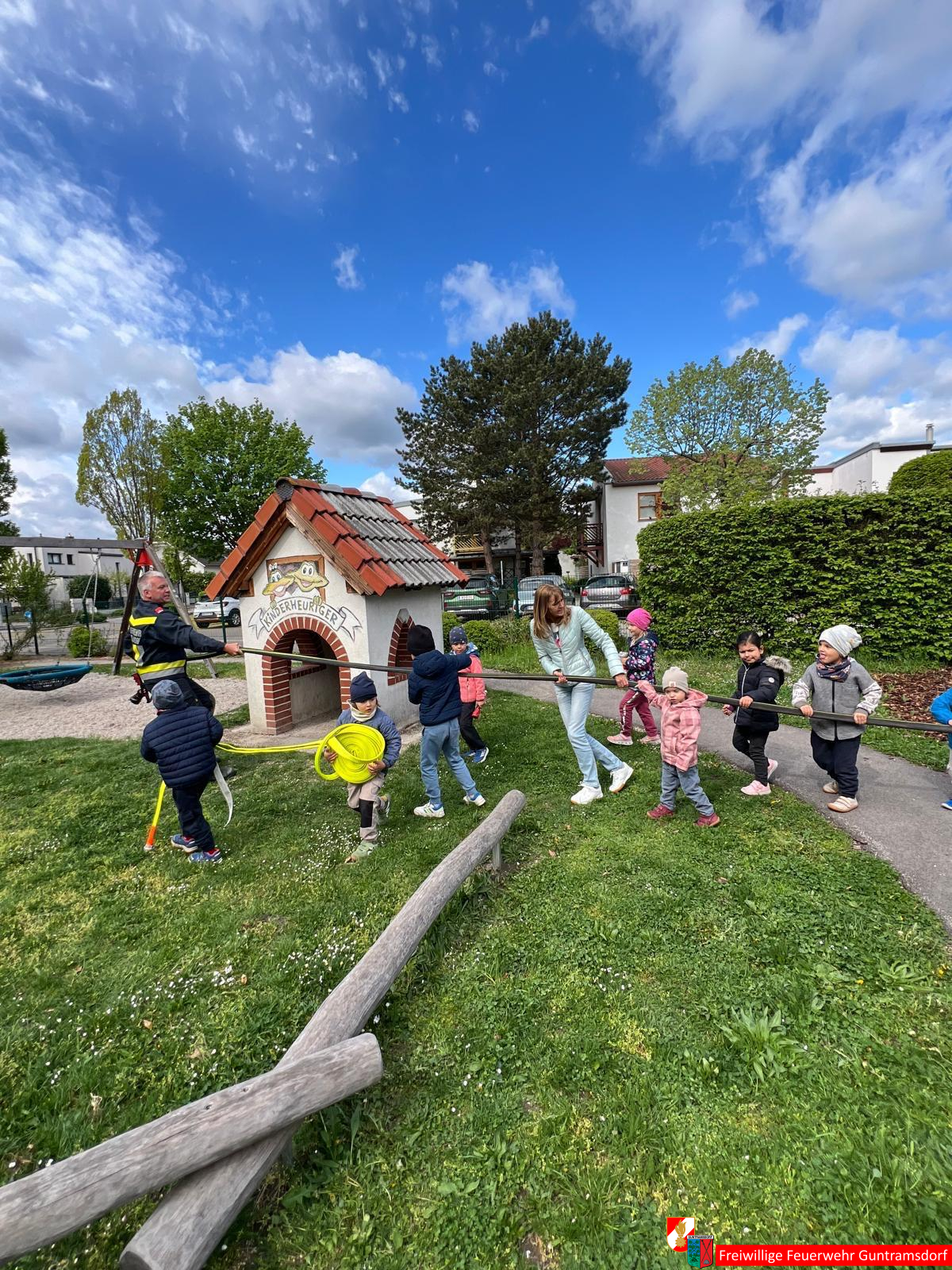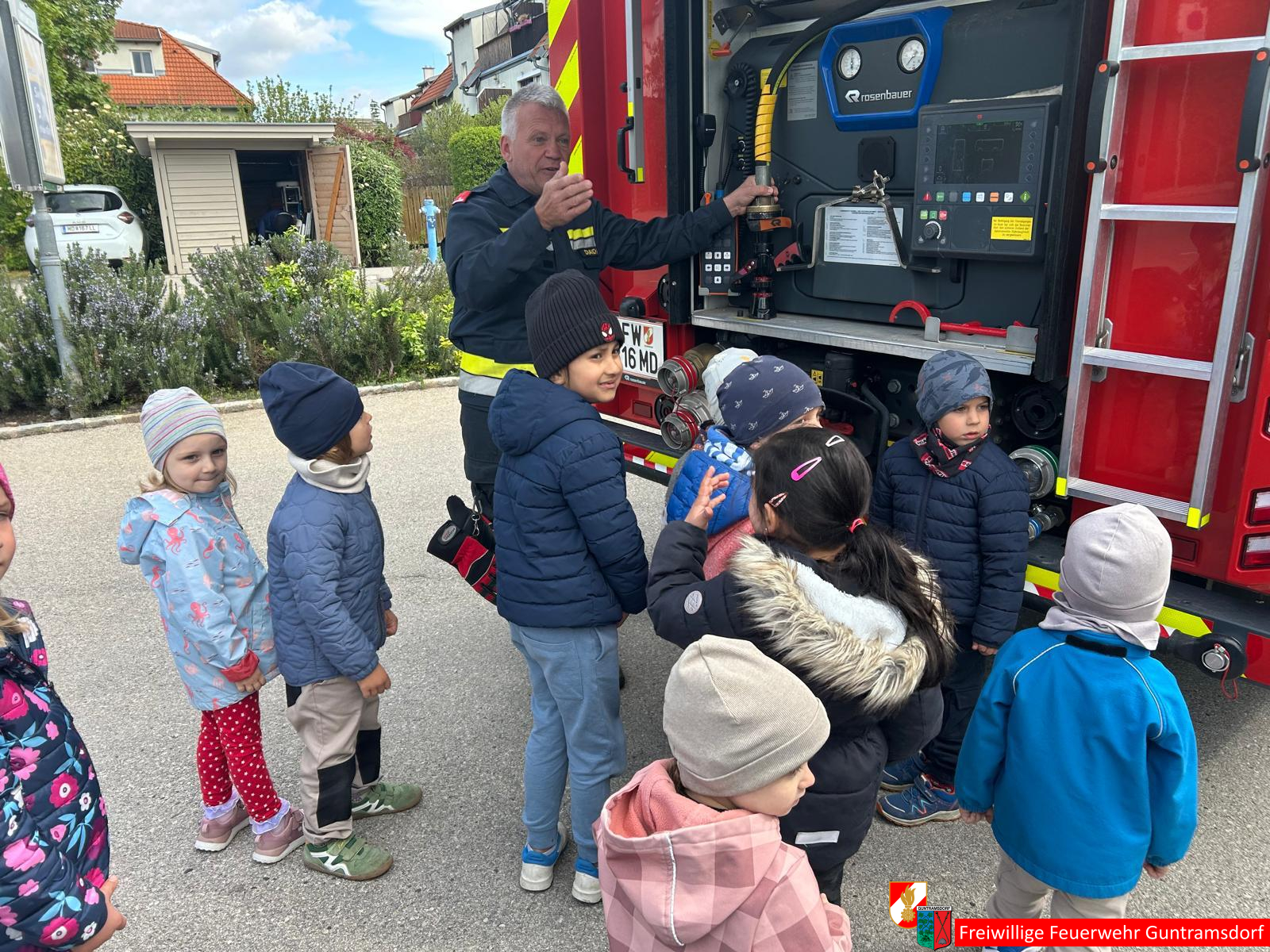 Nach Aufteilung der Kinder in Gruppen, galt es, mehrere Stationen zu absolvieren. Große Begeisterung rief bei den Kindern natürlich das große Feuerwehrauto, in das sie auch einsteigen durften, hervor. Auch um mögliche Ängste zu nehmen, wurde den Kindern gezeigt, wie ein voll ausgerüsteter Feuerwehrmann mit Schutzbekleidung und Atemschutzgerät aussieht. Lustig war auch die praktische Übung mit einem richtigen Schlauch.